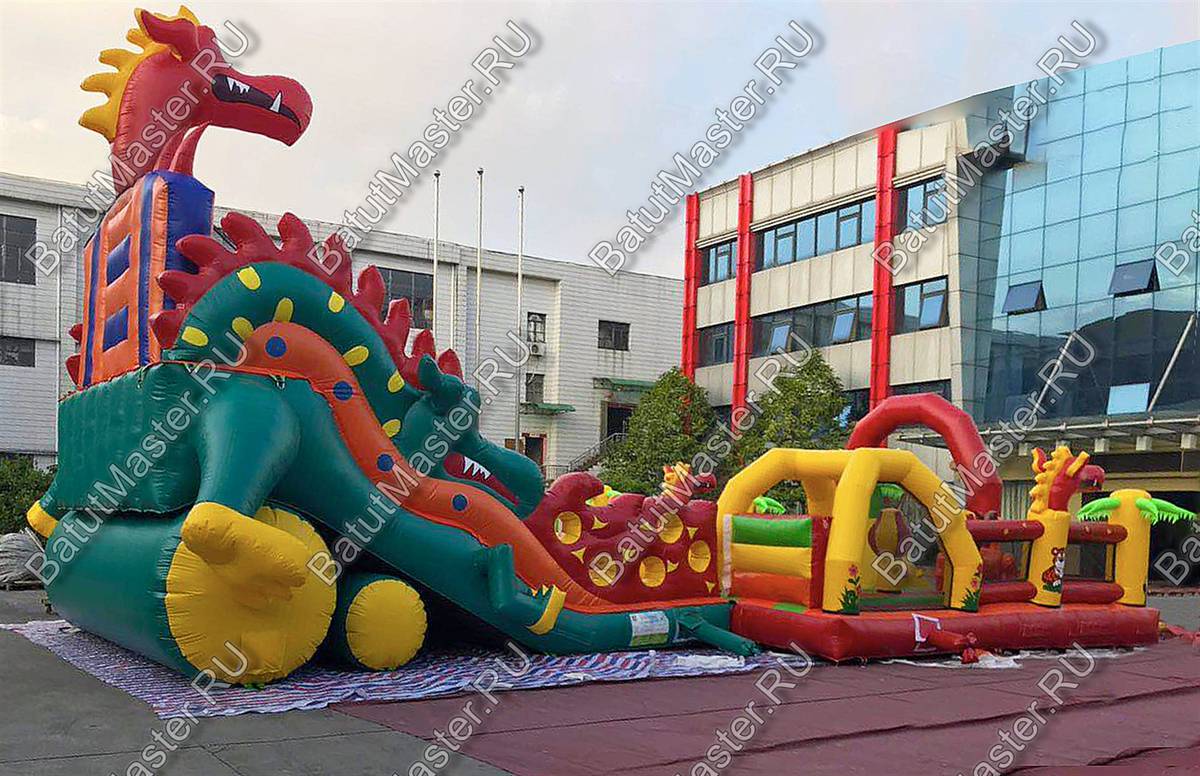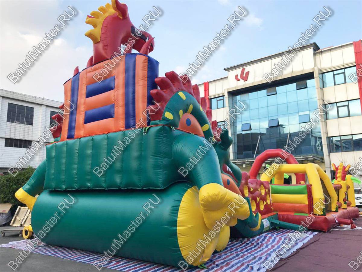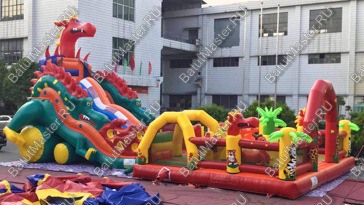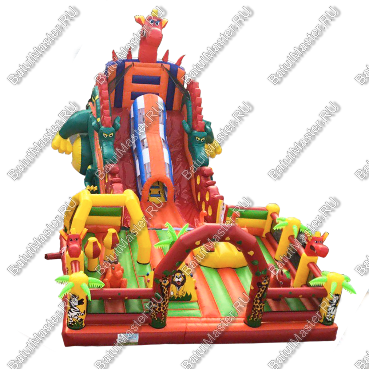 В его конструкции сочетаются горка, игровые фигуры, туннель, отдельные игровые зоны. Здесь же декоративные фигуры: три головы Змея Горыныча, пальмы. Весь комплекс огражден надувными барьерами и стенками. За время пребывания на аттракционе дети могут перемещаться из одной игровой зоны в другую. Они на скорости скатываются вниз по туннелю, по лестнице карабкаются на горку, на нижних игровых площадках можно попрыгать, преодолевая препятствия. Детская фантазия подсказывает различные сказочные сюжеты, которые тут же обыгрываются.