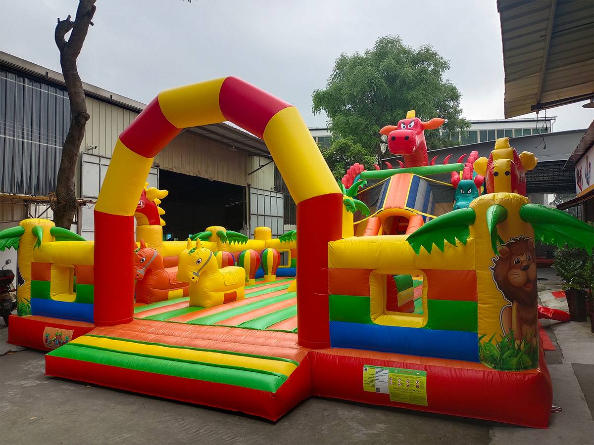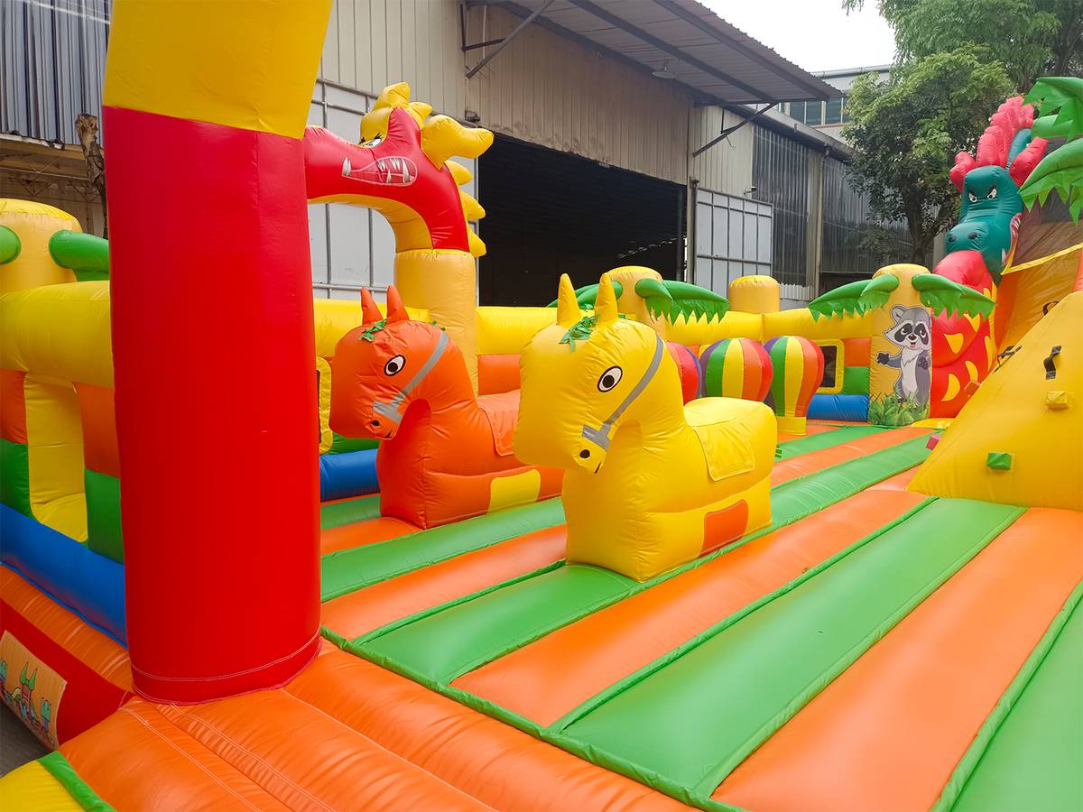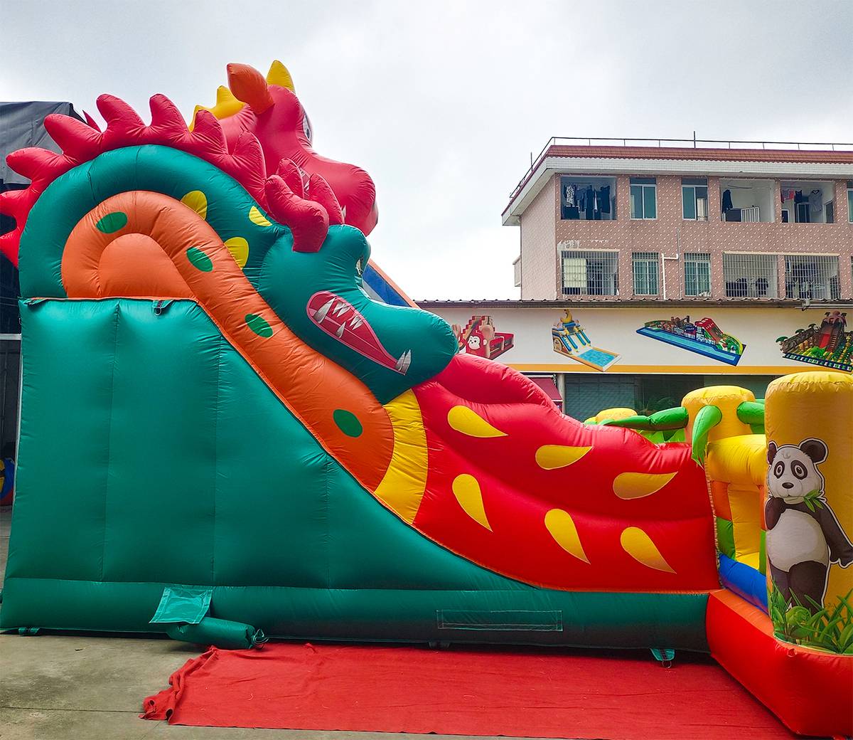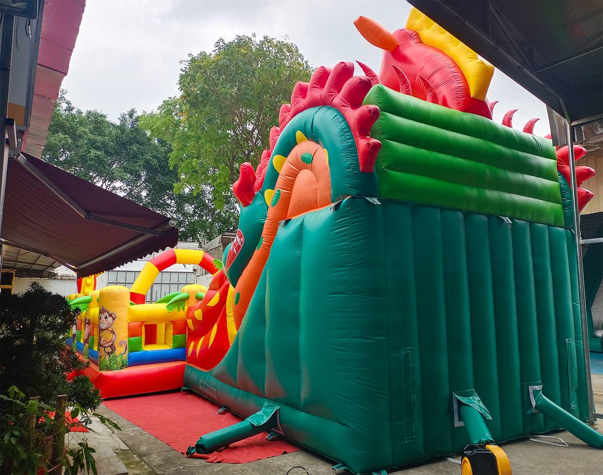 В его конструкции сочетаются горка, игровые фигуры, туннель, отдельные игровые зоны. Здесь же декоративные фигуры: три головы Змея Горыныча, пальмы. Весь комплекс огражден надувными барьерами и стенками. За время пребывания на аттракционе дети могут перемещаться из одной игровой зоны в другую. Они на скорости скатываются вниз по туннелю, по лестнице карабкаются на горку, на нижних игровых площадках можно попрыгать, преодолевая препятствия. Детская фантазия подсказывает различные сказочные сюжеты, которые тут же обыгрываются.