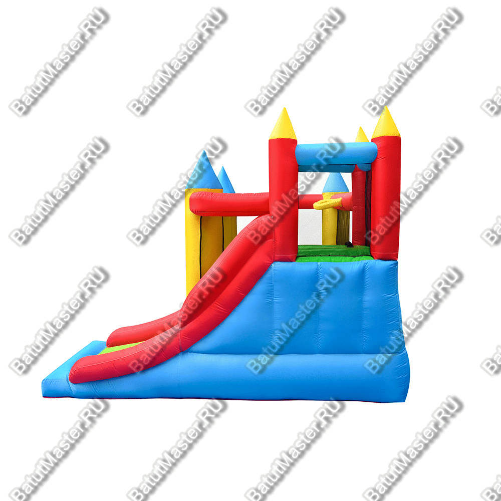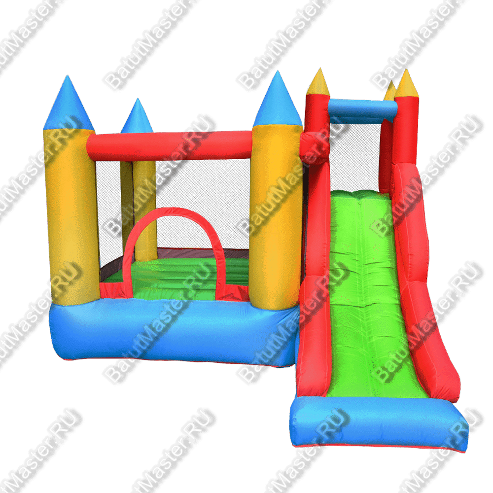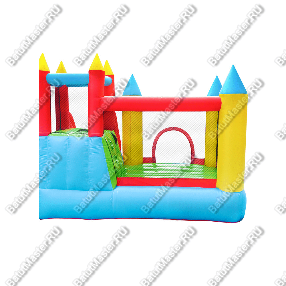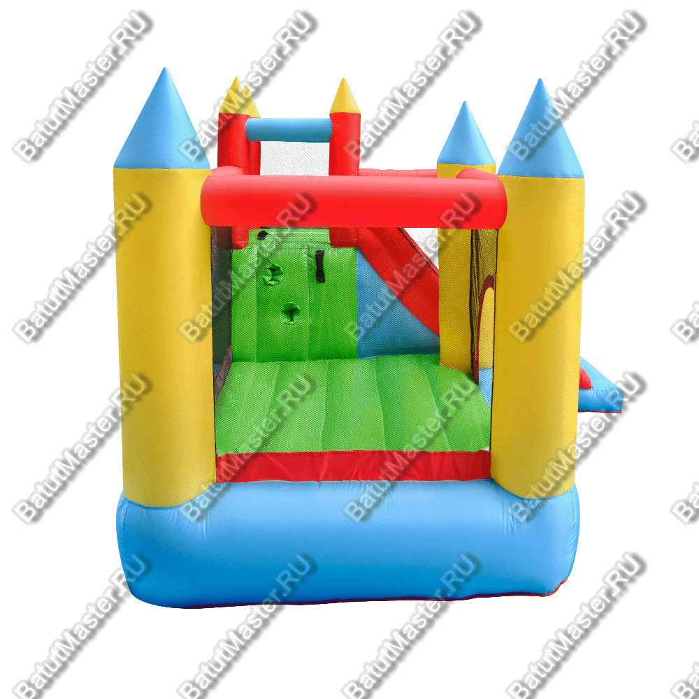 Яркий и интересный Батут для дачи, прекрасно сочетающий разные цвета. Его конусообразные крыши и вход в виде арки ясно дают понять, что это не обычная конструкция, а настоящий замок для самых маленьких посетителей.