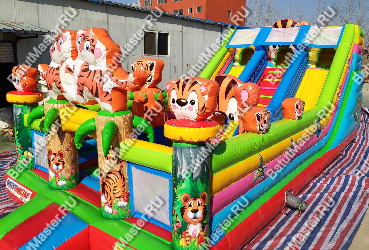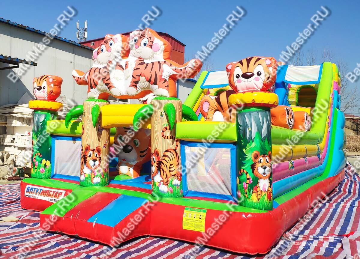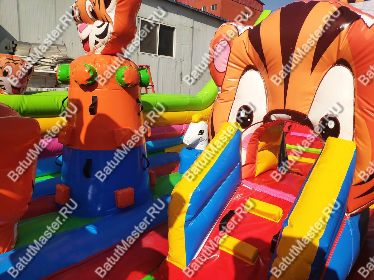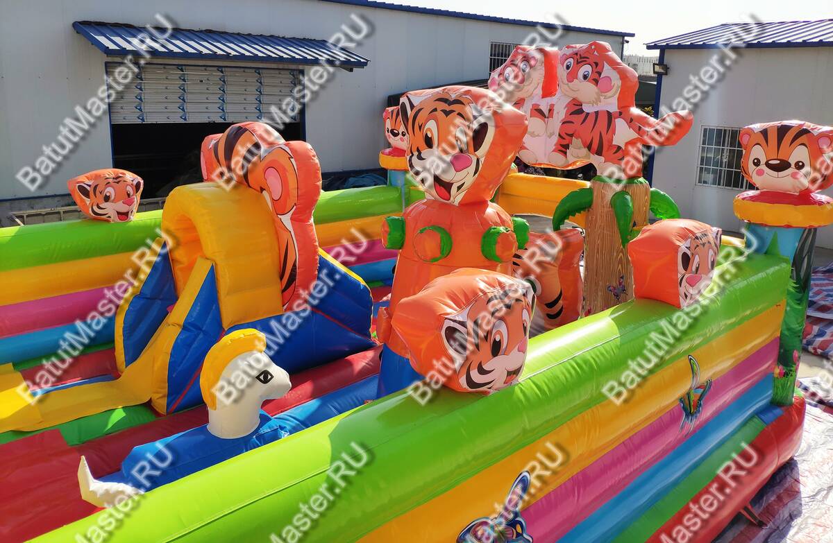 Увлекательные приключения ждут мальчишек и девчонок в комплексе «Тигриная страна 2». Здесь найдут себе занятие по душе дети от двух лет и старше. Надувной батут оснащен горками разной величины, скалодромом, надувными модулями в виде кольца, тоннеля и конечно же, тигрят, которых здесь так много, и они все разные. Над горкой имеются домики, где можно поиграть в прятки. Это целая арена для бега, веселых игр, а также тренировки и улучшения физических показателей у детей. Вокруг все яркое и притягивает взгляд.
