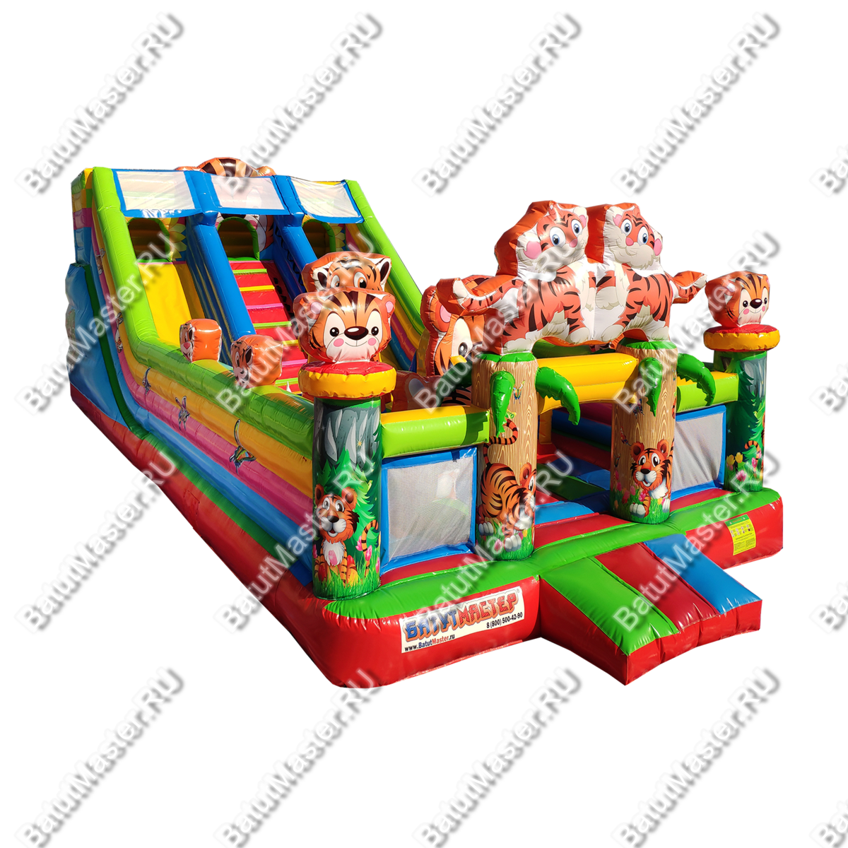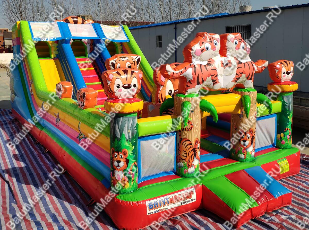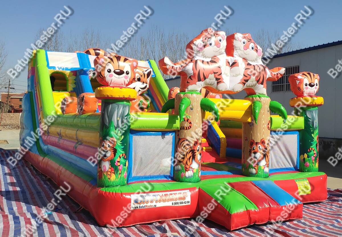Увлекательные приключения ждут мальчишек и девчонок в комплексе «Тигриная страна 2». Здесь найдут себе занятие по душе дети от двух лет и старше. Надувной батут оснащен горками разной величины, скалодромом, надувными модулями в виде кольца, тоннеля и конечно же, тигрят, которых здесь так много, и они все разные. Над горкой имеются домики, где можно поиграть в прятки. Это целая арена для бега, веселых игр, а также тренировки и улучшения физических показателей у детей. Вокруг все яркое и притягивает взгляд.