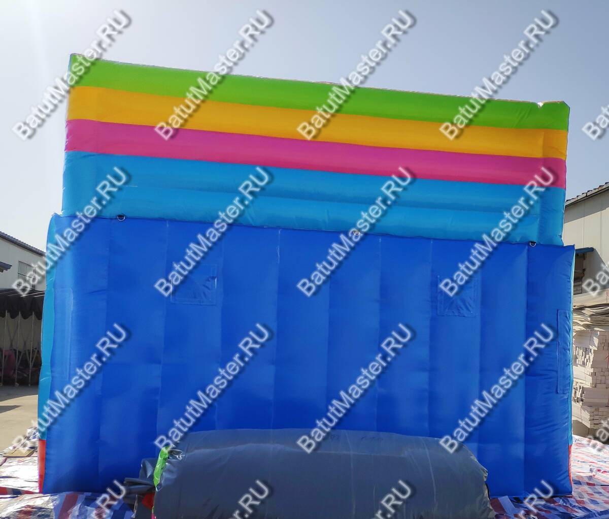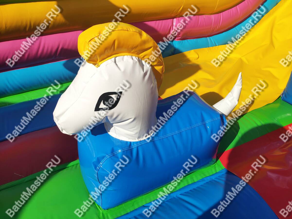 Весь комплекс полностью надувной, не имеет жестких элементов. По всему периметру окружен надувными бортами, а спереди окошками, чтобы родители могли наблюдать как играют дети.