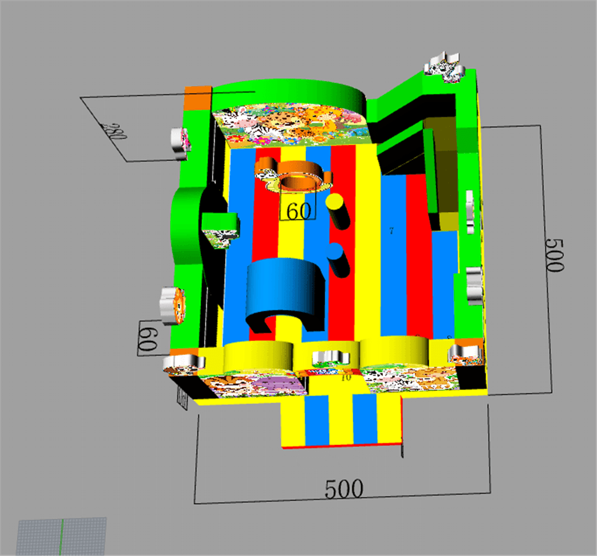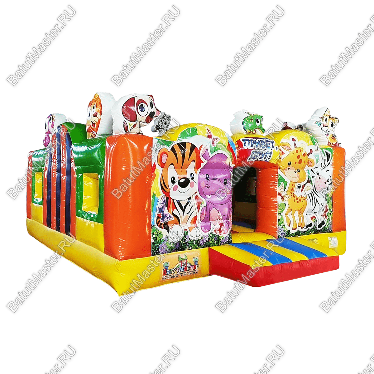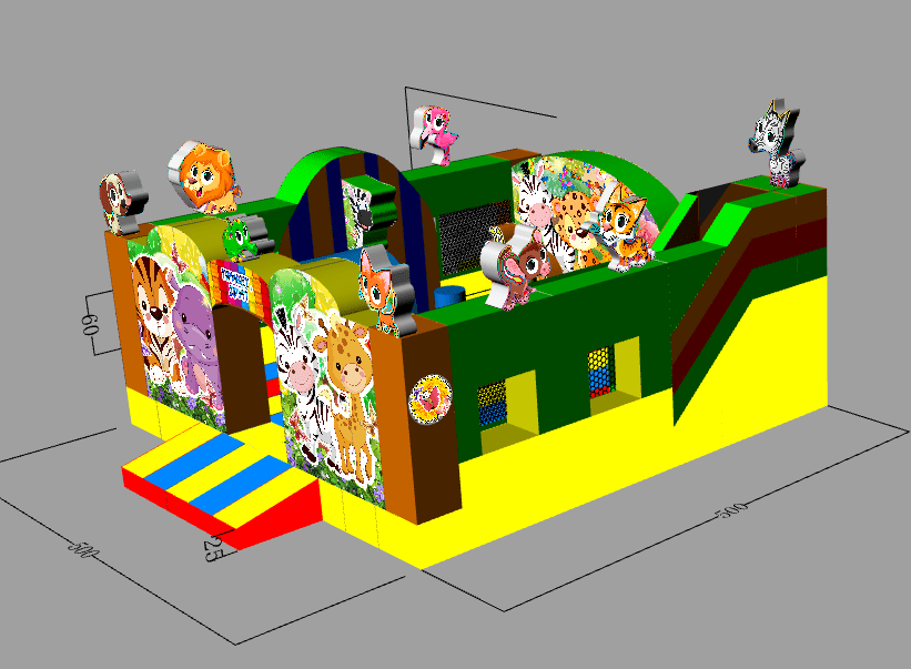 Коммерческий надувной батут «Добрые зверята» точно не останется незамеченным, ведь такой красивый аттракцион привлекает внимание не только детей, но и их родителей. Любой ребёнок будет заворожено смотреть на красивые декорации аттракциона, которые представлены в виде надувных фигур забавных животных с большими выразительными глазками. Также батут богато украшен красочными принтами с весёлыми зверятами.