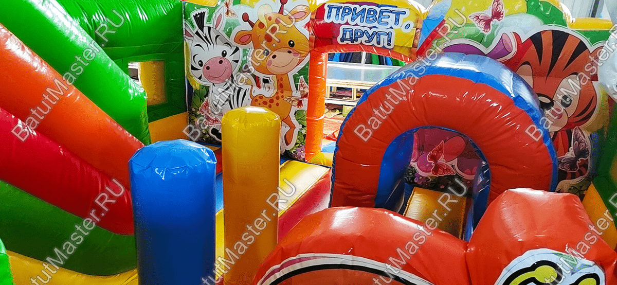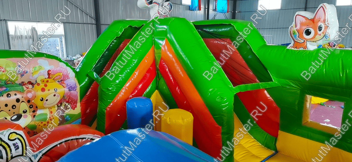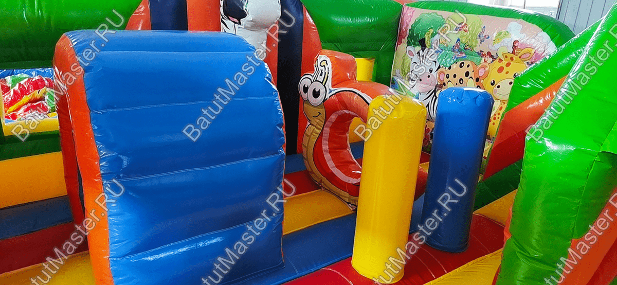 После того как ребёнок окажется внутри этого батута, его сразу встретят фигуры весёлых животных и целое море развлечений. Внутри батута достаточно просторно, и ребёнок сразу может вдоволь побегать и попрыгать на упругой поверхности. Конечно, не обошлось и без разнообразных игровых элементов, с которыми может взаимодействовать ребёнок. Есть тут также и надувные груши, через которые так интересно проползать.