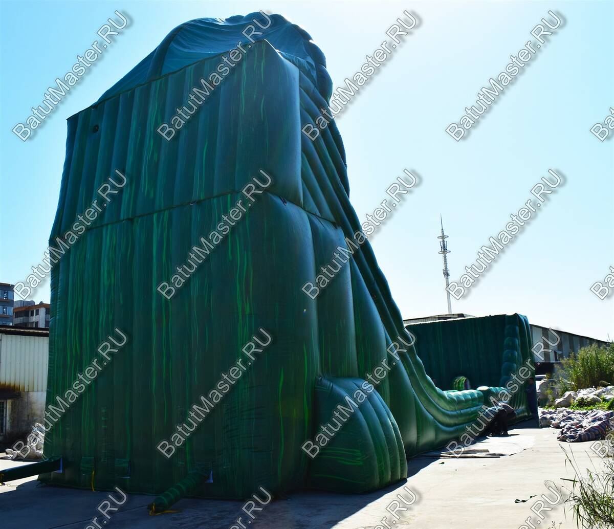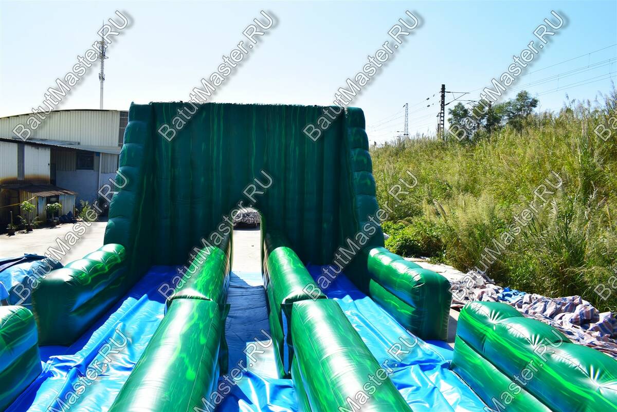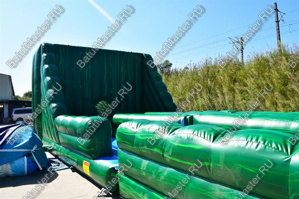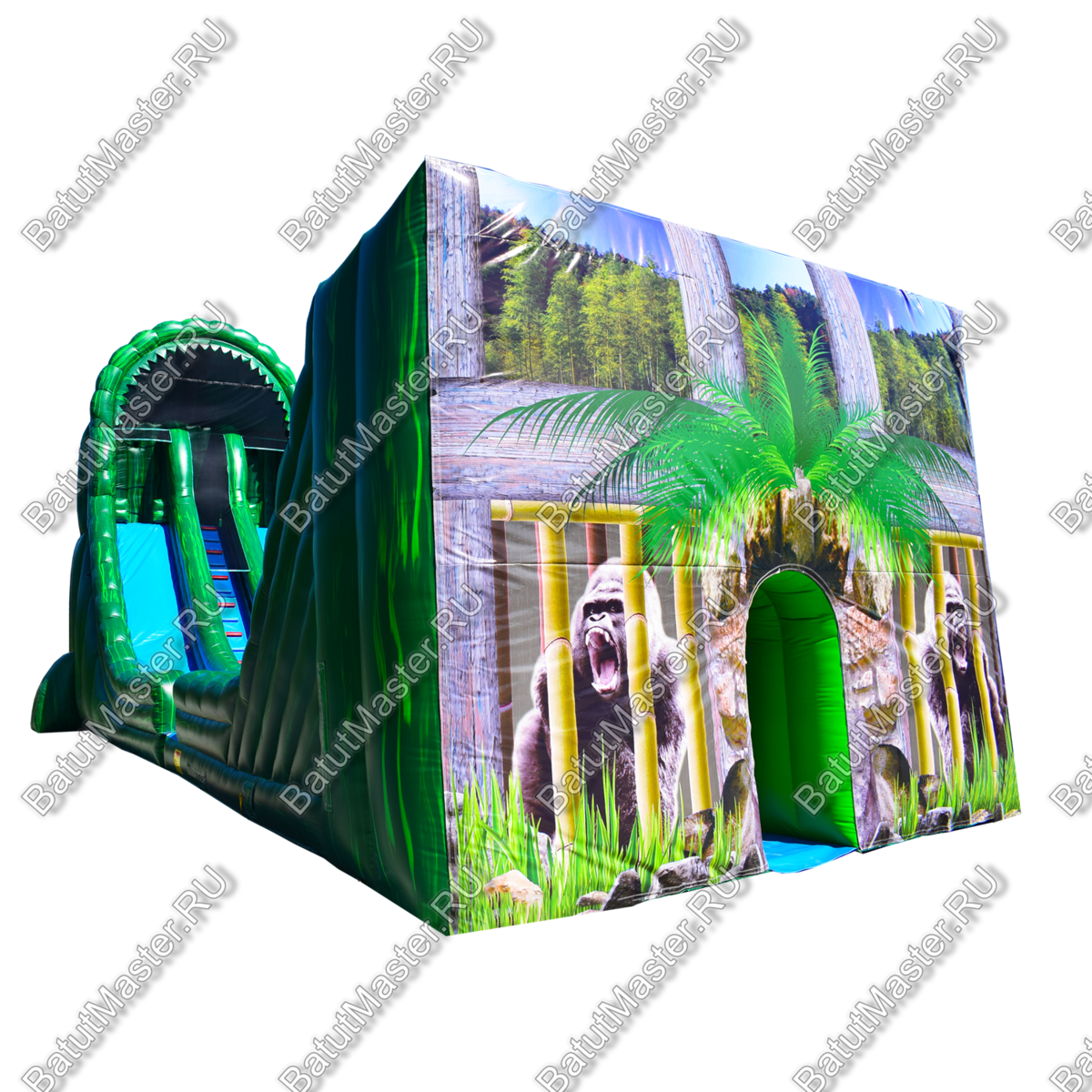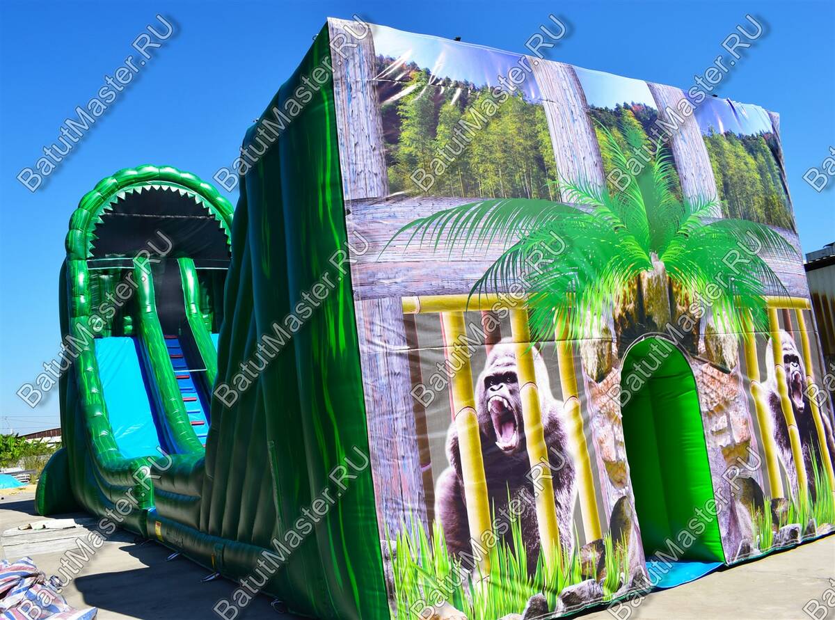 Это не просто надувной батут, это целая арена для захватывающих приключений, где дети получат незабываемые эмоции. Вход батута-горки выполнен в виде стены и украшен рисунками тропических джунглей, где обитают большие гориллы и другие животные. Таким образом все это задает тематику батуту. Он разделен на две одинаковые половины, где дети могут одновременно забираться на горку и спускаться с нее. Здесь даже можно устраивать соревнования. Также юным непоседам понравится перепрыгивать через боковые модули.