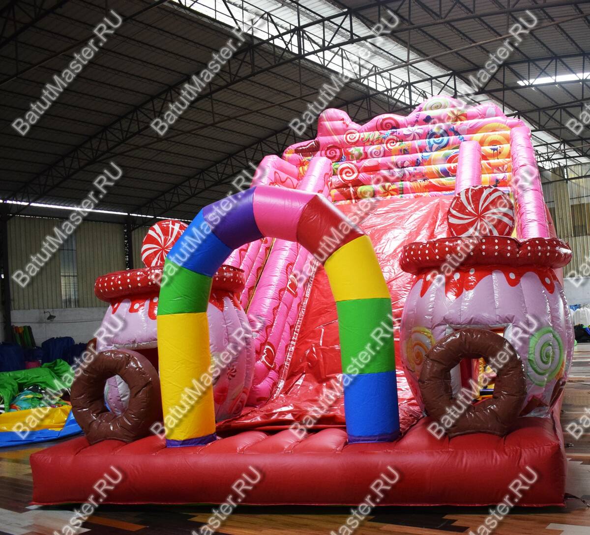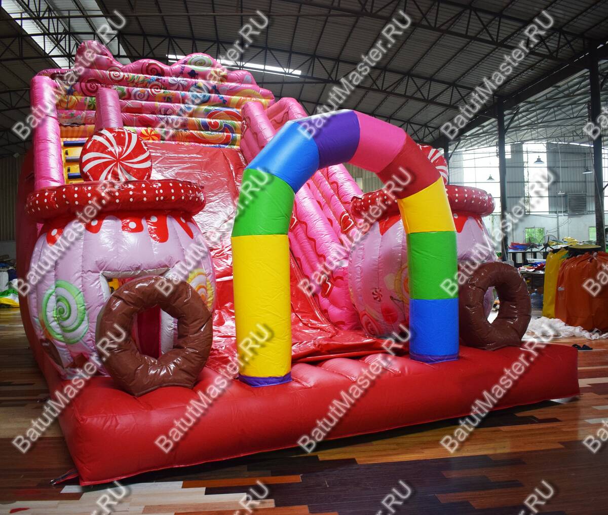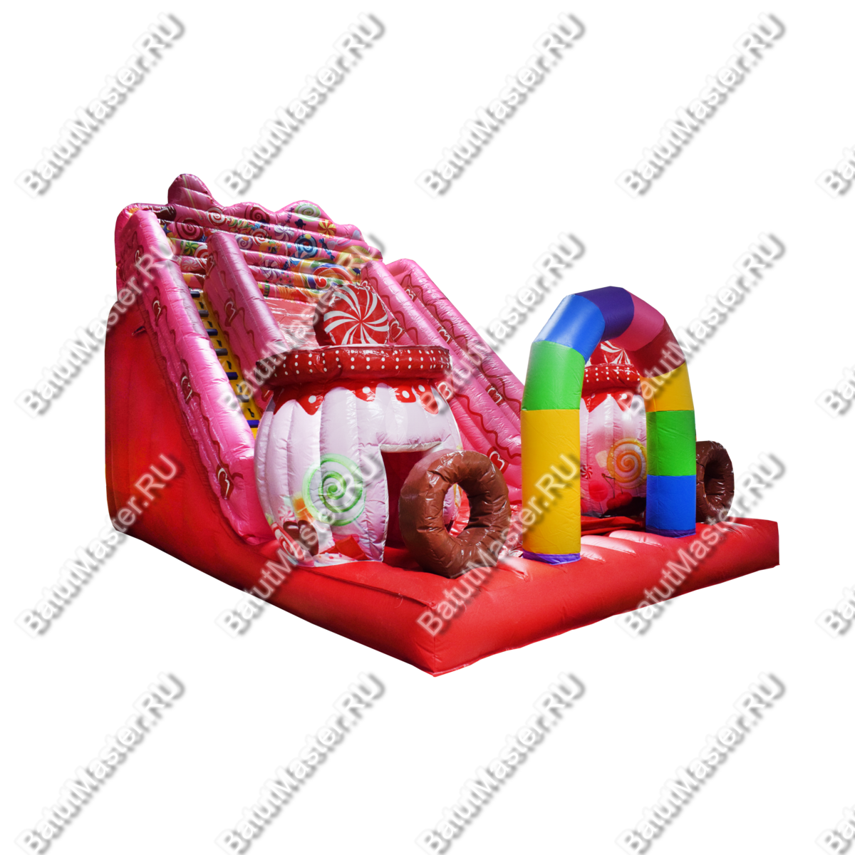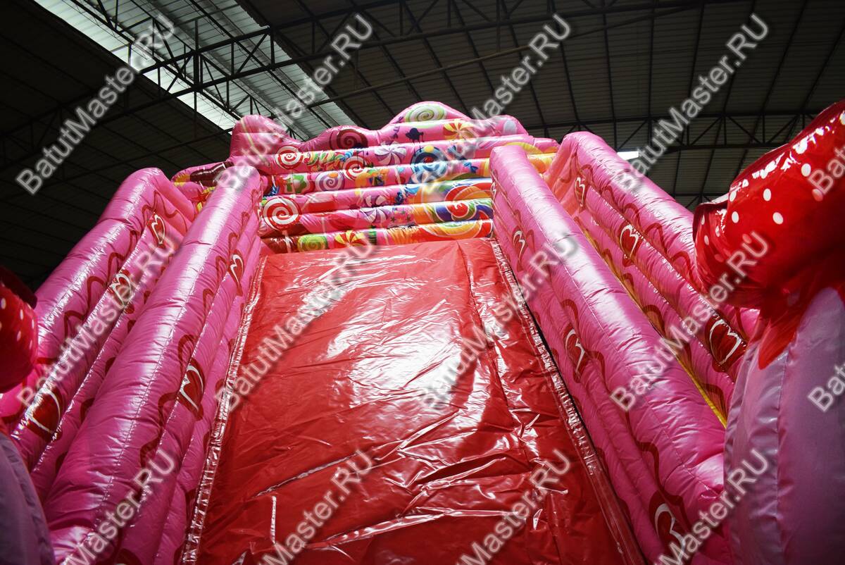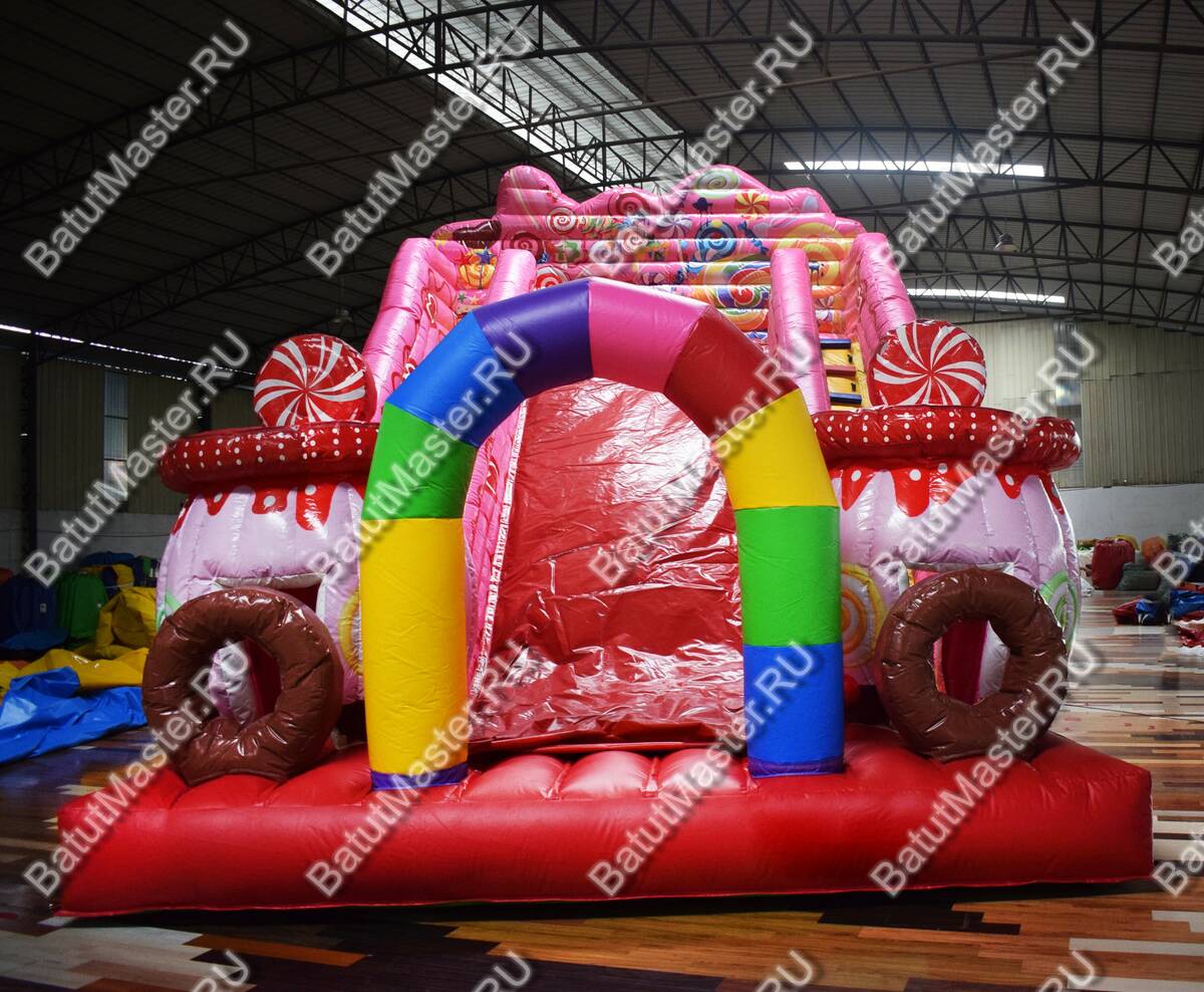 Современный и красочный надувной батут привлечет внимание юных первооткрывателей. Он выполнен в виде карамельной горки, где есть небольшая зона для прыжков, а также надувные коричневые кольца и конфетные домики. Ребятам будет интересно забираться на верх широкой горки, а после катиться вниз. На горке имеется специальный материал, обеспечивающий лучшее скольжение. Яркий, конфетный батут непременно понравится детям. На игровом комплексе маленькие непоседы с удовольствием проведут время.¶Комплекс необычной тематики дети с удовольствием посетят не раз, чтобы снова окунуться в мир состязаний и новых открытий.