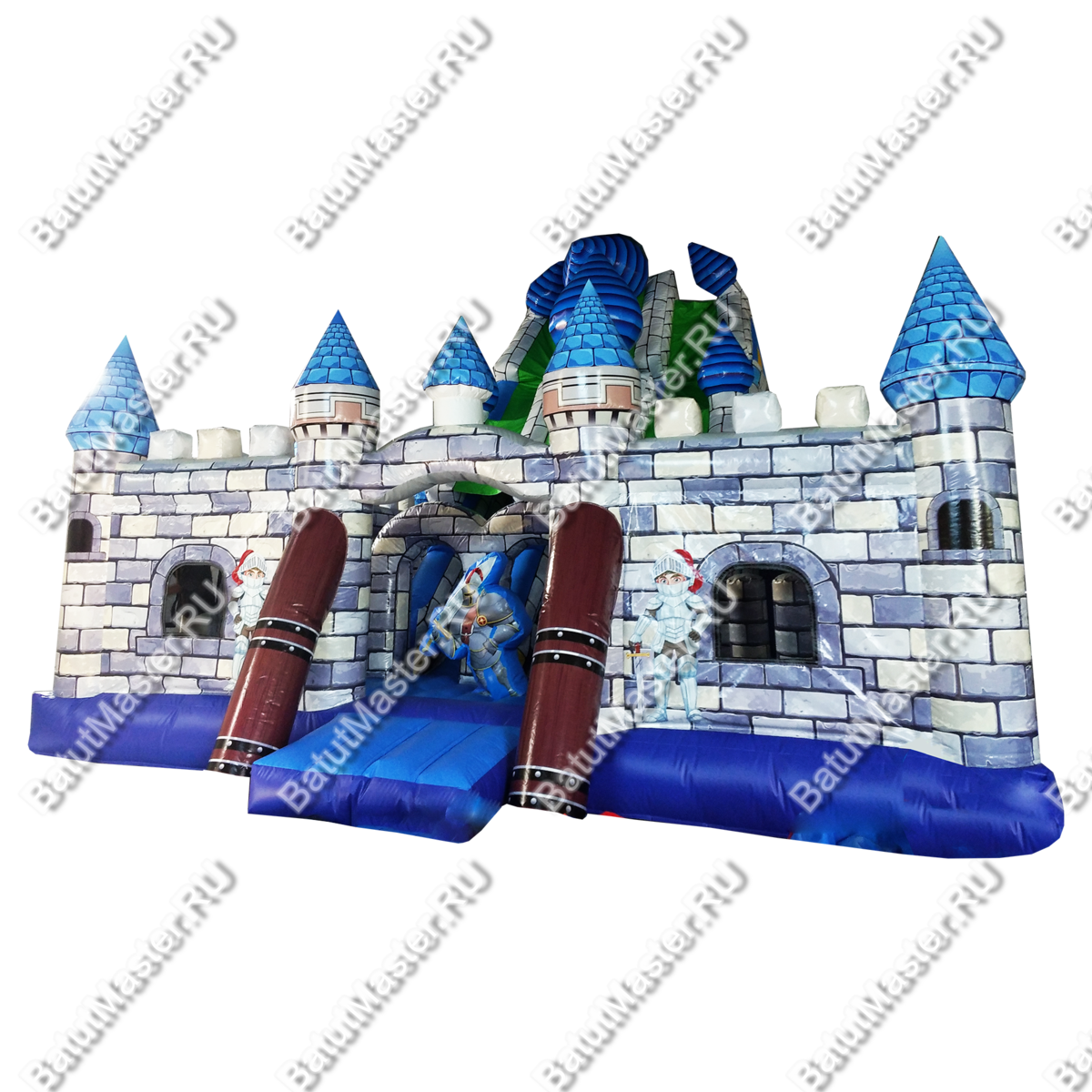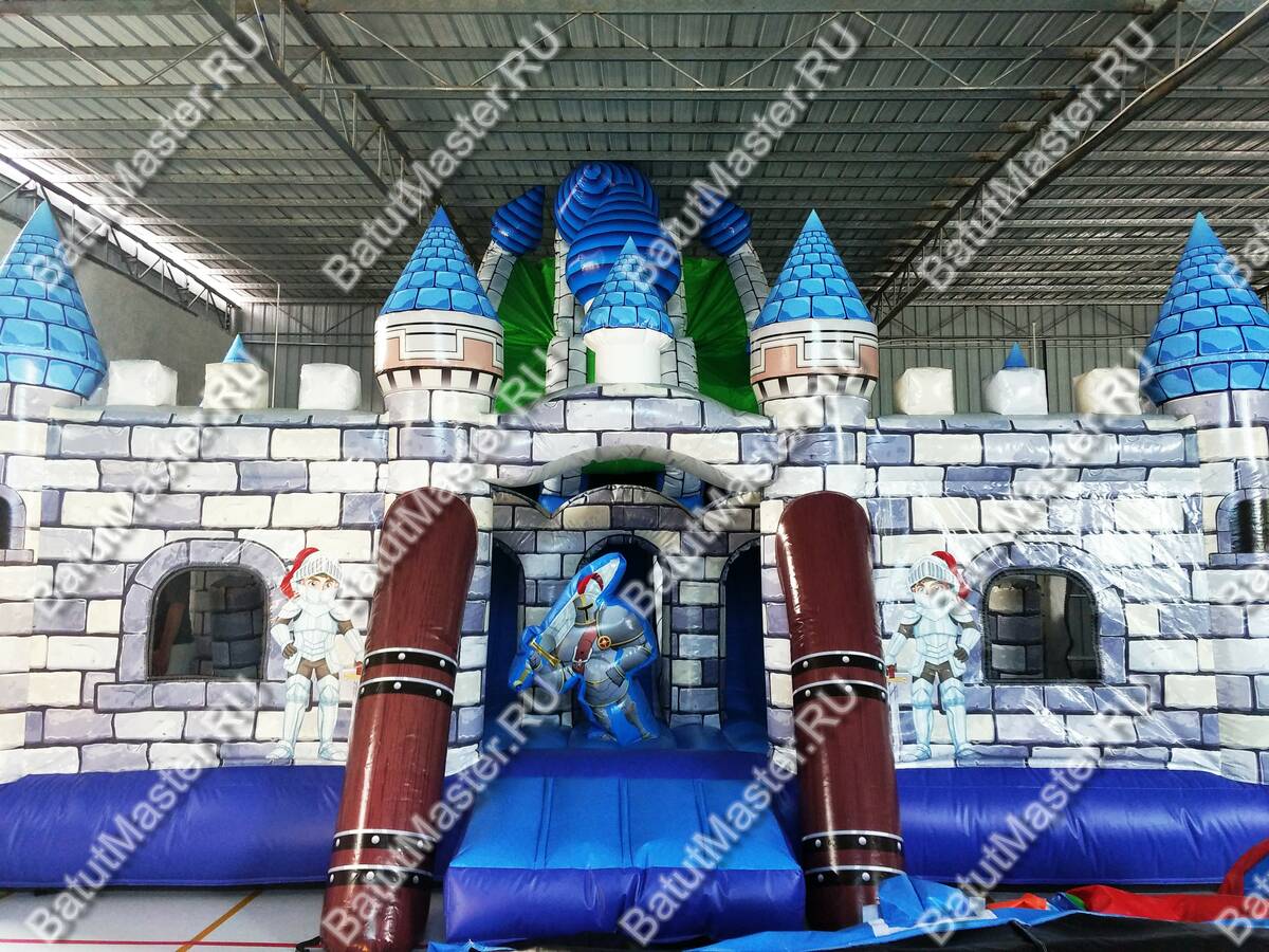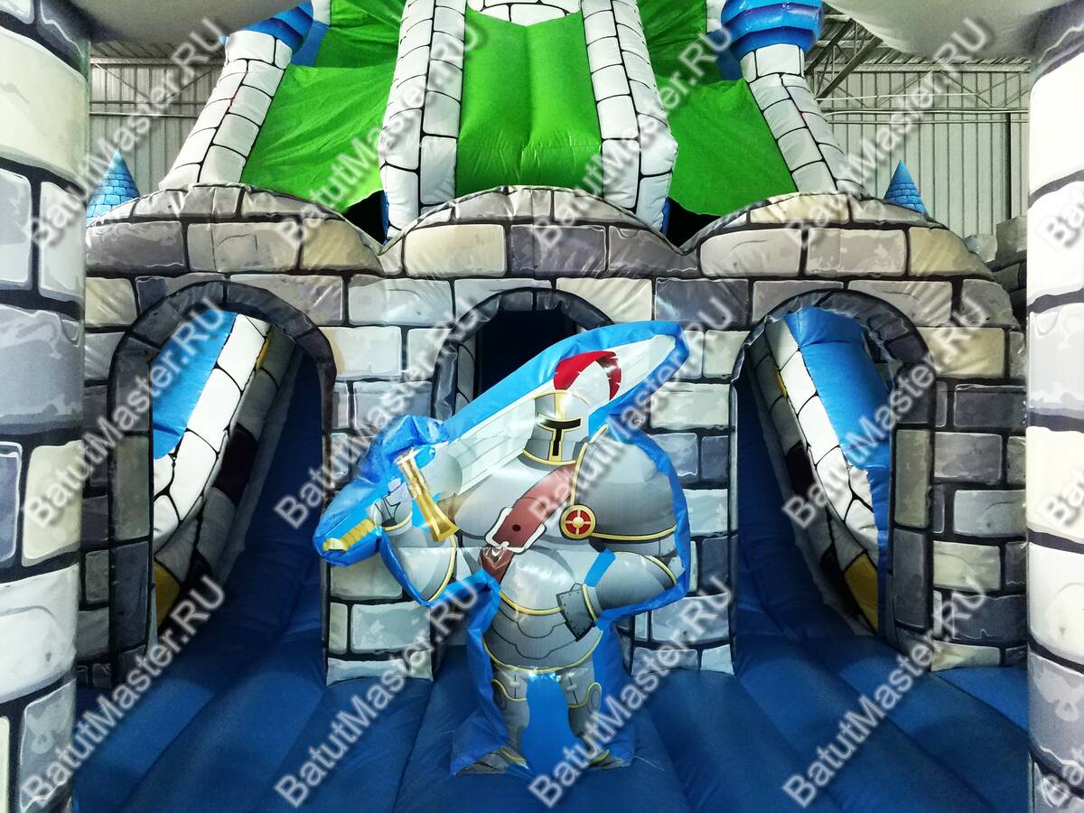Добро пожаловать на большой игровой комплекс «Рыцарь». Интересный яркий комплекс, выполненный в стилистике старинного замка. Он, несомненно, приведет детей в восторг и привлечет их внимание. Внутри батута все поддерживает аналогичную тематику: модули с изображениями рыцарей, несколько горок и подъемов, надувные кольца, а также множество отдельных зон, напоминающих комнаты, где детям интересно будет прятаться друг от друга и также бродить в поисках чего тонового и привлекательного. Здесь просто огромное прыжковое поле. Места хватит всем! Можно прыгать и веселиться сколько угодно! Верх батута украшают башенки, которые есть у настоящего замка.