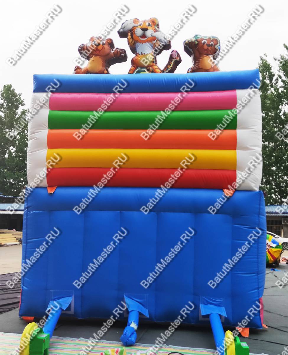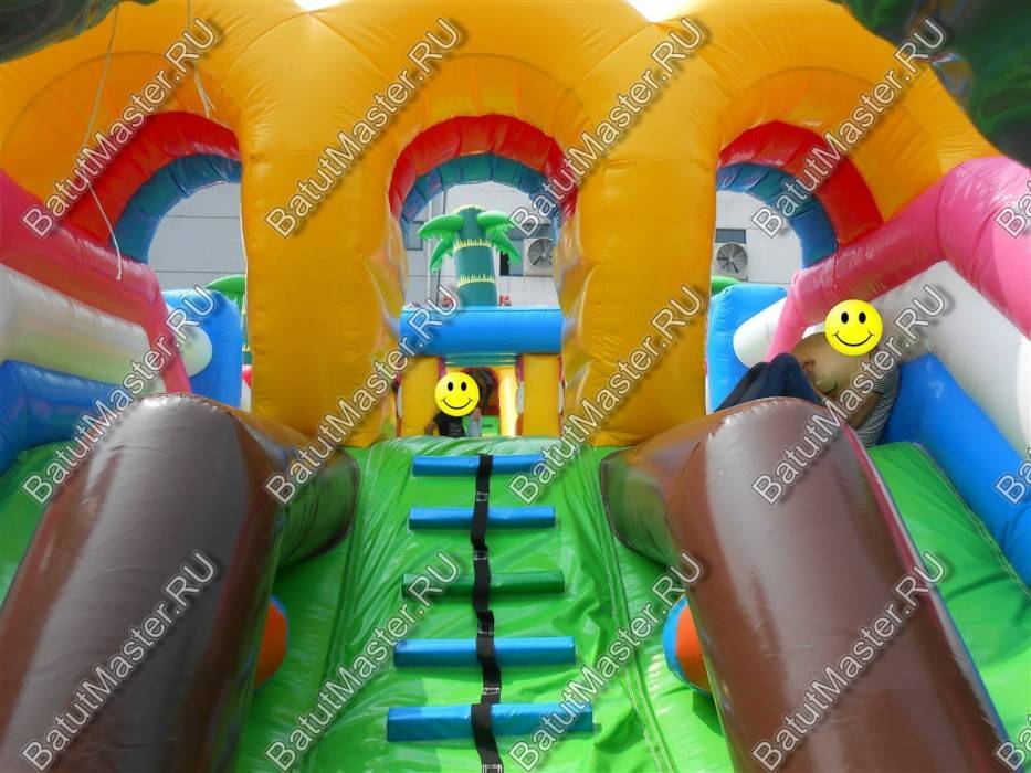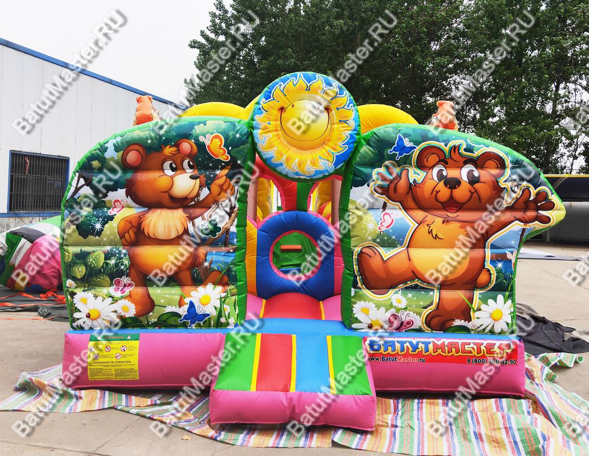 Коммерческий батут полностью надувной, не имеет жестких элементов. По всему периметру он окружен надувными бортами. Вход украшен рисунками в виде веселых мишек и солнца. ¶Изготовлен из ламинированного ПВХ высокого качества. Швы и материал не впитывают пыль и грязь. Комплекс простой и неприхотливый в уходе. После установки не требует дополнительных вложений.