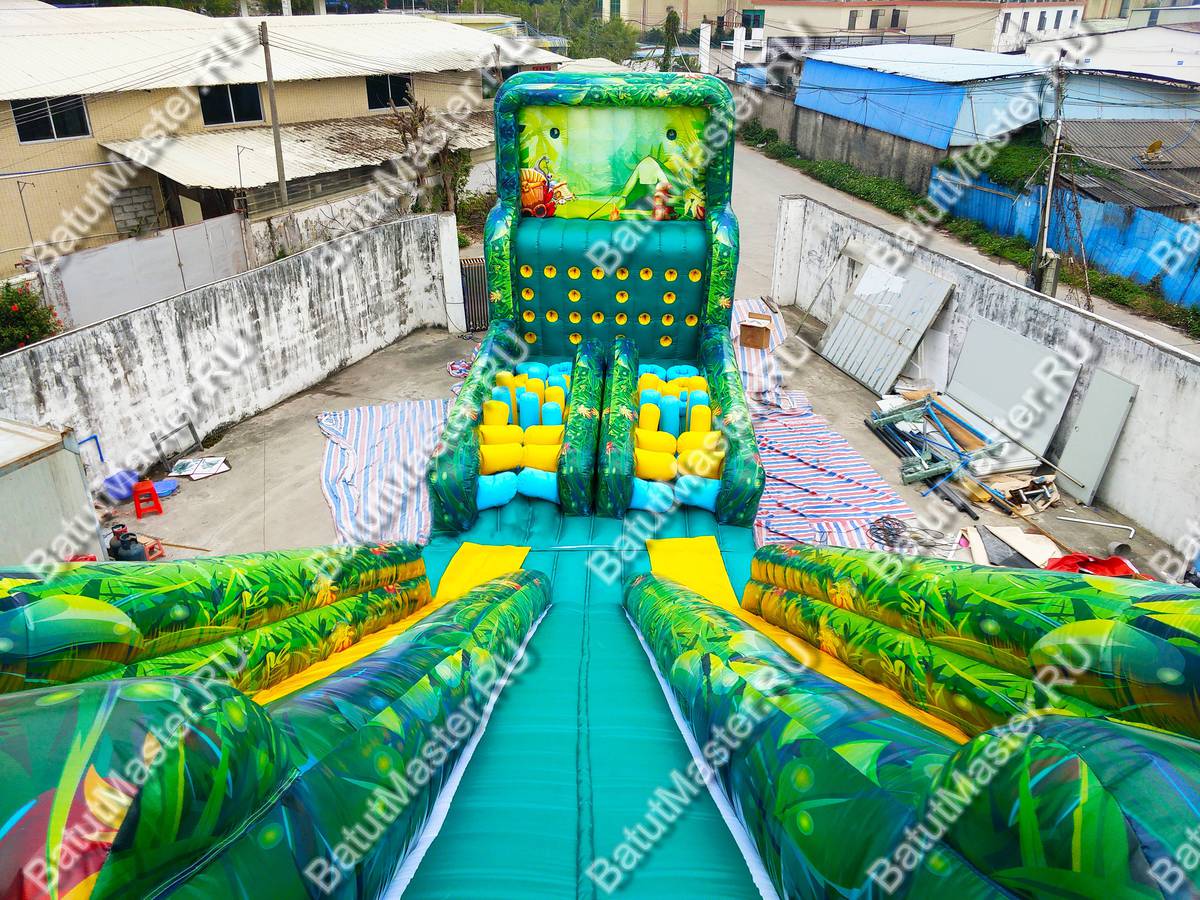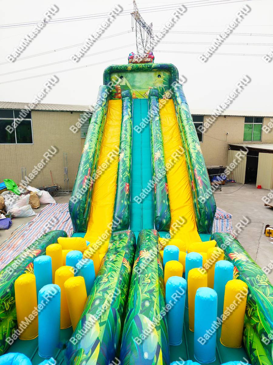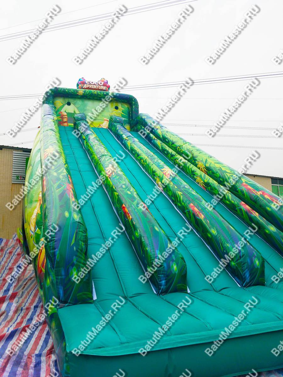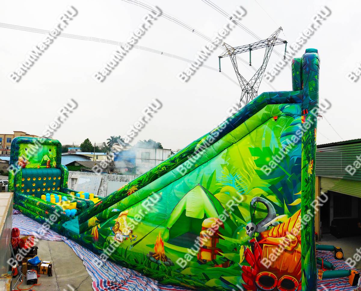Полоса препятствий выполнена в тропическом стиле, который поддерживают рисунки пальм, животных и птиц. Яркий современный комплекс предназначен для бизнеса, ведь зарабатывать можно сразу же после его установки. Коммерческий батут полностью надувной, не имеет жестких элементов. Отвечает всем требованиям безопасности.