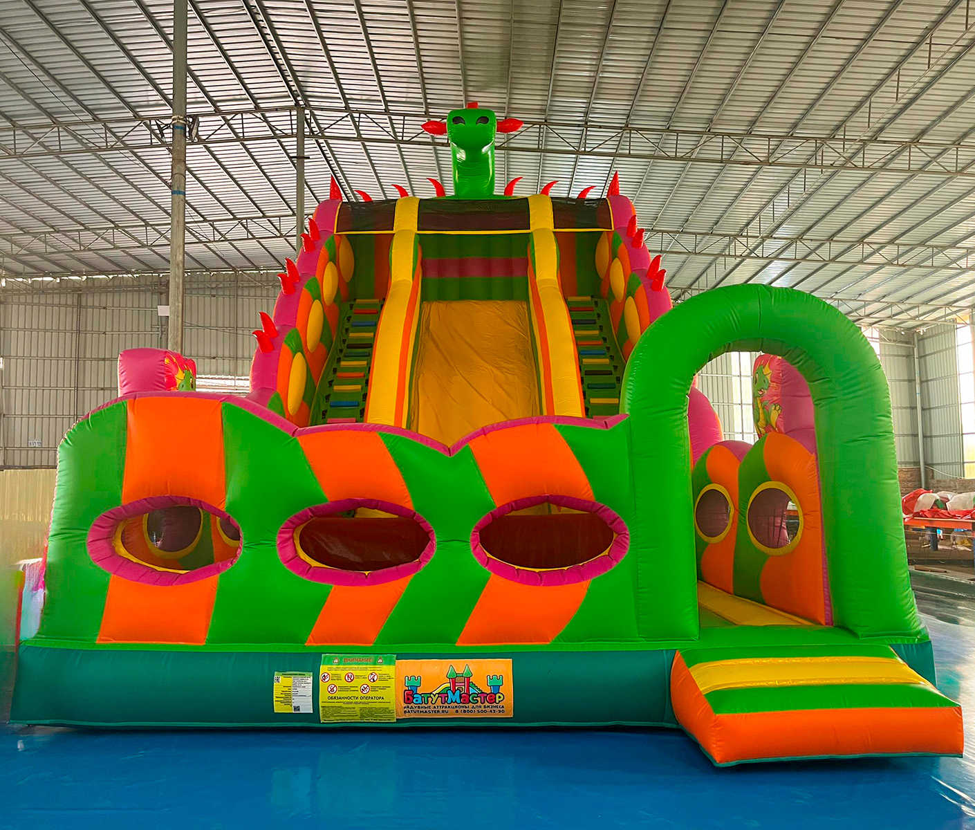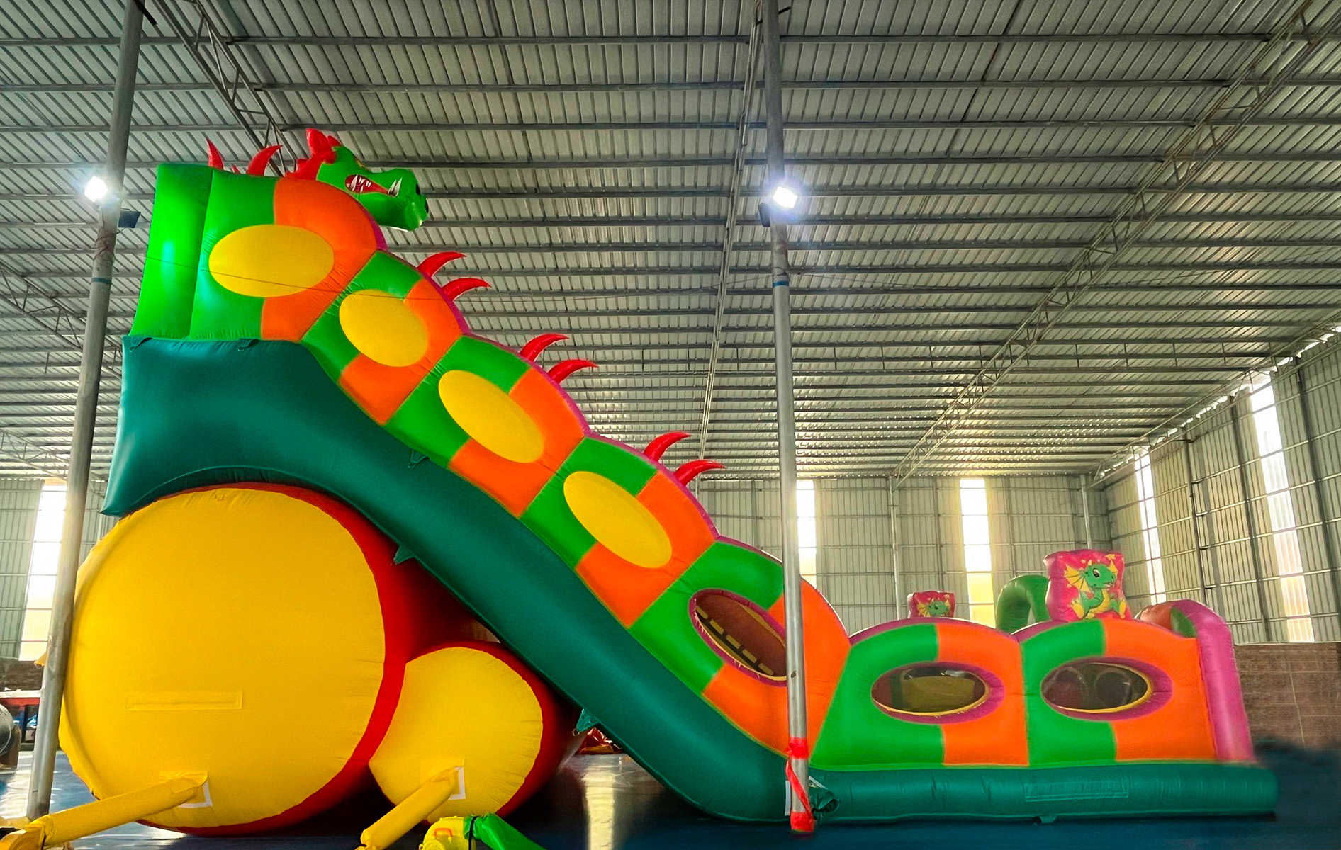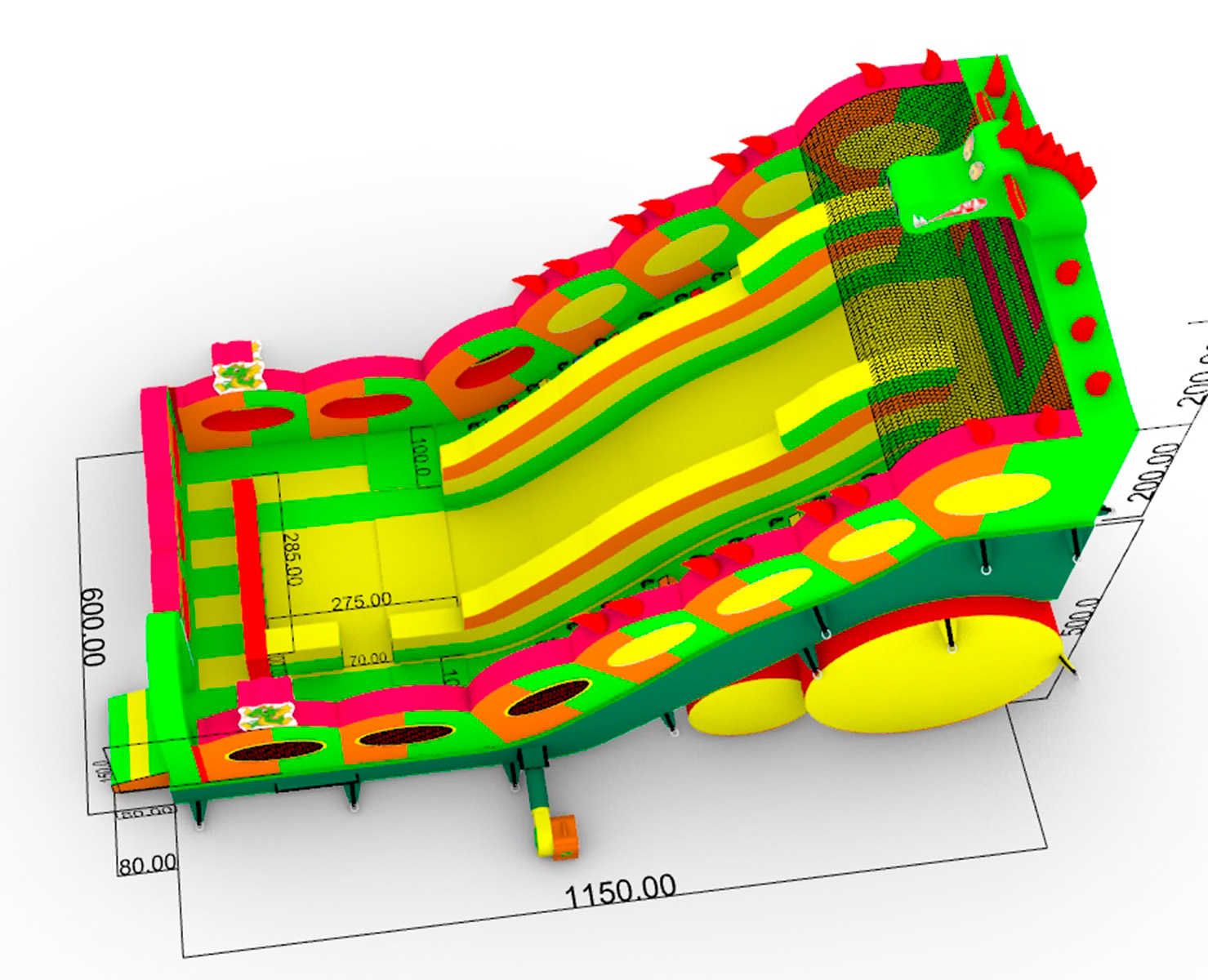 Батут-горка «Дракон» — это не просто батут. Это настоящий мир приключений, оформленный в сказочной тематике. Голова зелёного дракона величественно возвышается над горкой, придавая конструкции сказочный шарм. Яркая цветовая палитра (зелёный, красный, жёлтый, оранжевый и синий) делает аттракцион визуальным магнитом на любом мероприятии: в парке, на фестивале, в торговом центре или частной вечеринке.