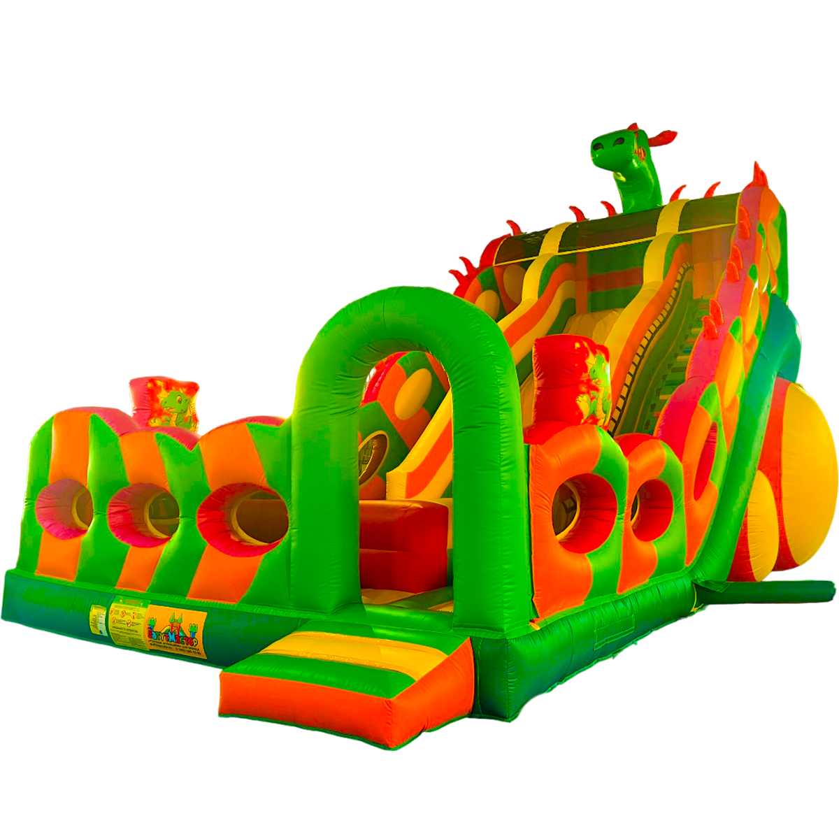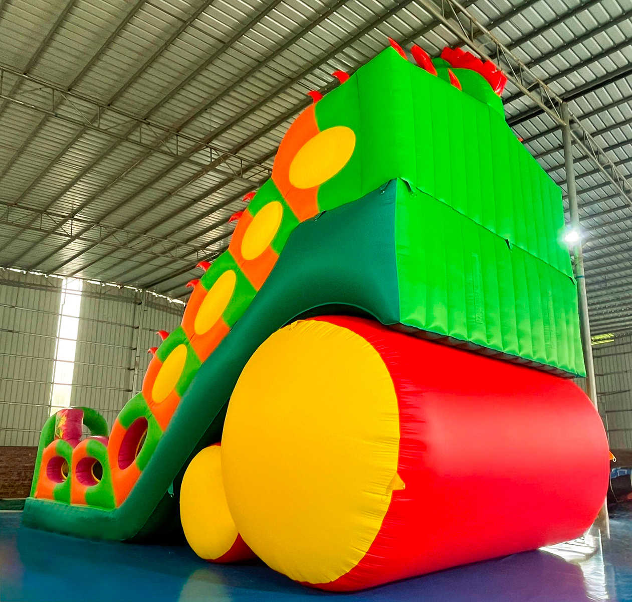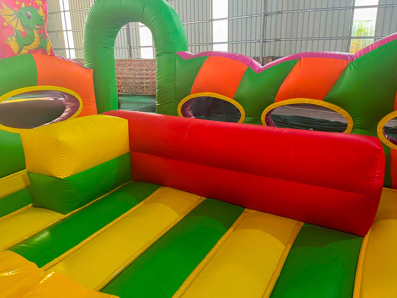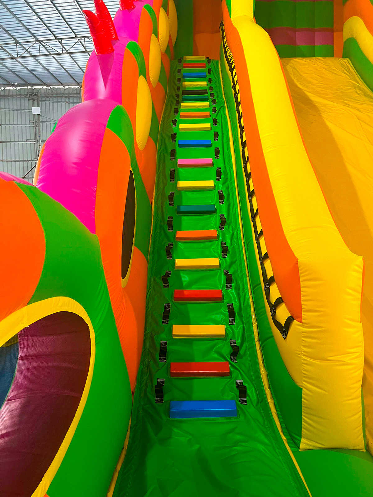 Батут-горка «Дракон» — это не просто батут. Это настоящий мир приключений, оформленный в сказочной тематике. Голова зелёного дракона величественно возвышается над горкой, придавая конструкции сказочный шарм. Яркая цветовая палитра (зелёный, красный, жёлтый, оранжевый и синий) делает аттракцион визуальным магнитом на любом мероприятии: в парке, на фестивале, в торговом центре или частной вечеринке.