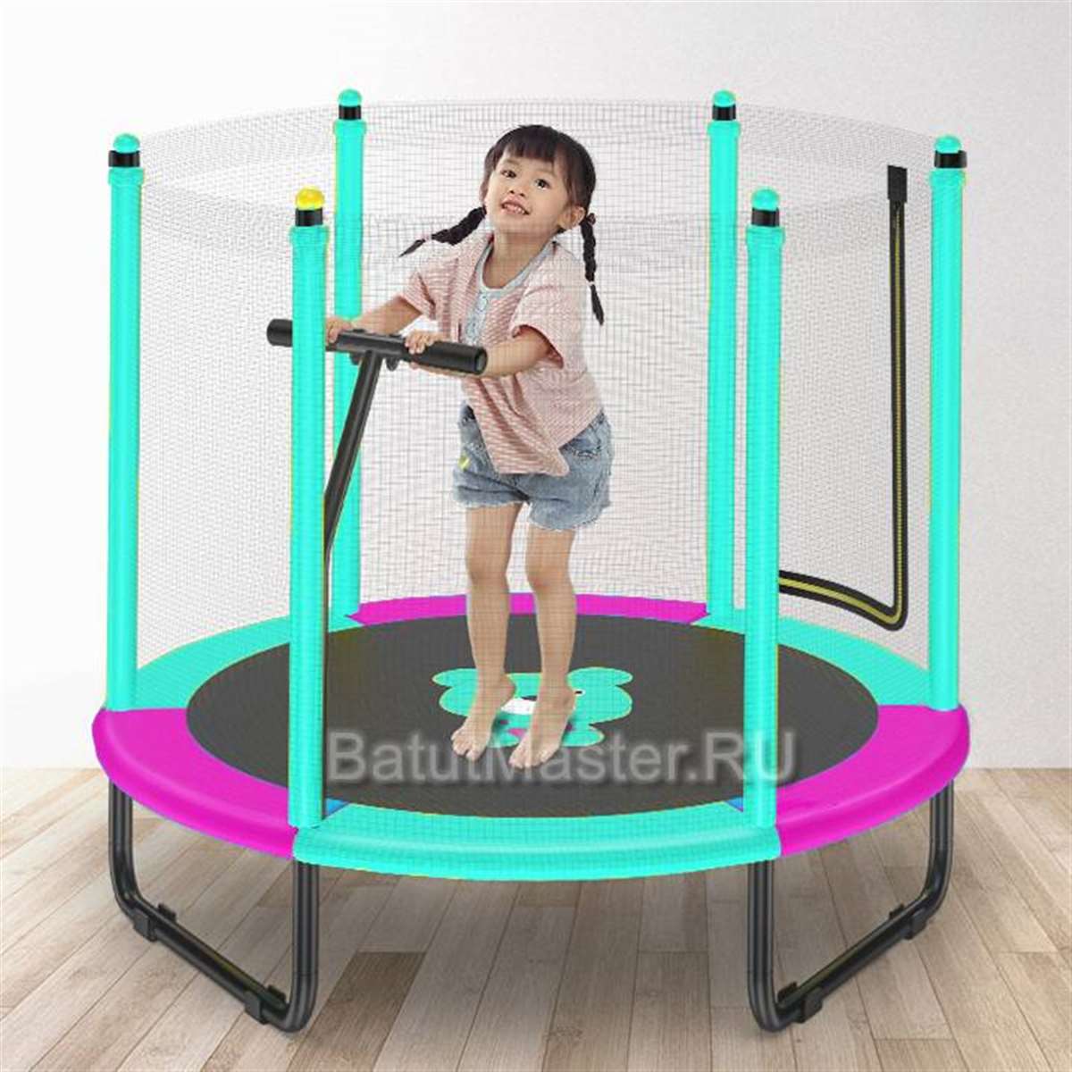 Батут выполнен в стильной бирюзово-розовой гамме — нежной и современной.