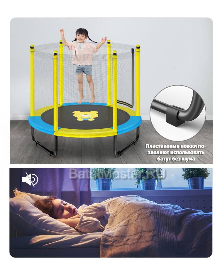 Нежные оттенки подойдут как для девочек, так и для мальчиков, а компактные размеры позволят вписать батут в интерьер любой детской комнаты.