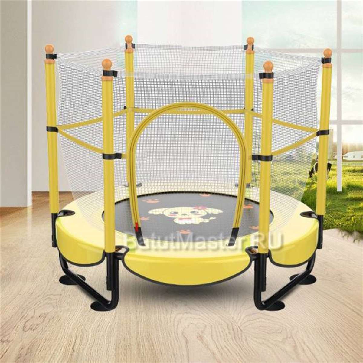 На центральной части полотна изображён милый щенок, который вызывает у детей улыбку и делает батут ещё привлекательнее.