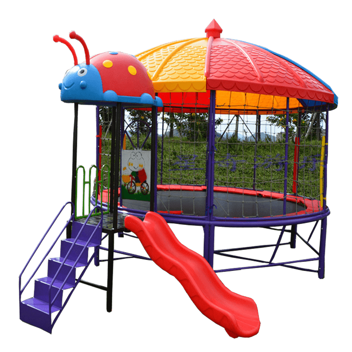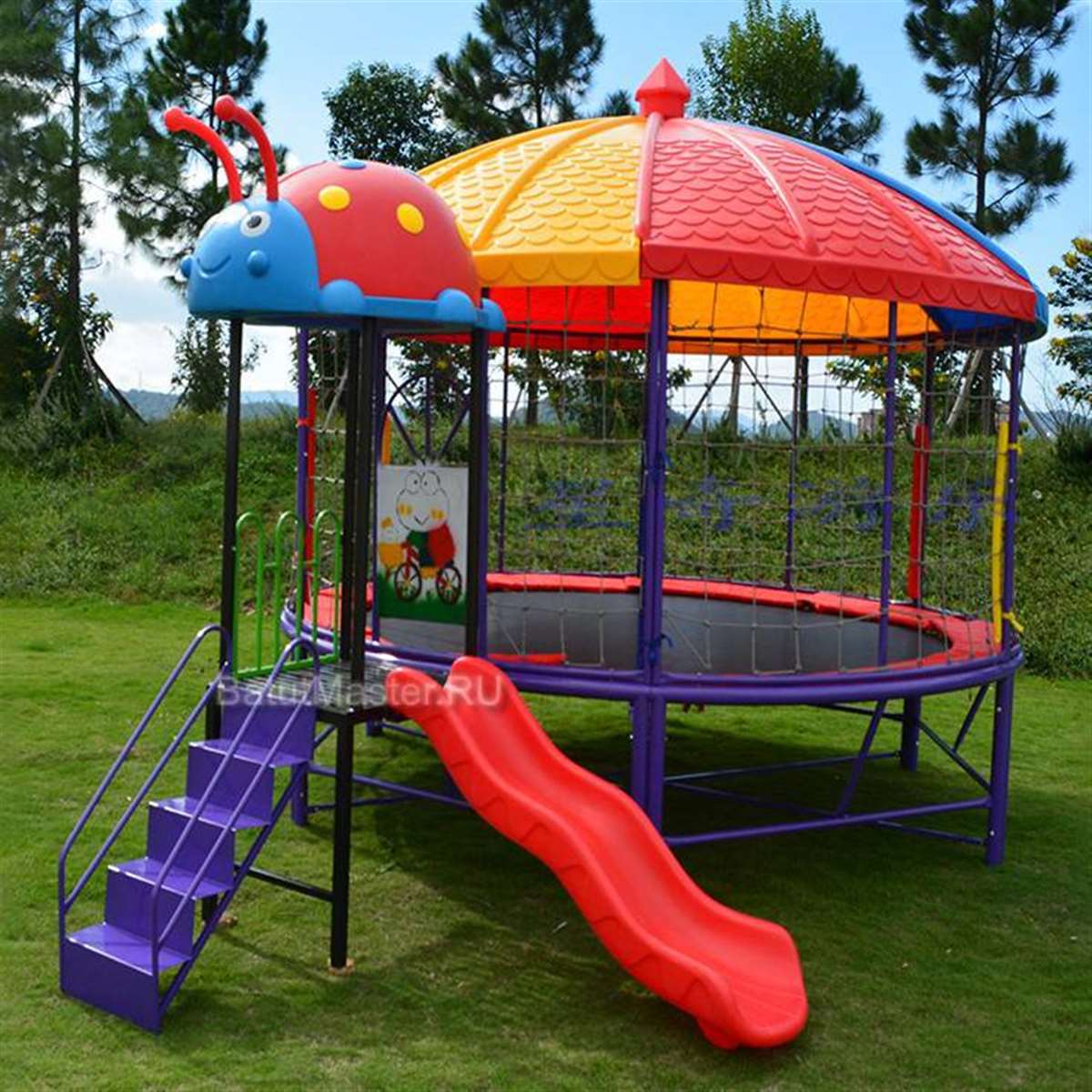 Батутная арена с горкой «Весёлый Жучок 4» — это современное игровое решение, сочетающее в себе функции батута, горки и безопасной игровой зоны под крышей. Компактные габариты 4,5x3,8x2,8 м позволяют легко интегрировать арену даже в ограниченные пространства, при этом она сохраняет все функции полноразмерного игрового модуля. Благодаря красочному дизайну с элементами в форме милого жучка, арена моментально привлекает внимание детей и создаёт ощущение сказки и праздника.