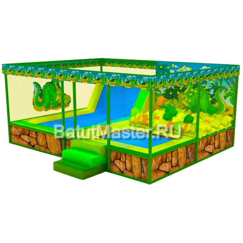 Каждый элемент арены оформлен в единой тематике: зелёные и каменные текстуры, мультяшные динозавры, растительность по периметру — всё это создаёт атмосферу доисторического леса, где каждый ребёнок становится отважным первооткрывателем.