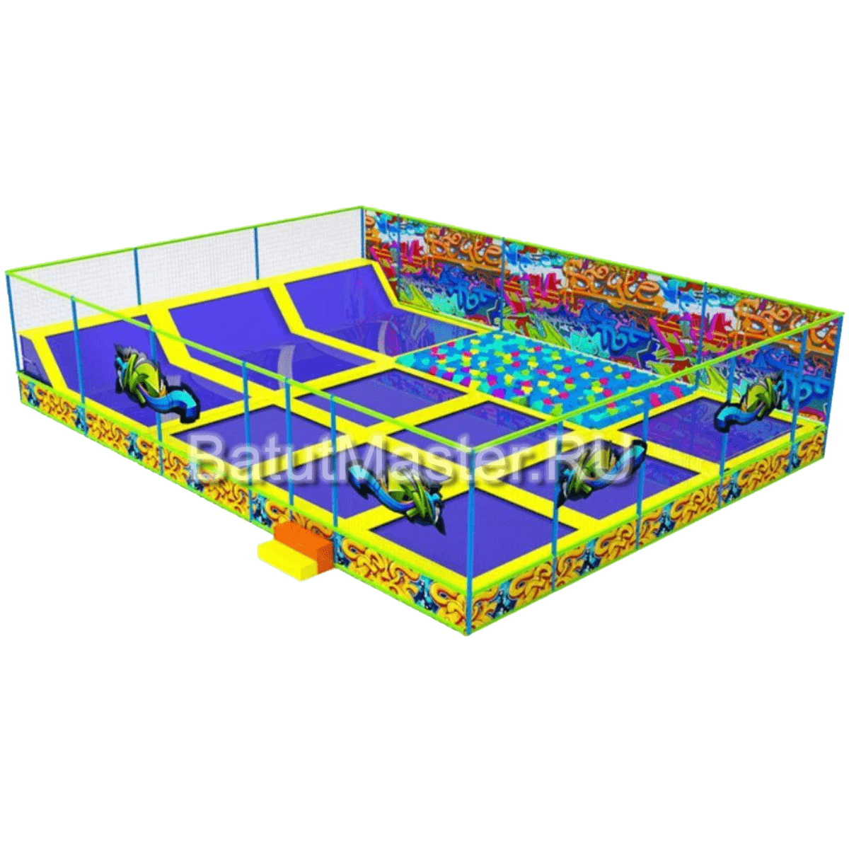 Батутная арена «Полёт» — это динамичный, дерзкий и визуально мощный аттракцион, который станет магнитом внимания в любом развлекательном пространстве. Сочетание насыщенных цветов (фиолетовый, жёлтый, неоново-зелёный) с граффити-декором создаёт атмосферу городского драйва, свободы и энергии.