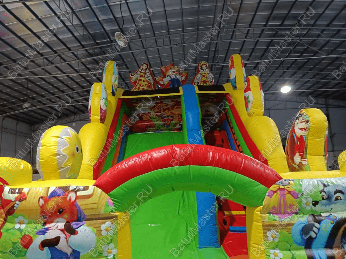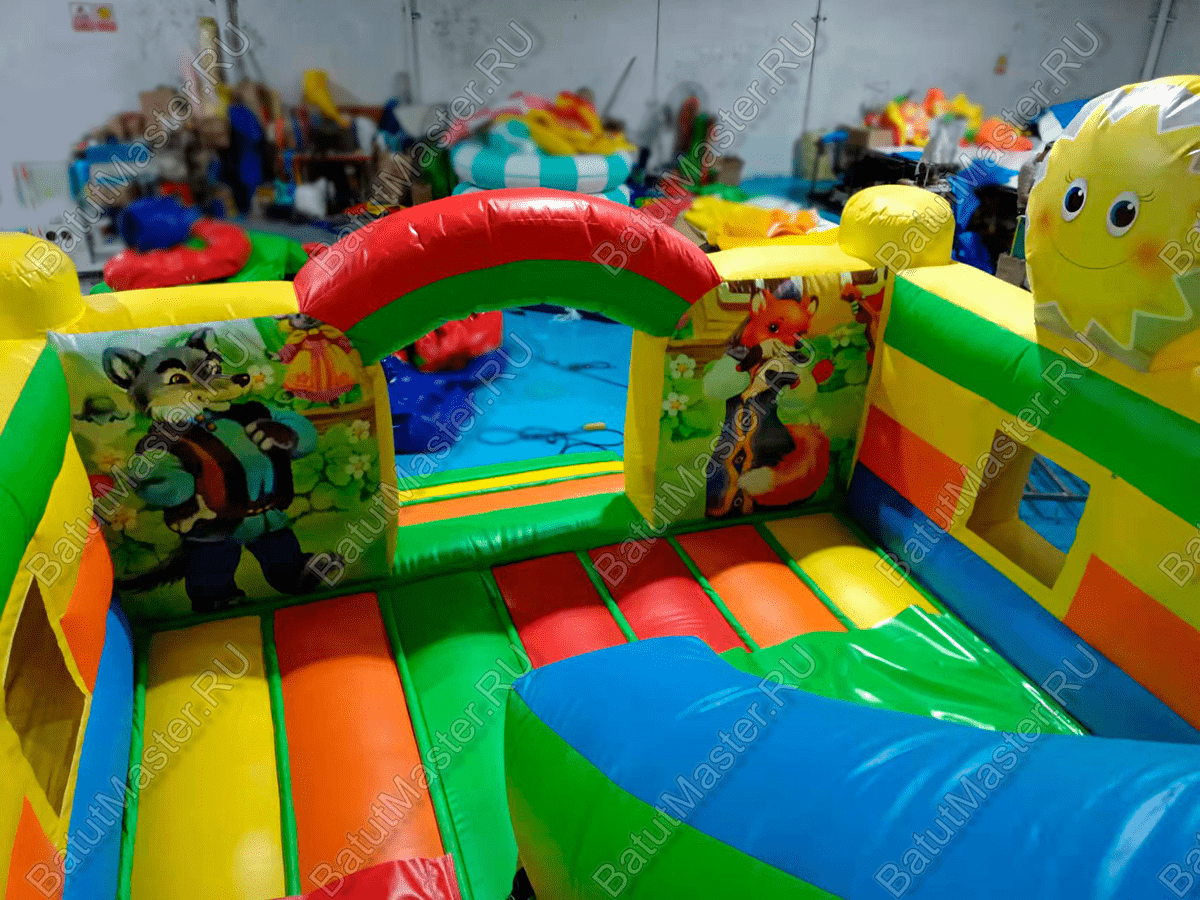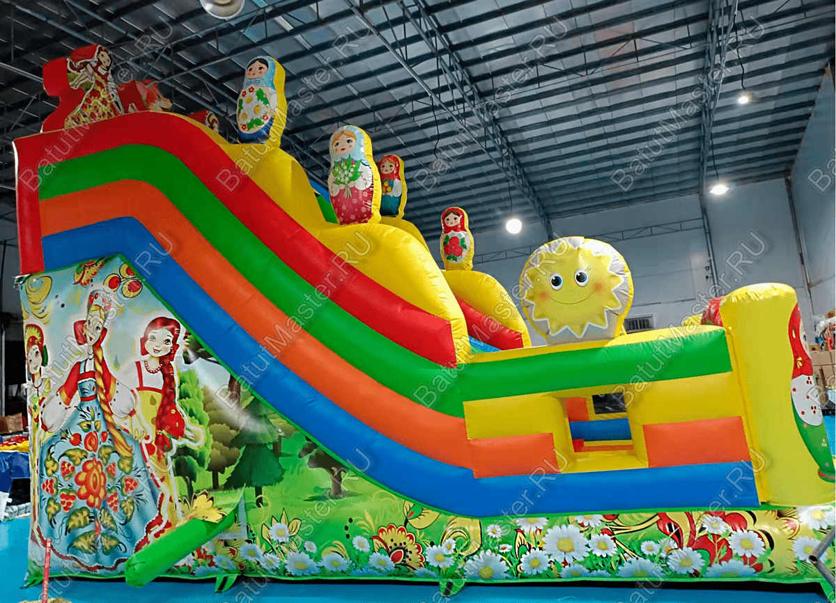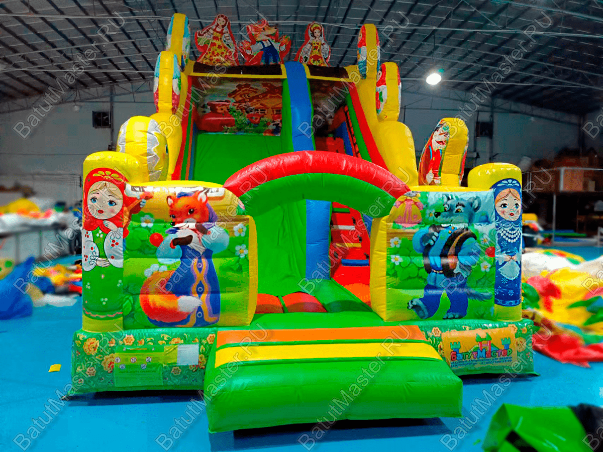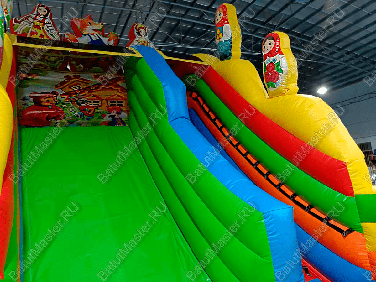 Дизайн батута выполнен в красном, синем, зеленом и желтом цветах. На верхней части стенок установлены надувные фигуры знакомые каждому – солнышко, матрешка, девица-красавица, лиса и медведь, а также другие персонажи русского фольклора. Основные развлекательные элементы: