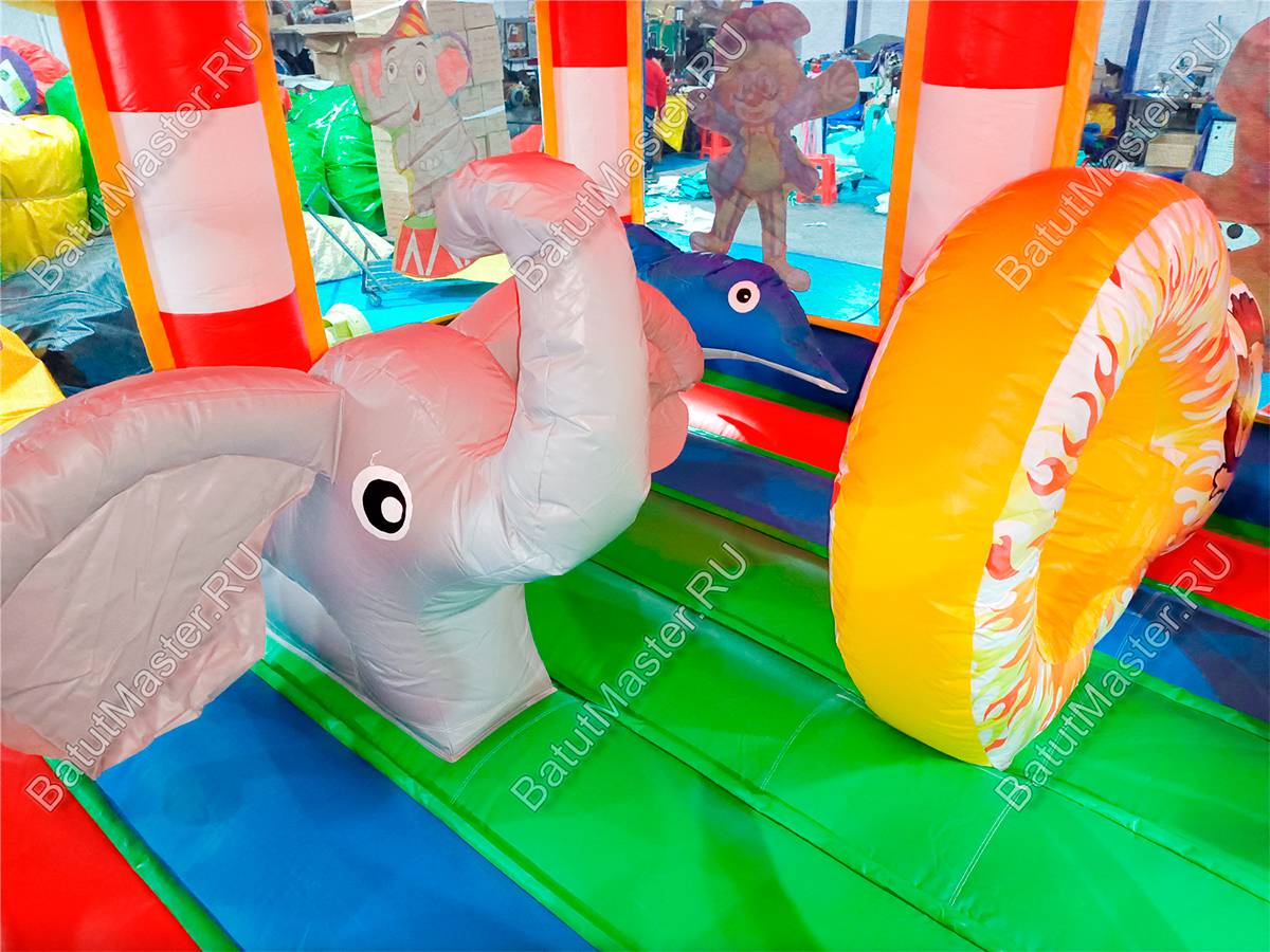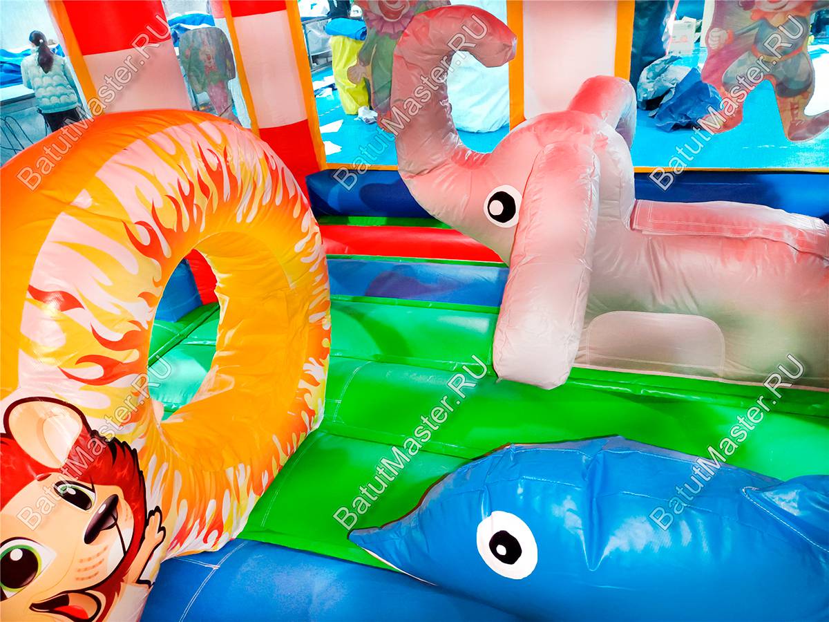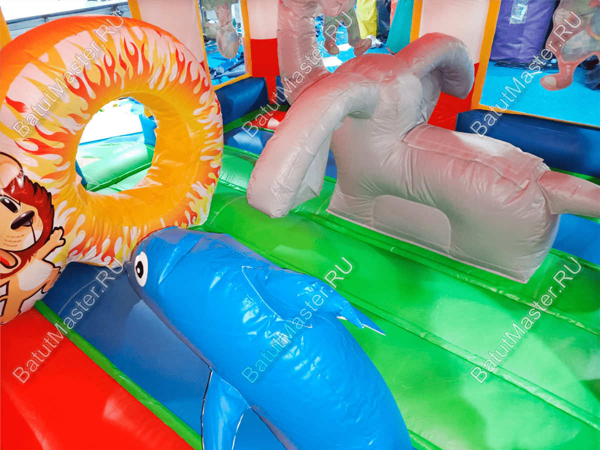 Батут изготовлен из прочного армированного ПВХ — это гарантирует износостойкость и долговечность даже при интенсивной эксплуатации. Яркие цвета устойчивы к выцветанию, а герметичность обеспечивается надежными сварными швами. Внутри размещены животные циркачи, и пролазка-кольцо — создающие веселую и безопасную игровую среду.