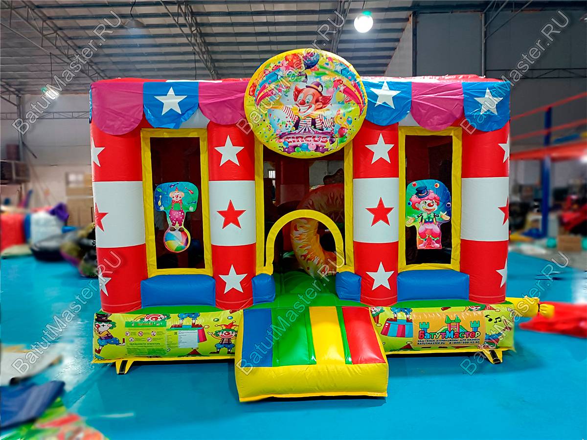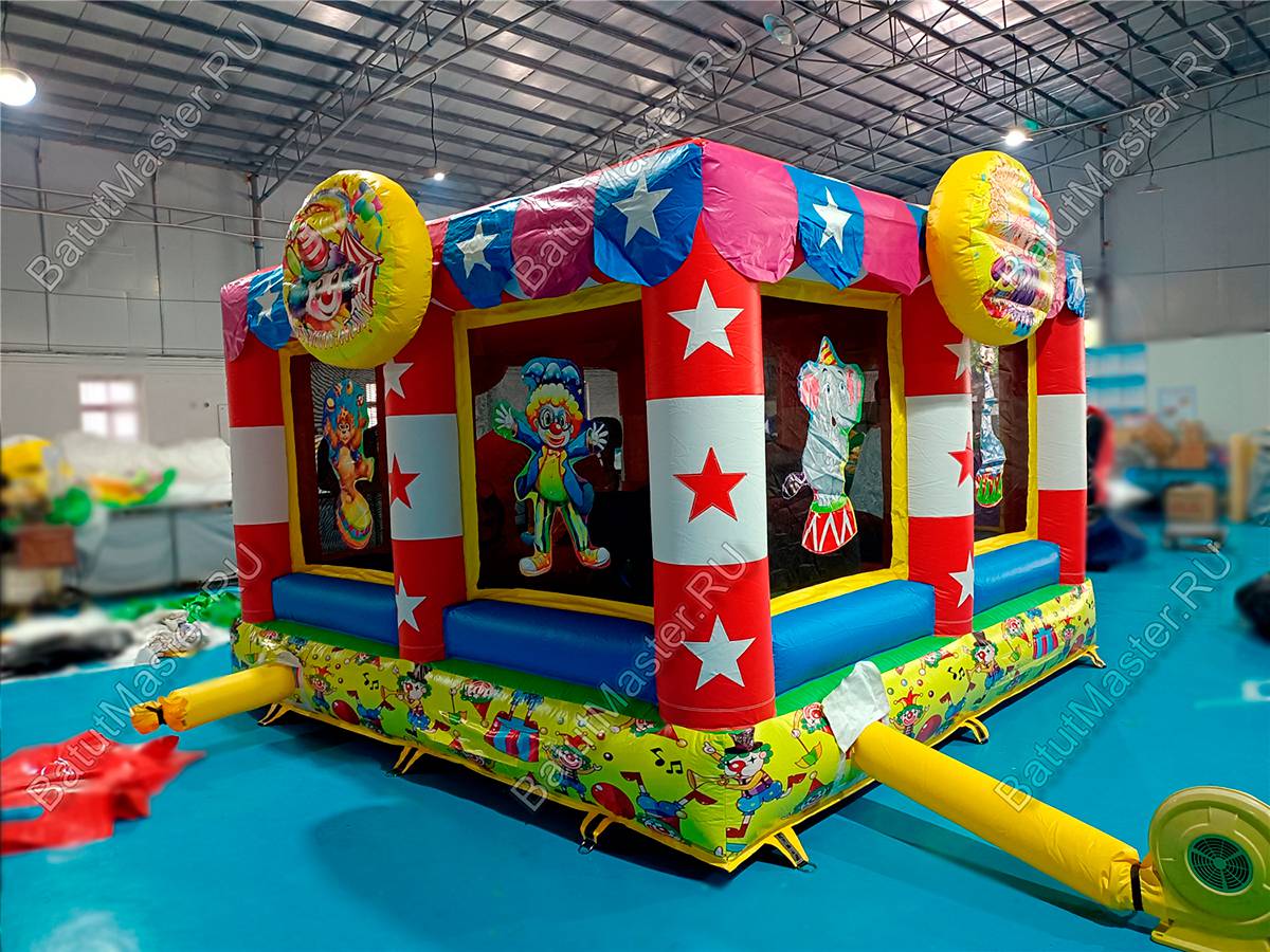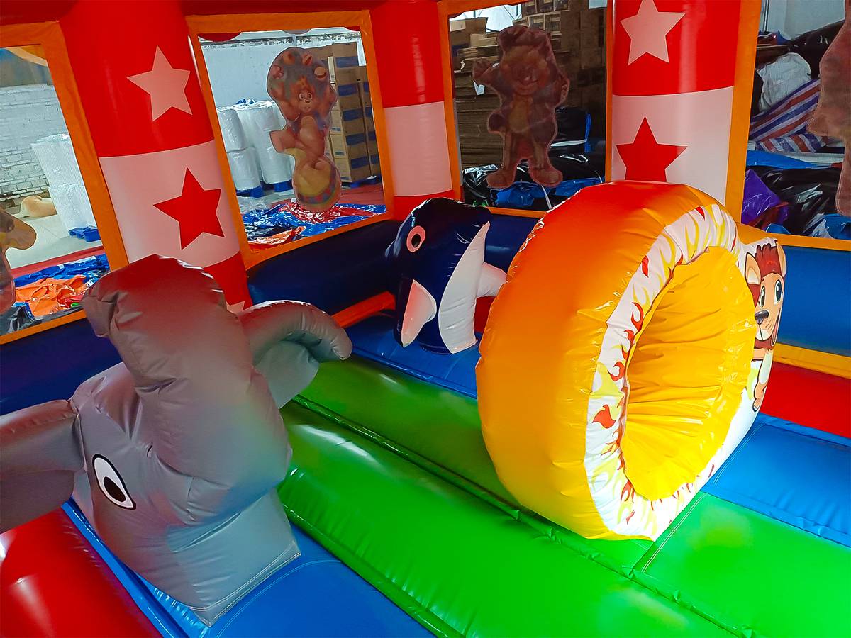 Батут изготовлен из прочного армированного ПВХ — это гарантирует износостойкость и долговечность даже при интенсивной эксплуатации. Яркие цвета устойчивы к выцветанию, а герметичность обеспечивается надежными сварными швами. Внутри размещены животные циркачи, и пролазка-кольцо — создающие веселую и безопасную игровую среду.