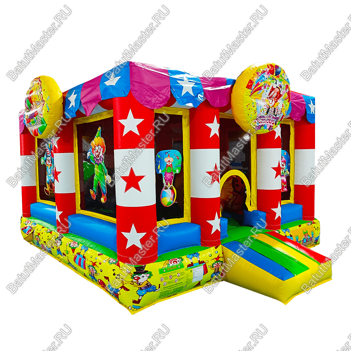 Надувной батут «Шатёр цирка» — это компактный и невероятно красочный аттракцион, созданный для того, чтобы дарить радость детям и приносить прибыль владельцам. Его размеры — 4x4x2,8 м — делают его универсальным для размещения как в крытых помещениях, так и на улице. Благодаря своей праздничной тематике и декоративным элементам (звезды, клоуны, яркая палитра), батут всегда в центре внимания на любом мероприятии.