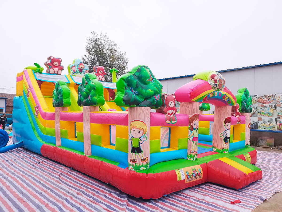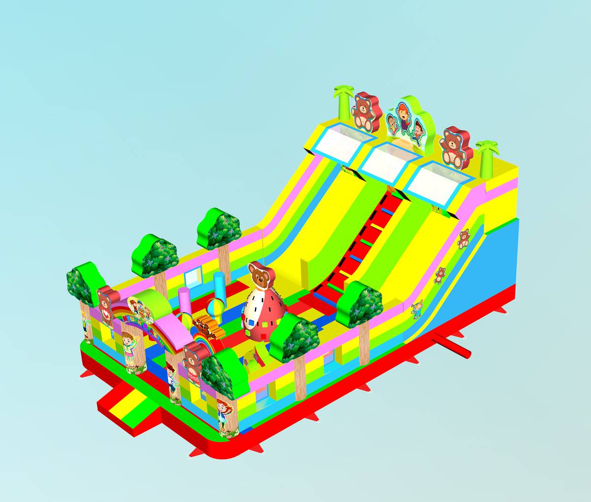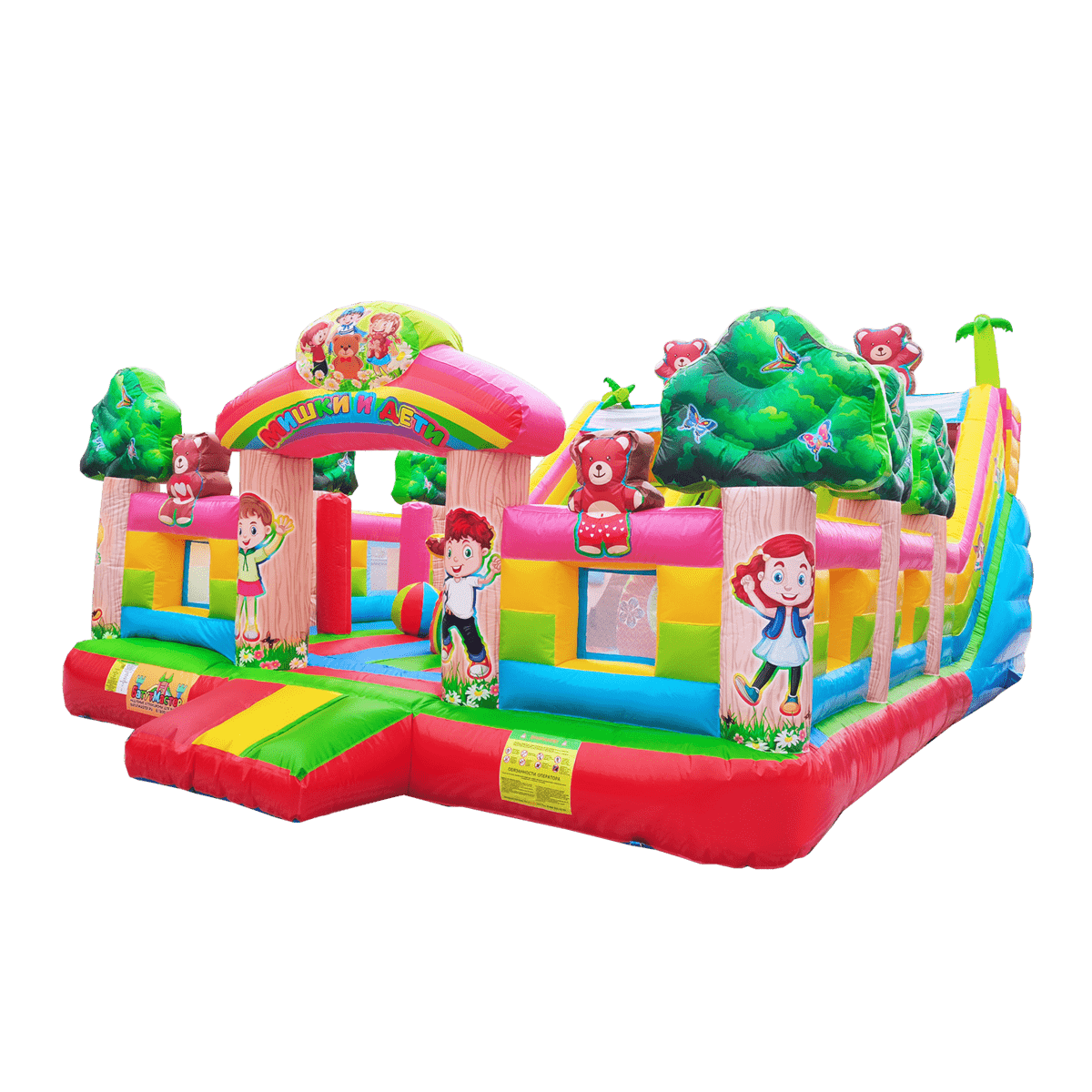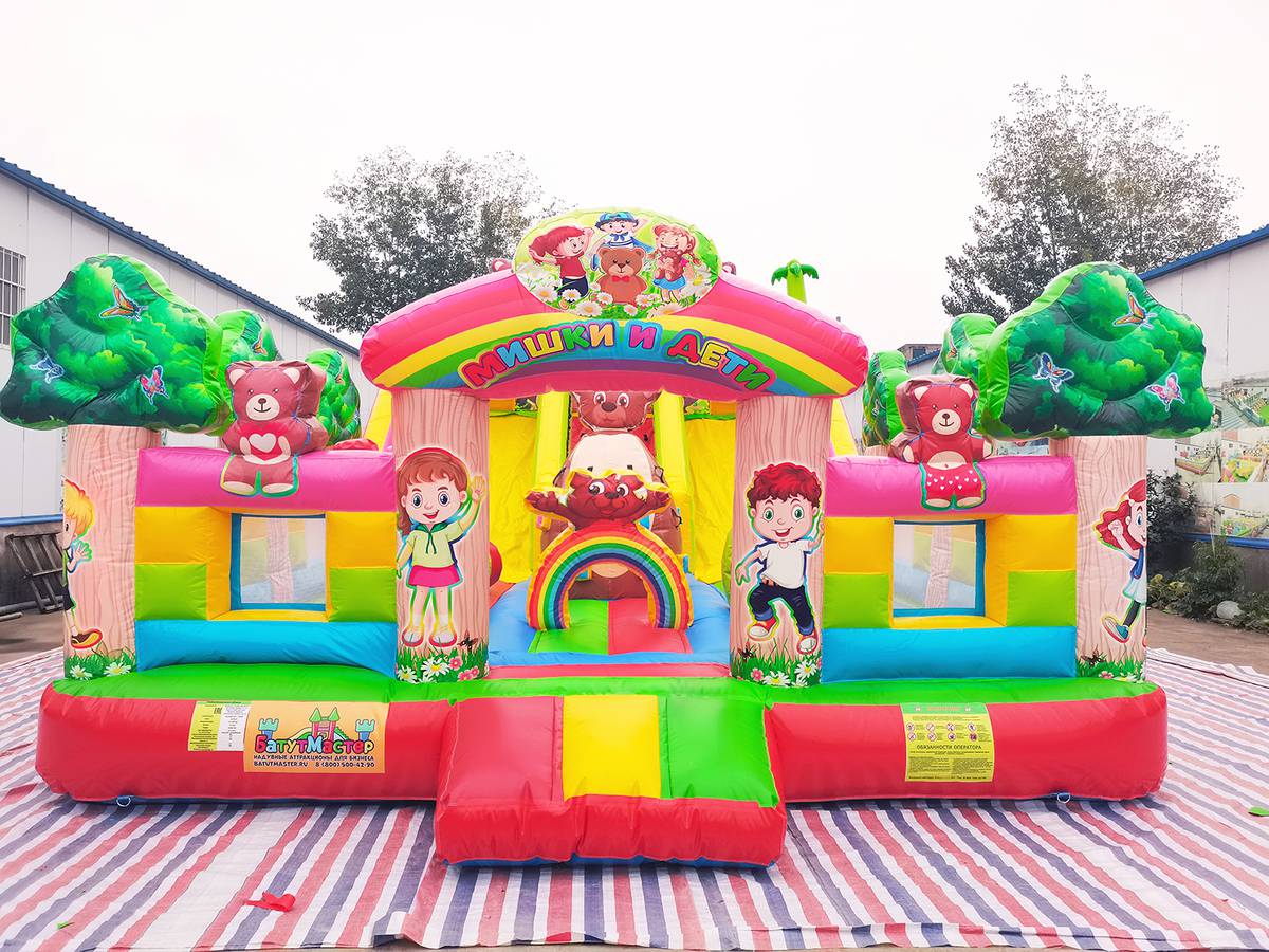 "Мишки и дети" — это не просто батут, а целая развлекательная станция! Он выполнен в форме веселого лесного уголка с надувными деревьями, добрыми мишками, улыбающимися детьми и яркой цветовой гаммой, которая мгновенно притягивает внимание малышей и родителей. Размер батута — 10x6x5 метров, что позволяет разместить до 17 детей одновременно.
