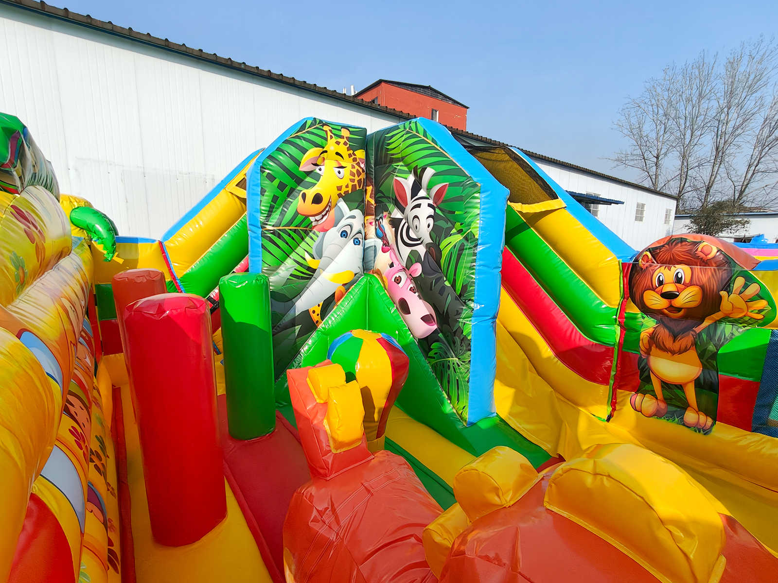 "Сафари-экскурсия" — это не просто батут. Это захватывающее путешествие в мир джунглей, наполненное смехом, прыжками, играми и радостью! Яркие фигуры животных — жираф, лев, обезьяны, попугаи — встречают детей на входе, создавая ощущение настоящего приключения.