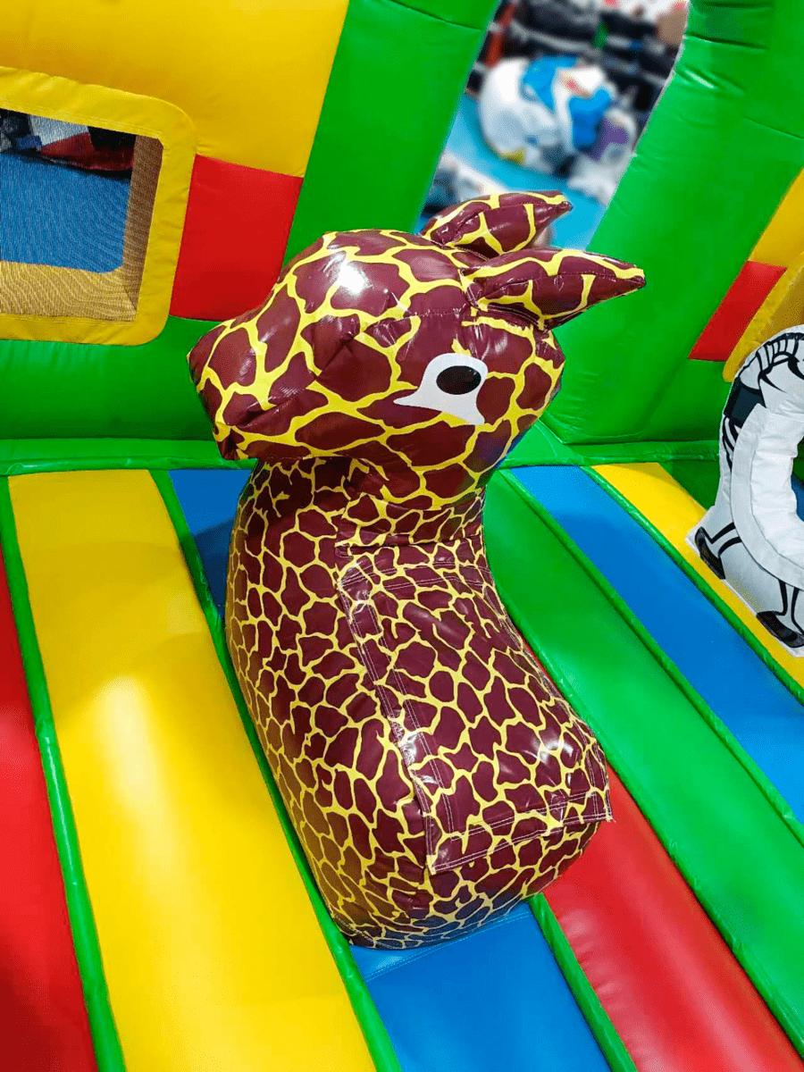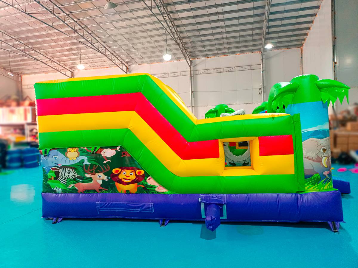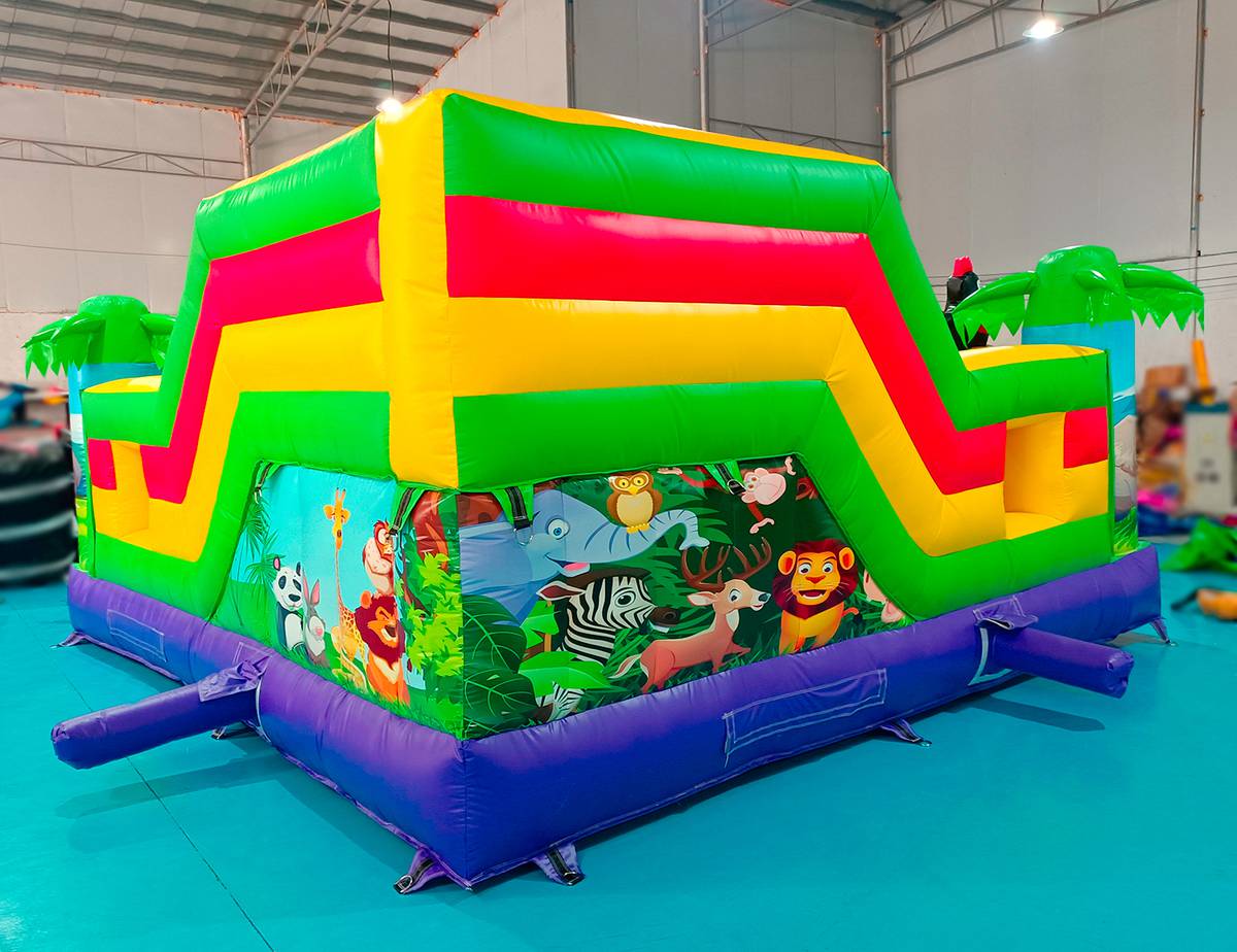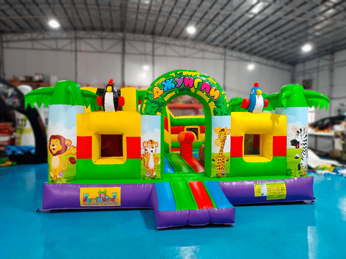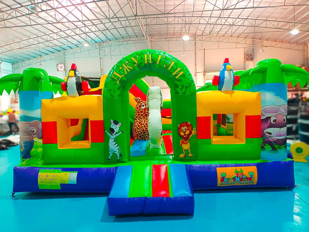Многофункциональный батут в дизайне «Сафари-джунгли ЭКСТРА» с размерами 500х500х250 см вмещает в себя максимальное количество надувных элементов. Коммерческое изделие выполнено в преобладающем зеленом цвете, дополненном синими, желтыми и красными полосами. Попадая внутрь, посетители оказываются в настоящих джунглях, среди милых дики зверушек и пышной растительности.