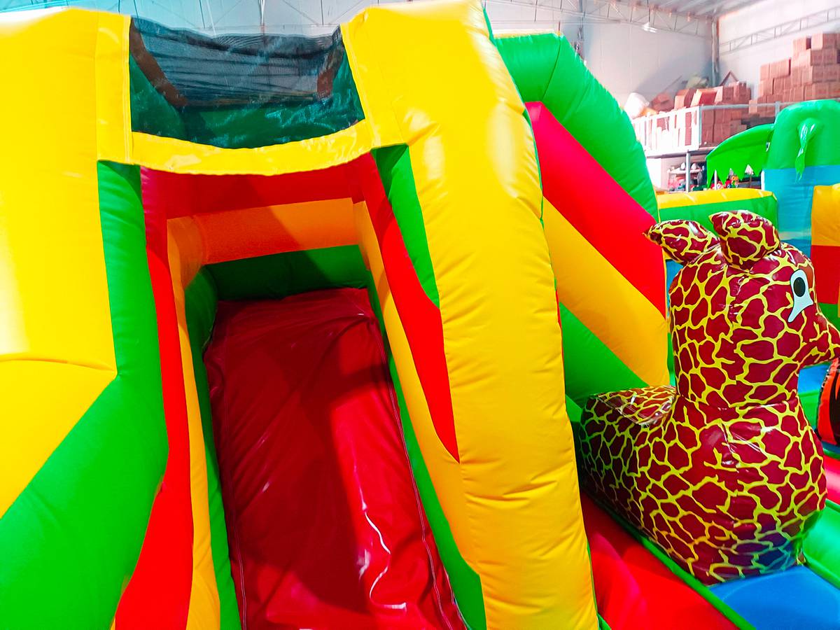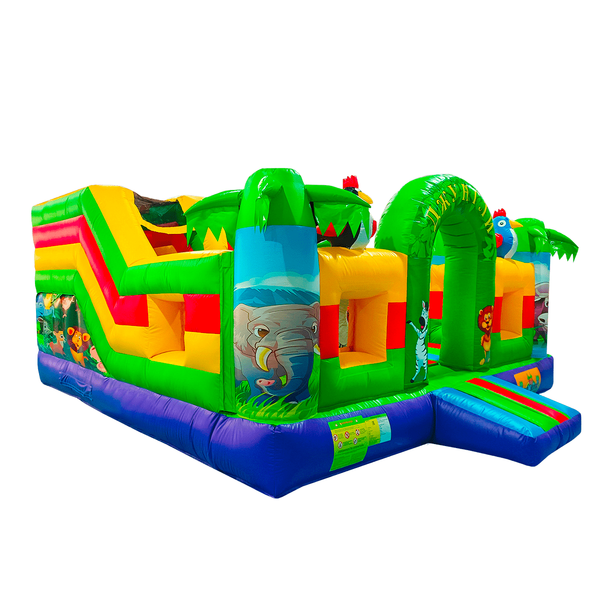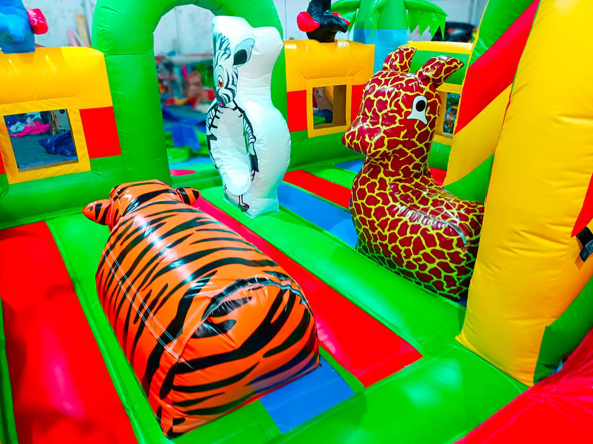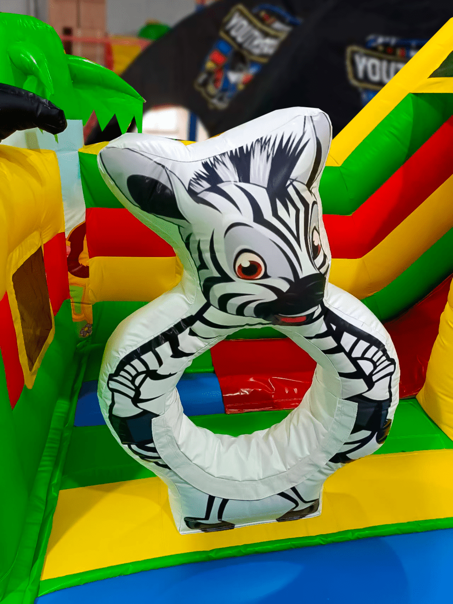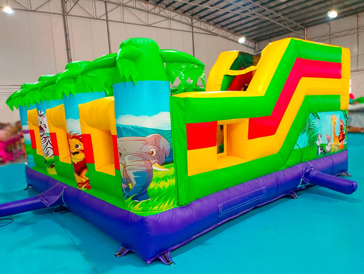 Многофункциональный батут в дизайне «Сафари-джунгли ЭКСТРА» с размерами 500х500х250 см вмещает в себя максимальное количество надувных элементов. Коммерческое изделие выполнено в преобладающем зеленом цвете, дополненном синими, желтыми и красными полосами. Попадая внутрь, посетители оказываются в настоящих джунглях, среди милых дики зверушек и пышной растительности.