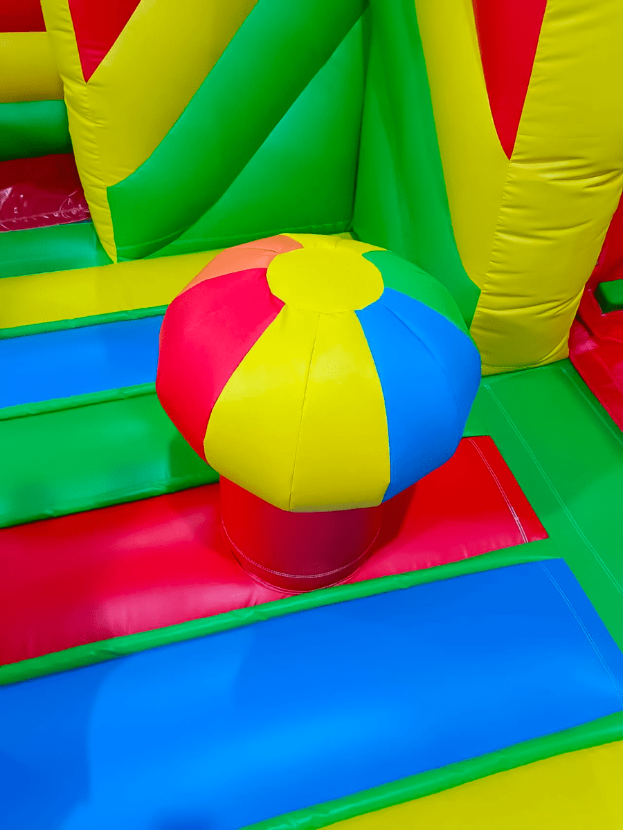 Над входом устроена высокая арка, по краям «растут» раскидистые пальмы, а между ними окна. Все проймы защищены прочной сеткой, сквозь которую проникает воздух и свободно циркулирует по площадке. Игровой батут, выполненный в дизайне «Сафари-джунгли ЭКСТРА» оснащен такими надувными элементами как: