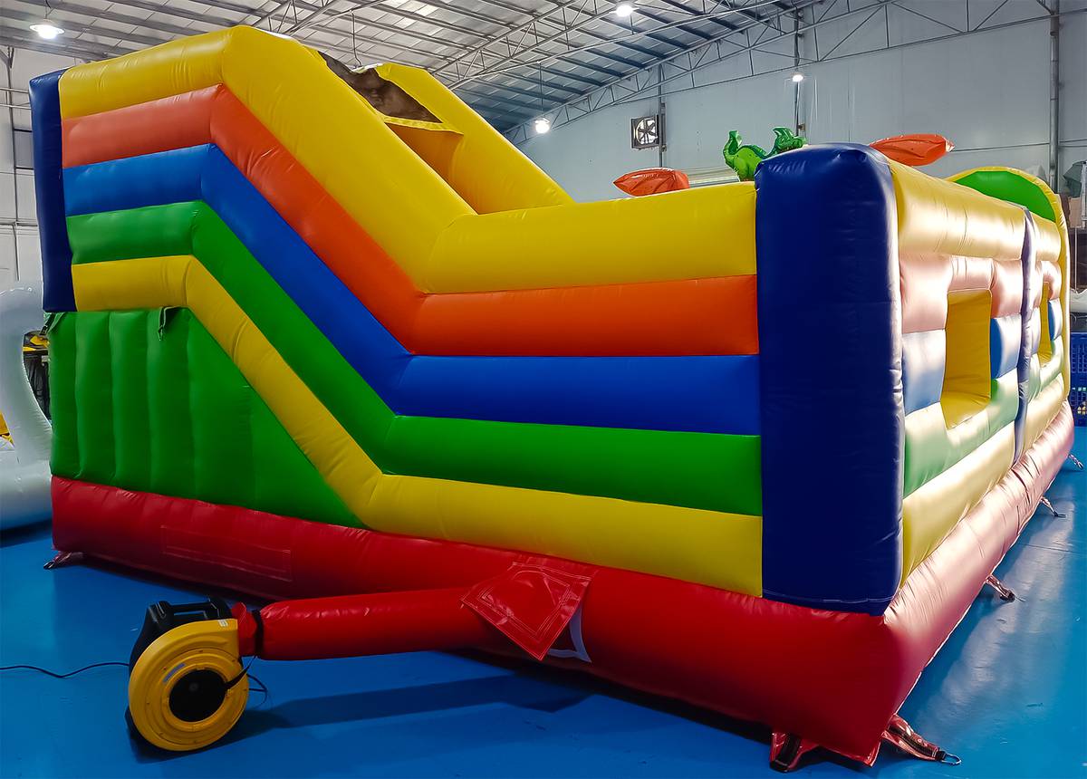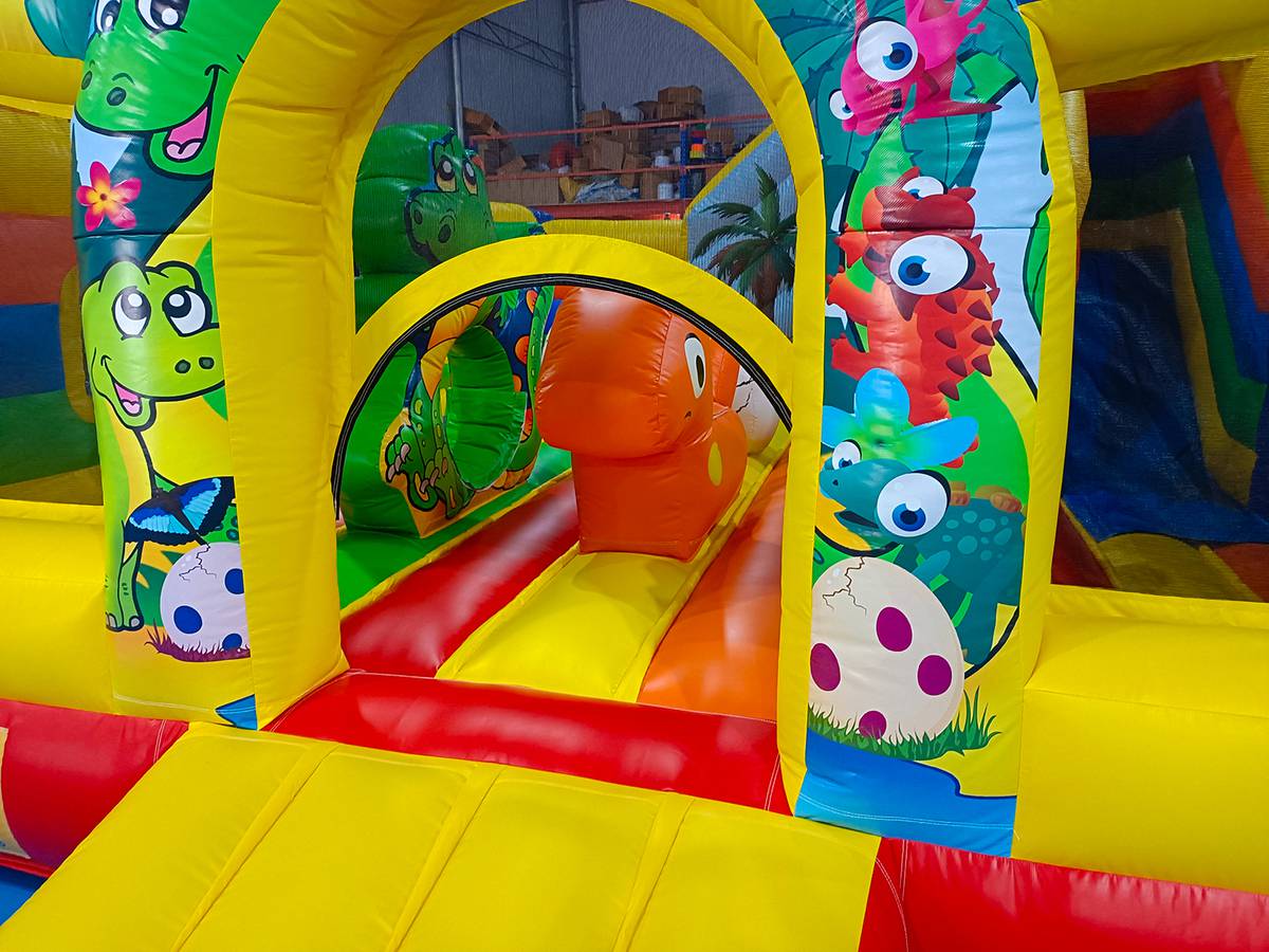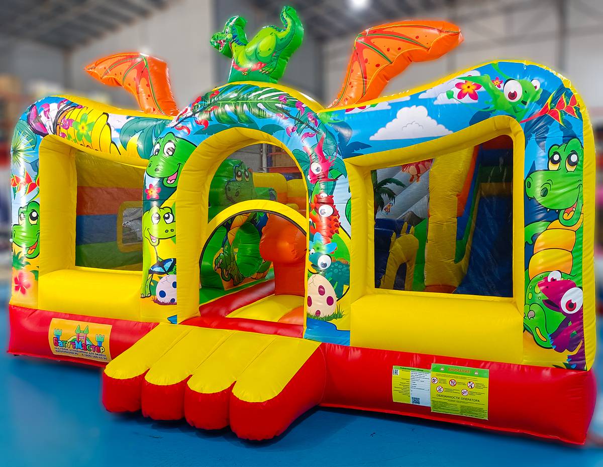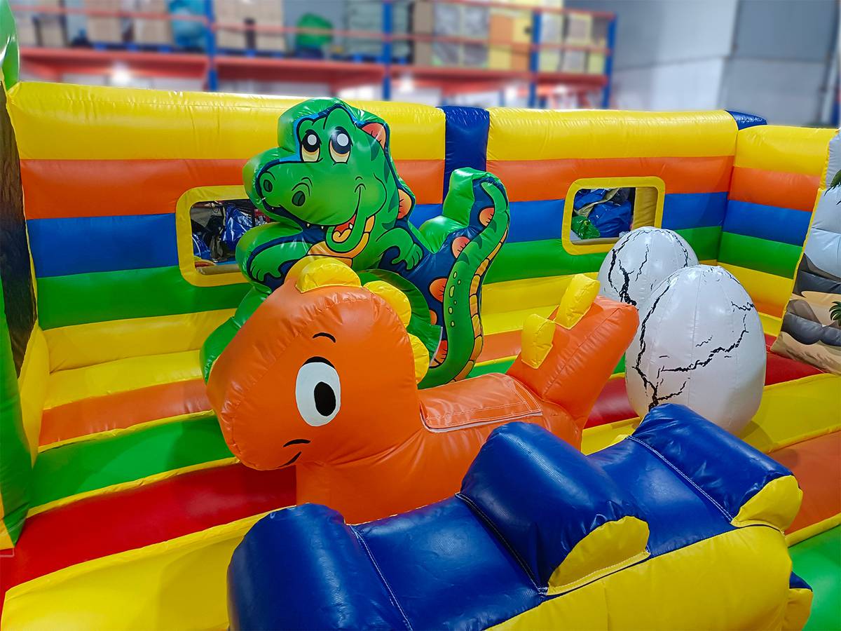 С размерами 6x5x2.9 метра в батуте распологается полноценная игровая площадка для прыжков, веселая горка (стартовая высота 1 м) и надувные дино. Все это делает игру не просто активной, но ещё и развивающей. Батут рассчитан на одновременное пребывание до 9 детей, что делает его идеальным для коммерческого использования с быстрой окупаемостью.
