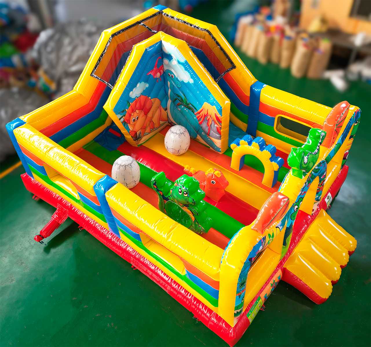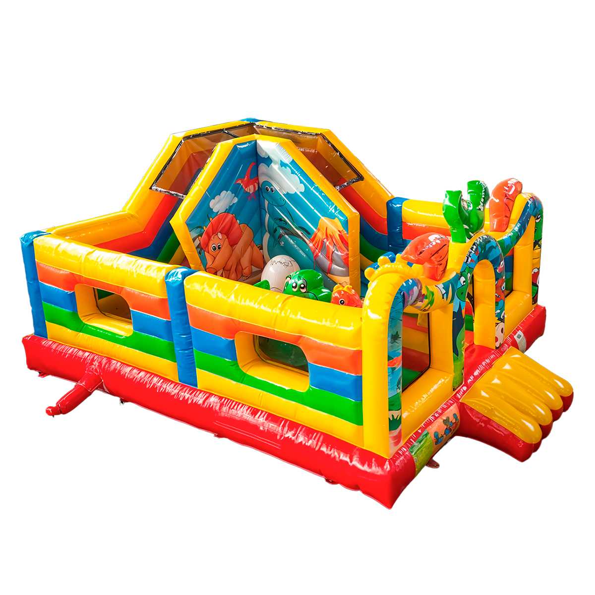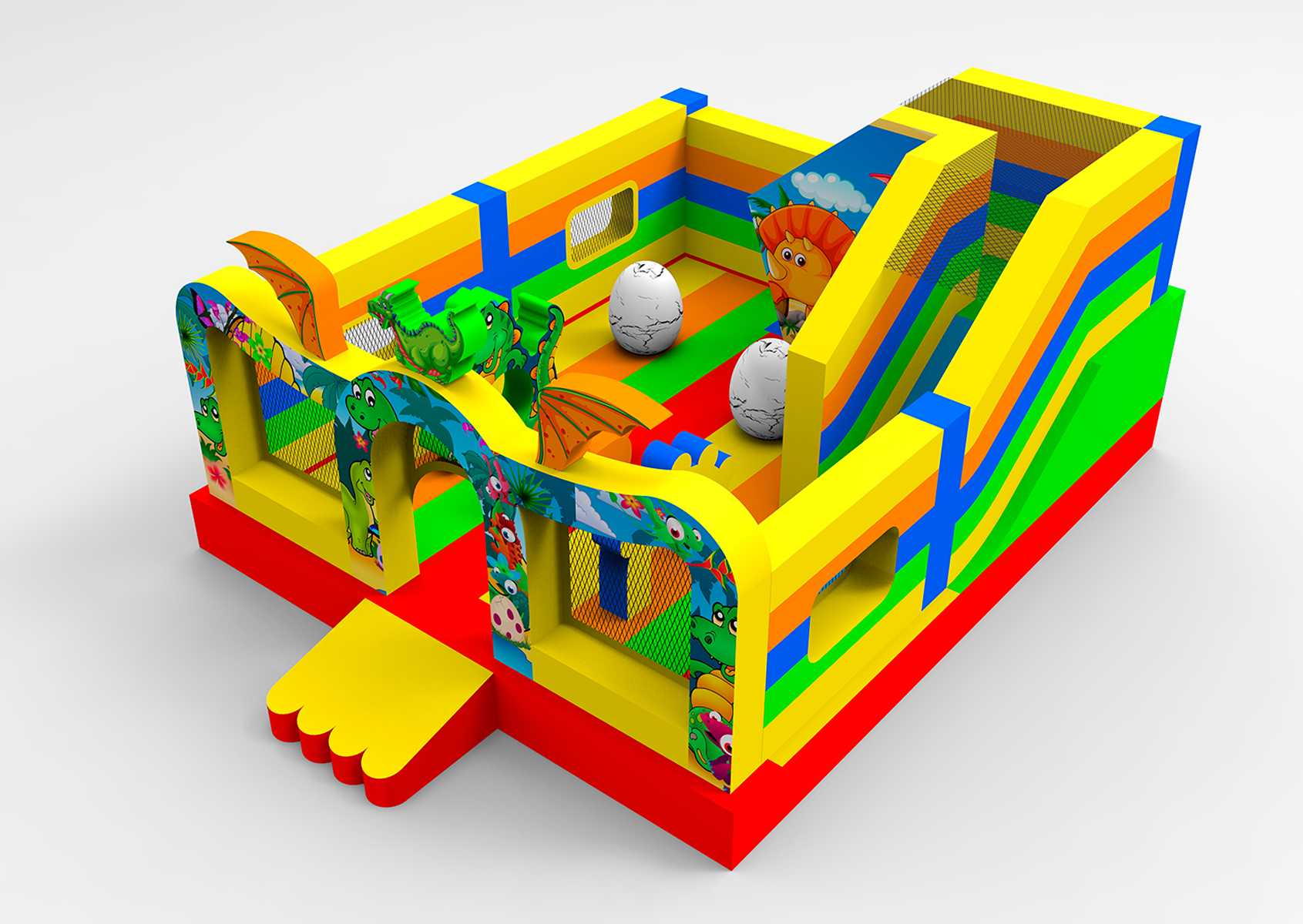 С размерами 6x5x2.9 метра в батуте распологается полноценная игровая площадка для прыжков, веселая горка (стартовая высота 1 м) и надувные дино. Все это делает игру не просто активной, но ещё и развивающей. Батут рассчитан на одновременное пребывание до 9 детей, что делает его идеальным для коммерческого использования с быстрой окупаемостью.
