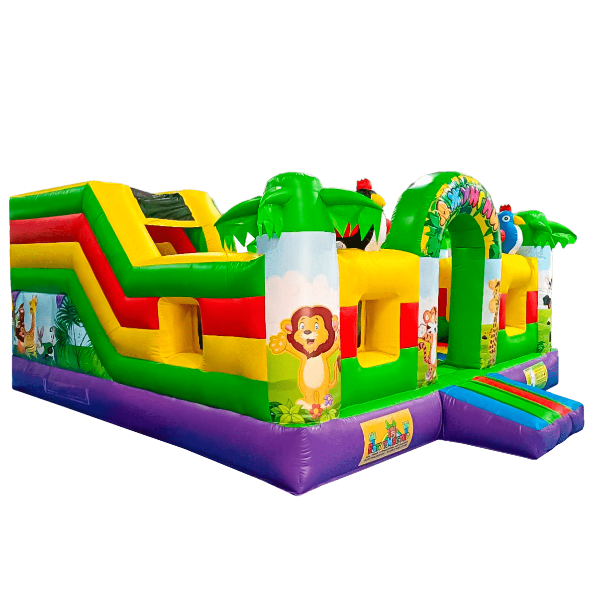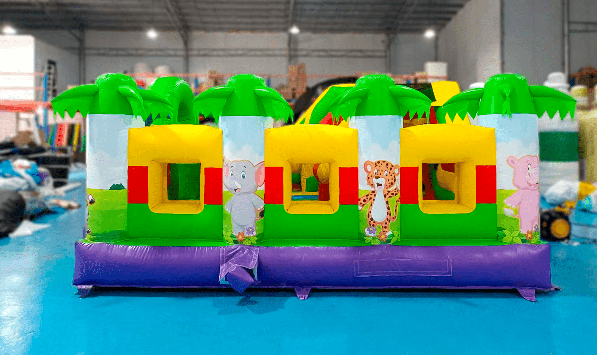 Многофункциональный батут в дизайне «Сафари-джунгли ЭКСТРА» с размерами 500х500х250 см вмещает в себя максимальное количество надувных элементов. Коммерческое изделие выполнено в преобладающем зеленом цвете, дополненном синими, желтыми и красными полосами. Попадая внутрь, посетители оказываются в настоящих джунглях, среди милых диких зверушек и пышной растительности.