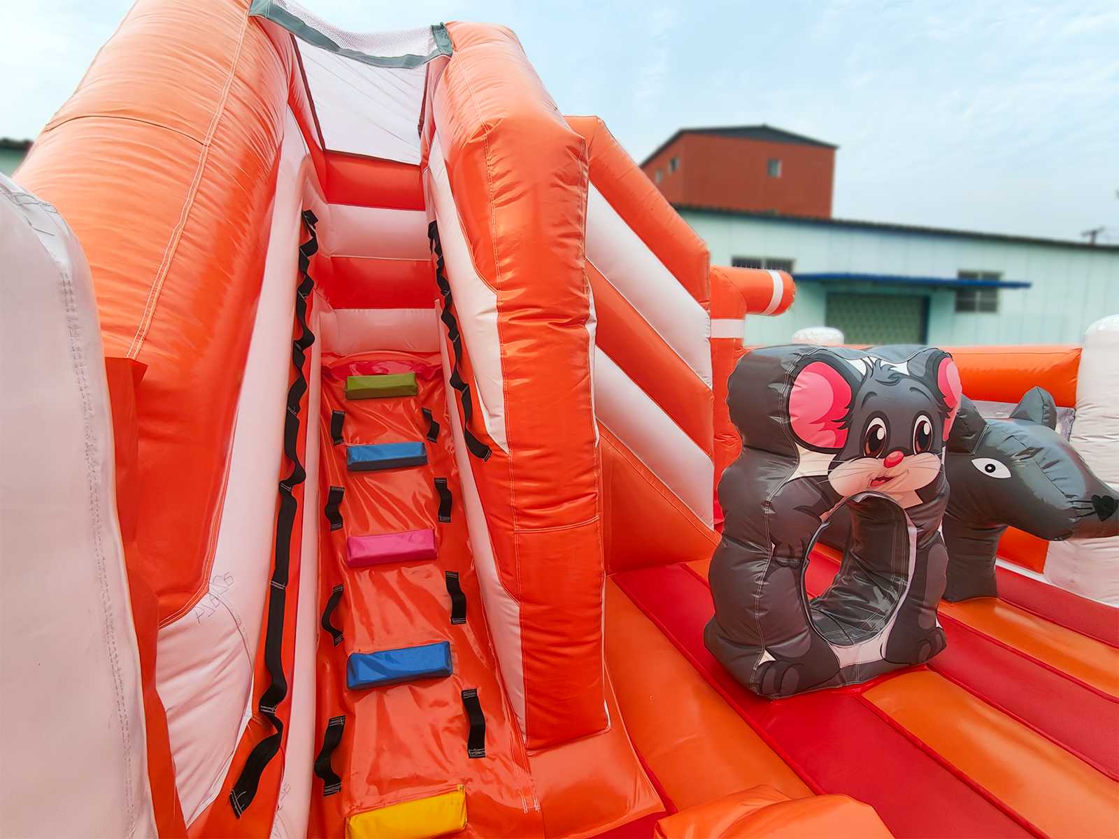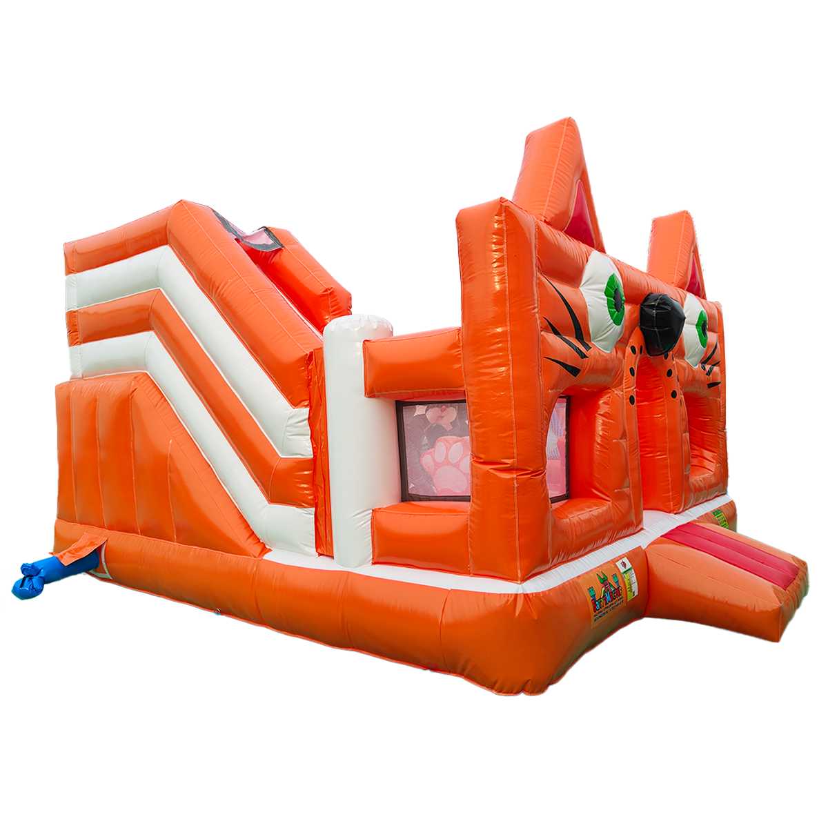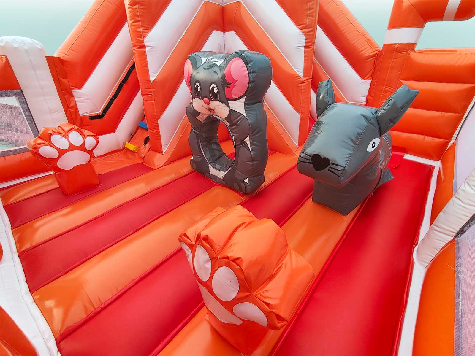 Вопрос безопасности — ключевой при выборе надувного аттракциона. «Веселый кот» спроектирован с учетом всех норм ТР ЕАЭС 038/2016 и ГОСТ Р 53487-2009. Вход оформлен в виде «пасти» кота, окруженной надувными стенами и защитной сеткой. Высота горки начинается с безопасных 1,8 м, а основное игровое пространство надежно защищено от выпадений.