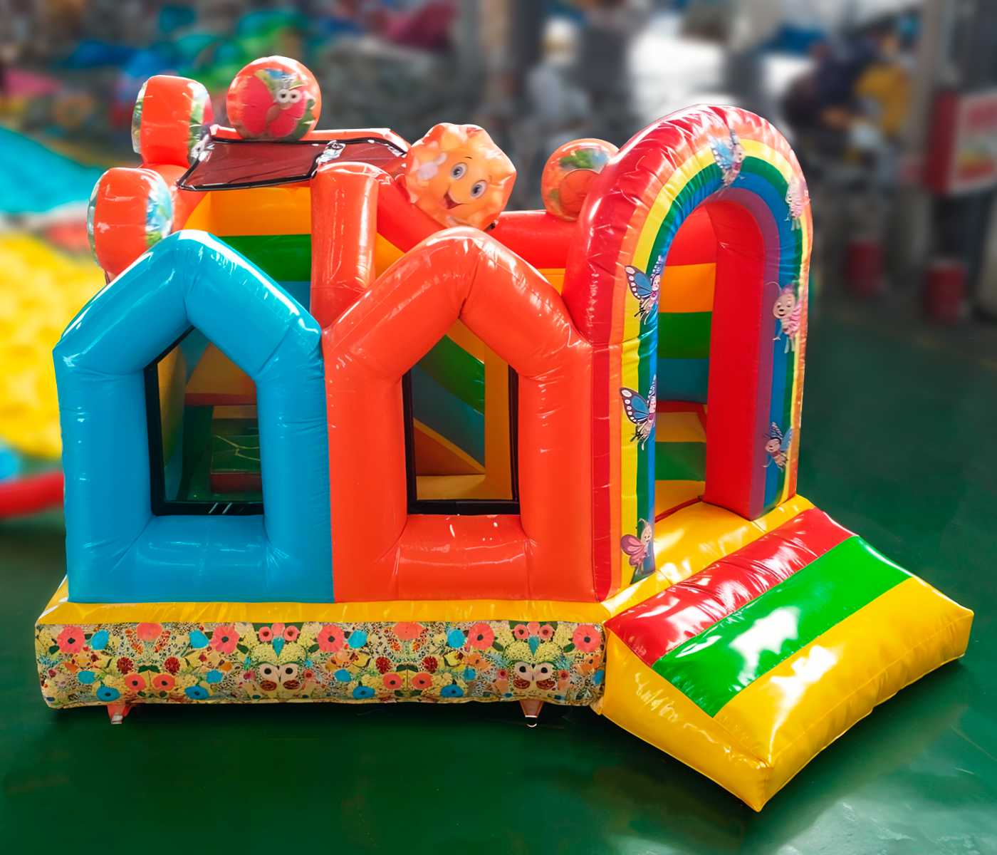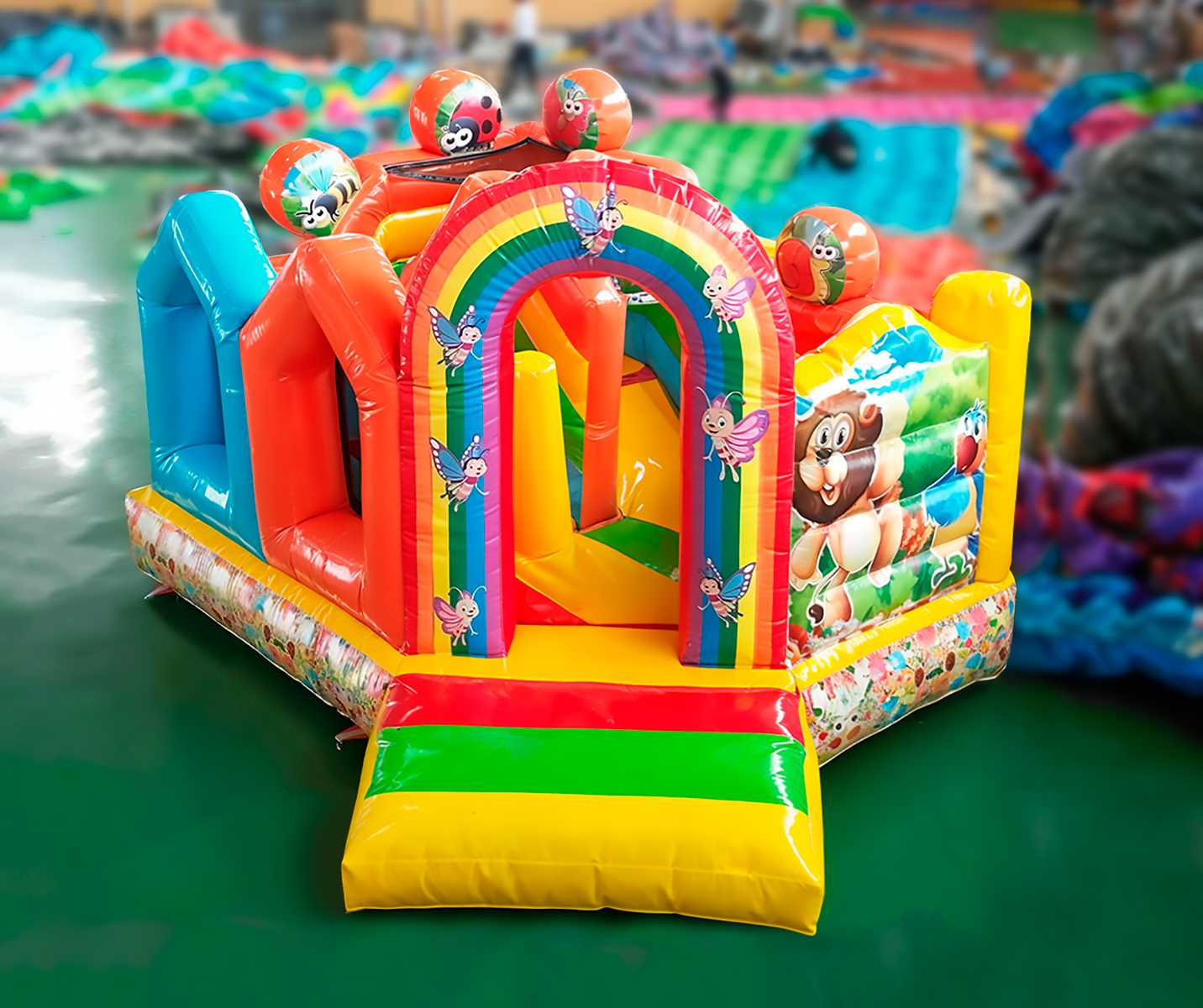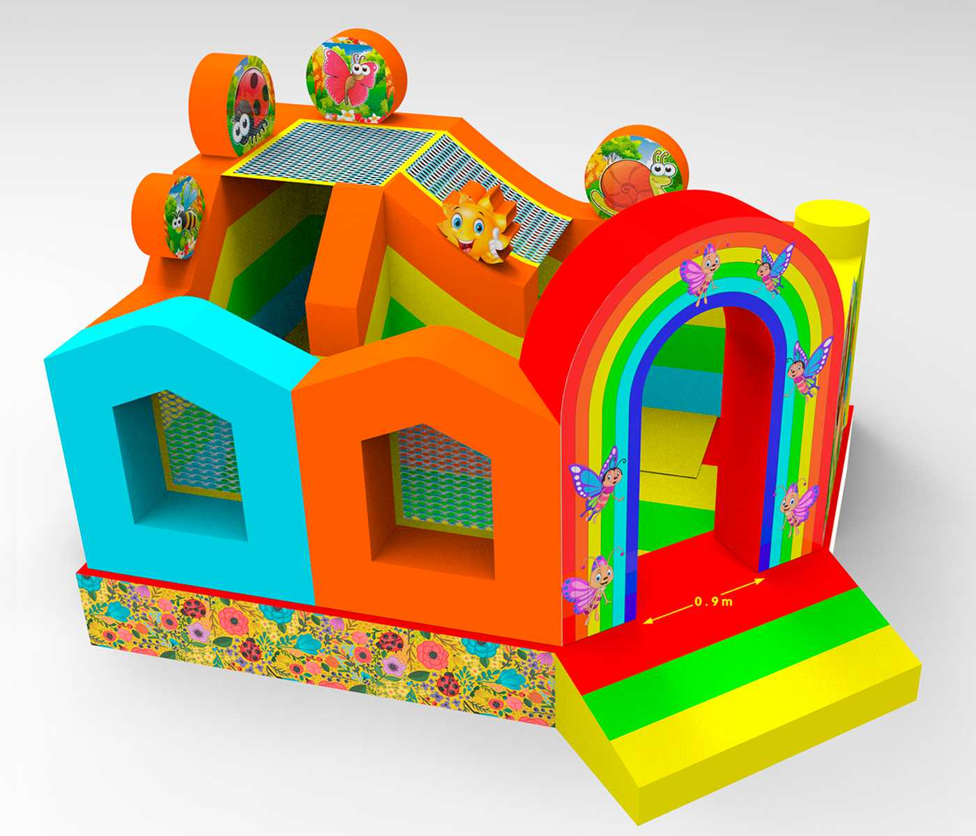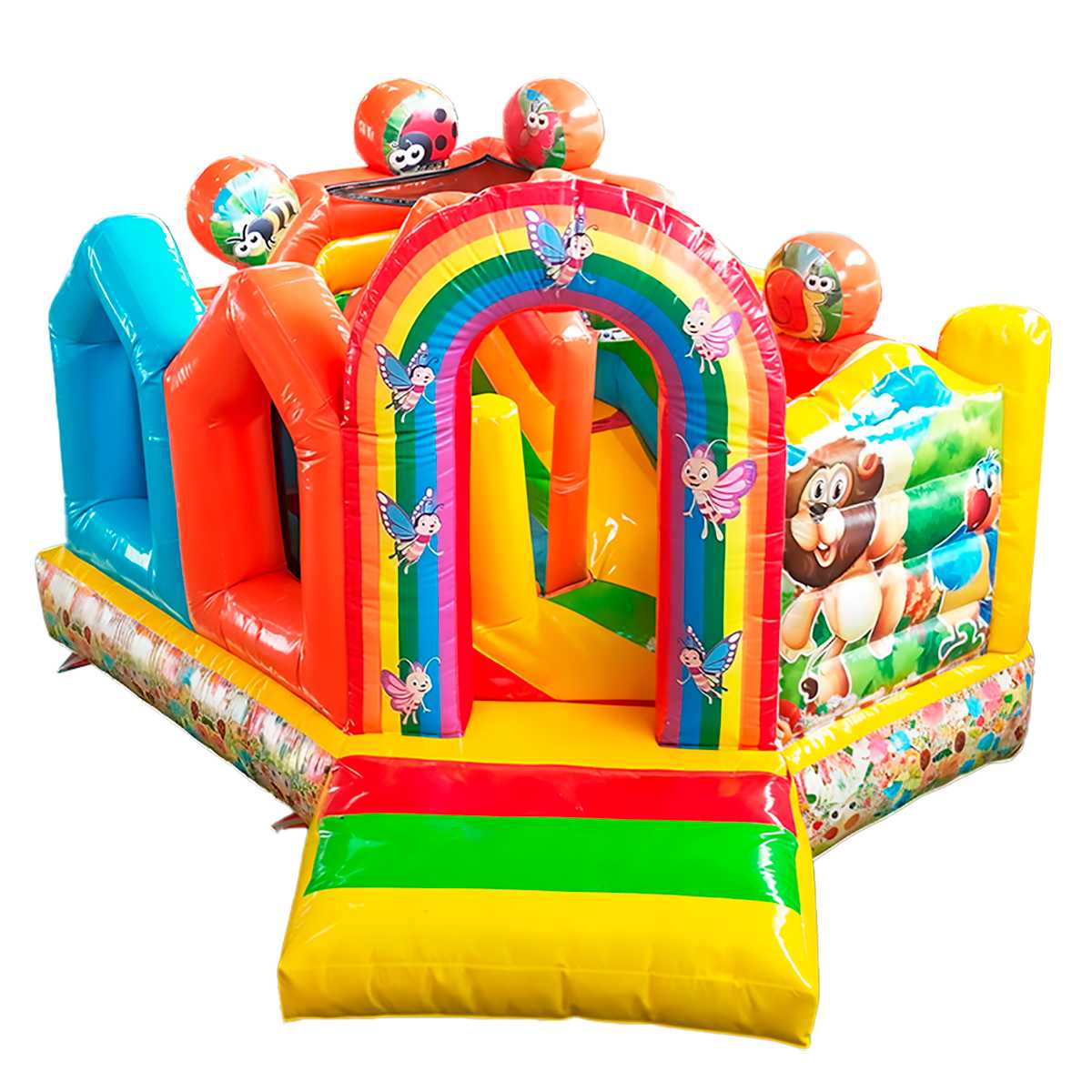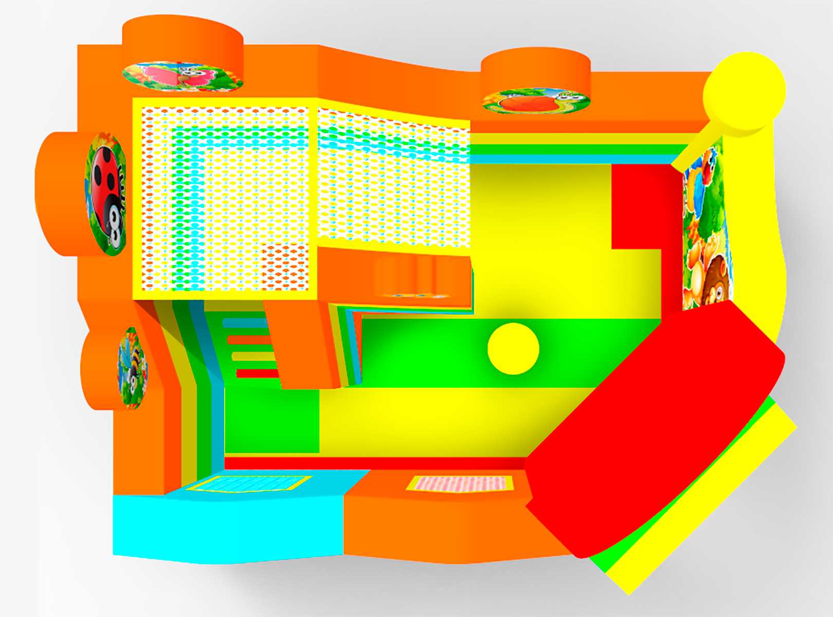 Батут «Друзья-зверята» — это полноценная мини-страна волшебства, где детей встречают сказочные зверята, бабочки, пчёлки и улыбающиеся божьи коровки. Центральный вход украшен радужной аркой, задающей позитивное настроение. Внутри — игровое пространство с арками, мягкими препятствиями, горкой и местом для активных прыжков и бега. Дизайн разработан так, чтобы батут моментально привлекал внимание и вызывал у детей восторг, а у родителей — доверие.