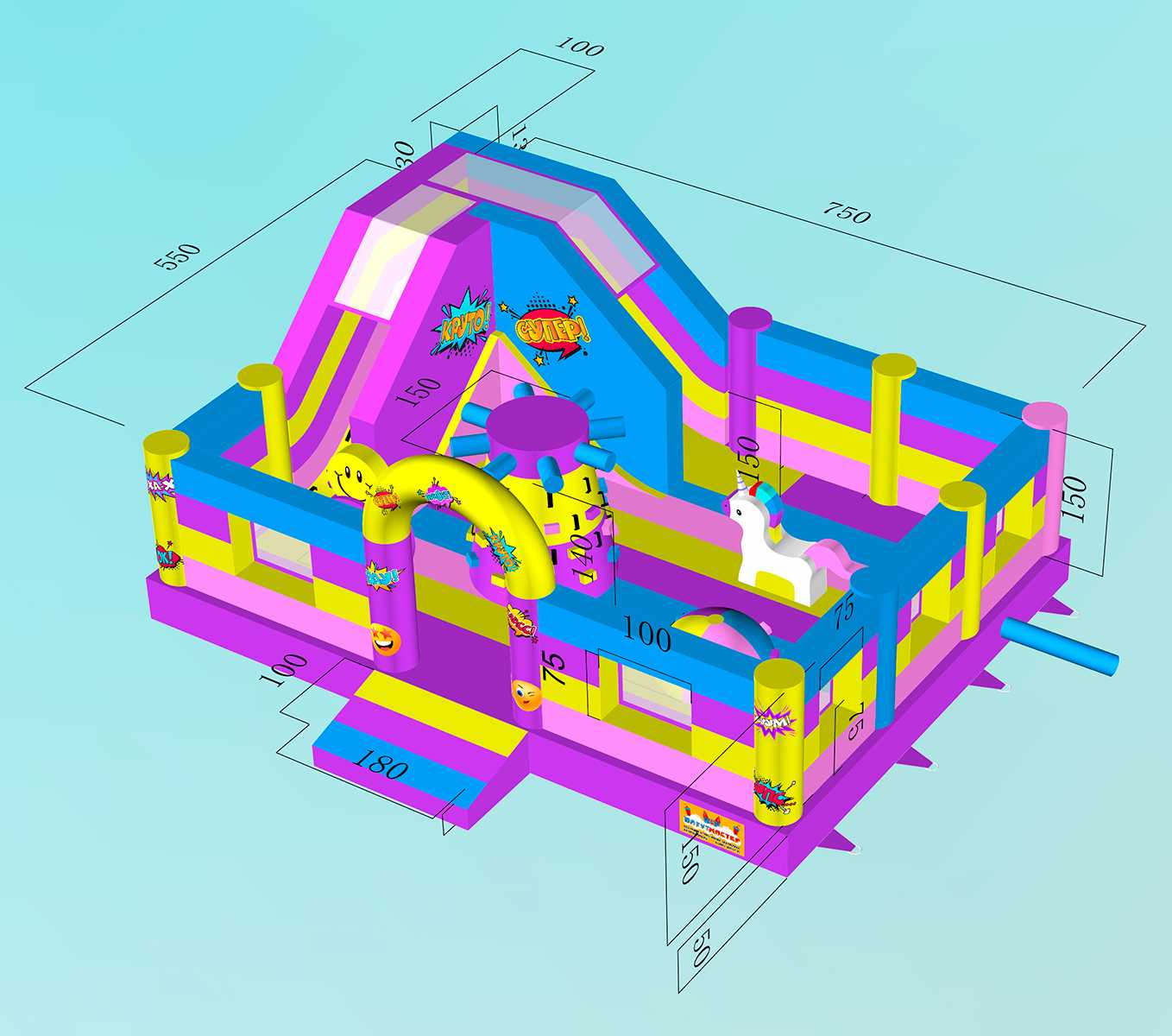 Этот батут идеально подходит для активных детей от 3 до 10 лет. Его можно установить в ТЦ, в парке развлечений, на любом открытом или закрытом пространстве. Благодаря яркому дизайну в стиле комиксов, батут станет центром внимания на любом детском празднике или дне рождения.