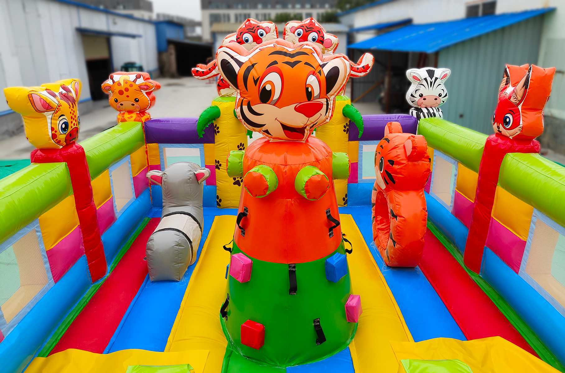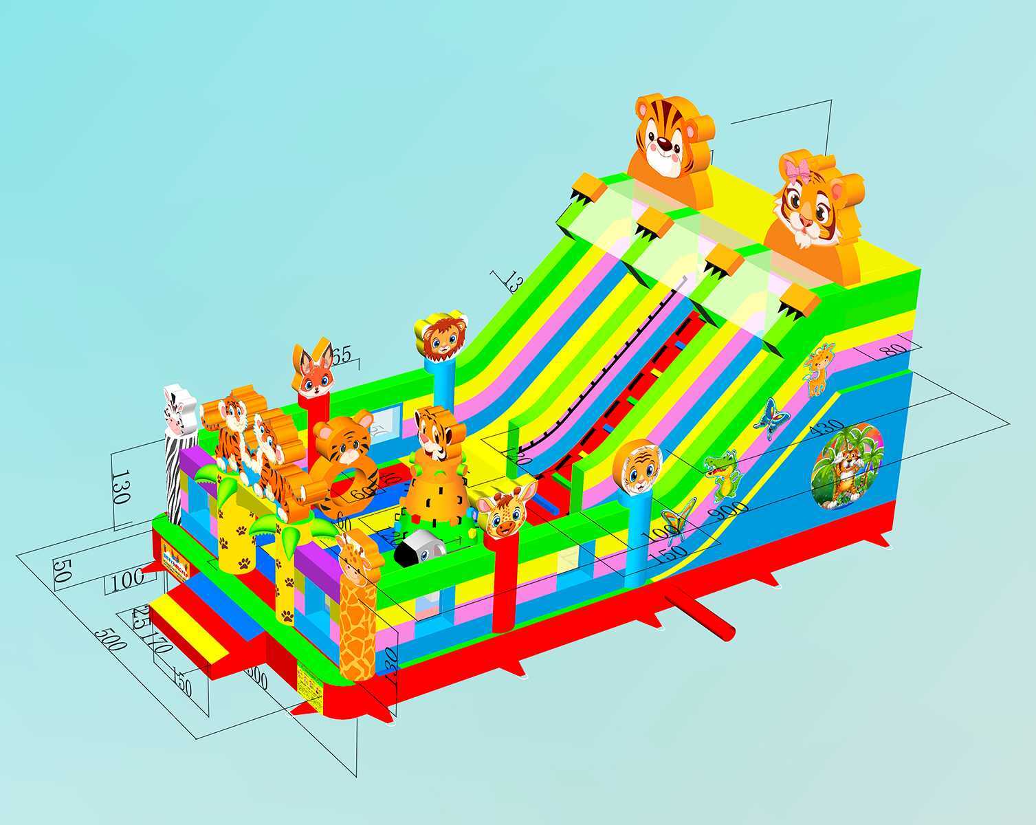 Коммерческий батут «Тигриная страна 4» 9x5x5 м — это не просто детский надувной аттракцион, а настоящее джунглевое приключение. Его оформление вдохновлено миром дикой природы: фигуры зверей, зелень, декоративные деревья, арки и игровые препятствия создают эффект полного погружения в атмосферу экзотики. Дети получают возможность не просто прыгать, а участвовать в воображаемых играх и сюжетах.