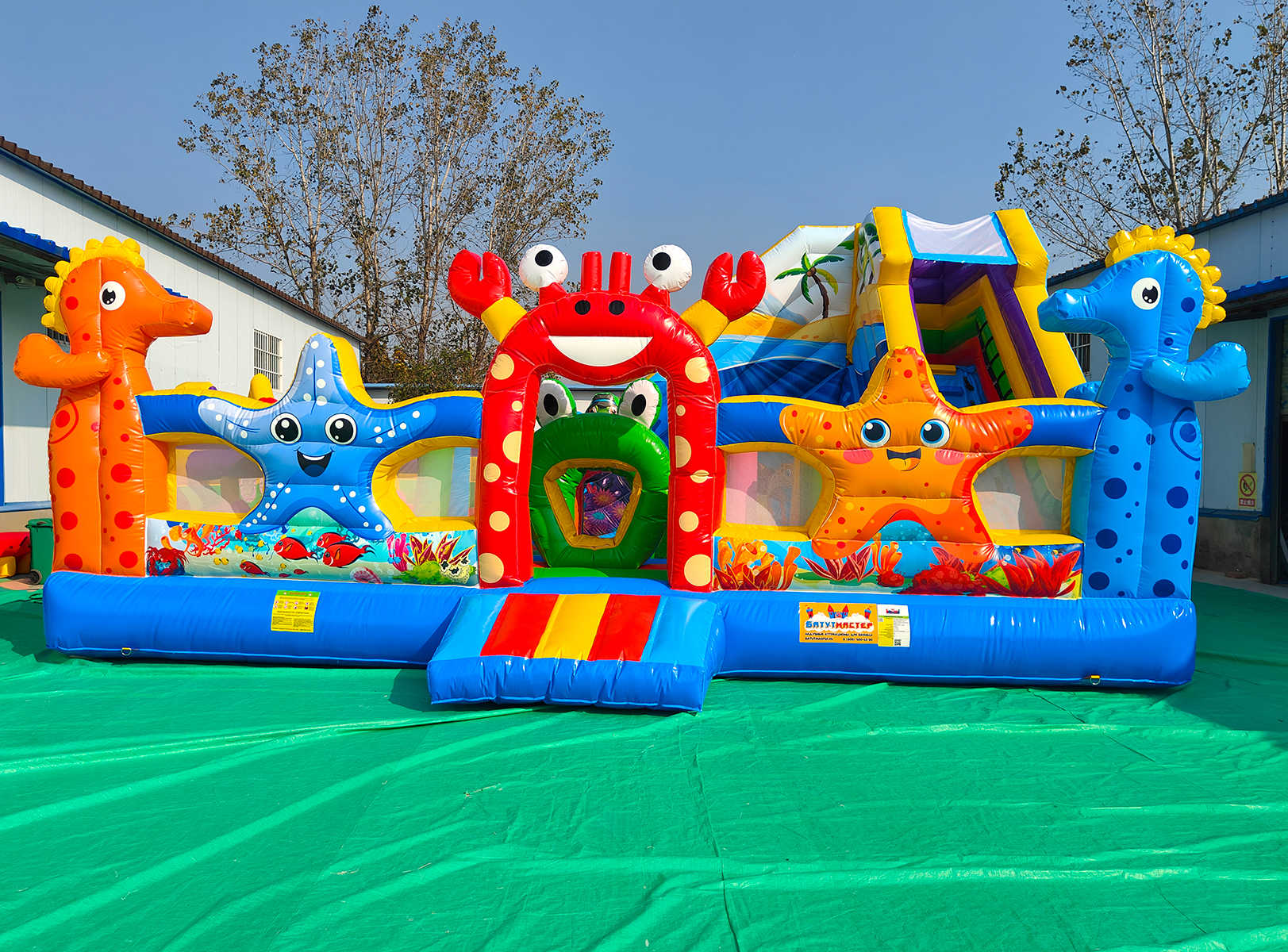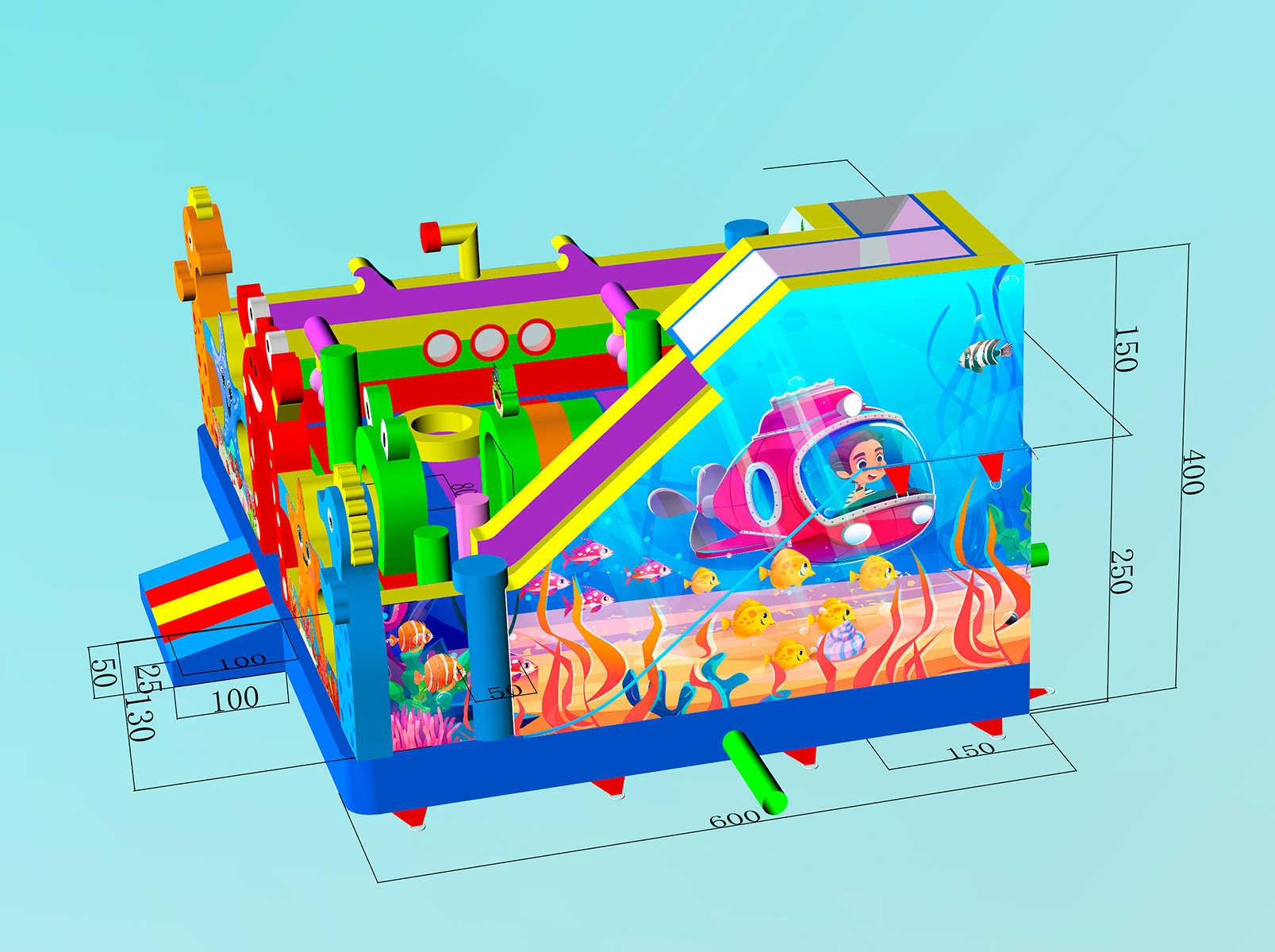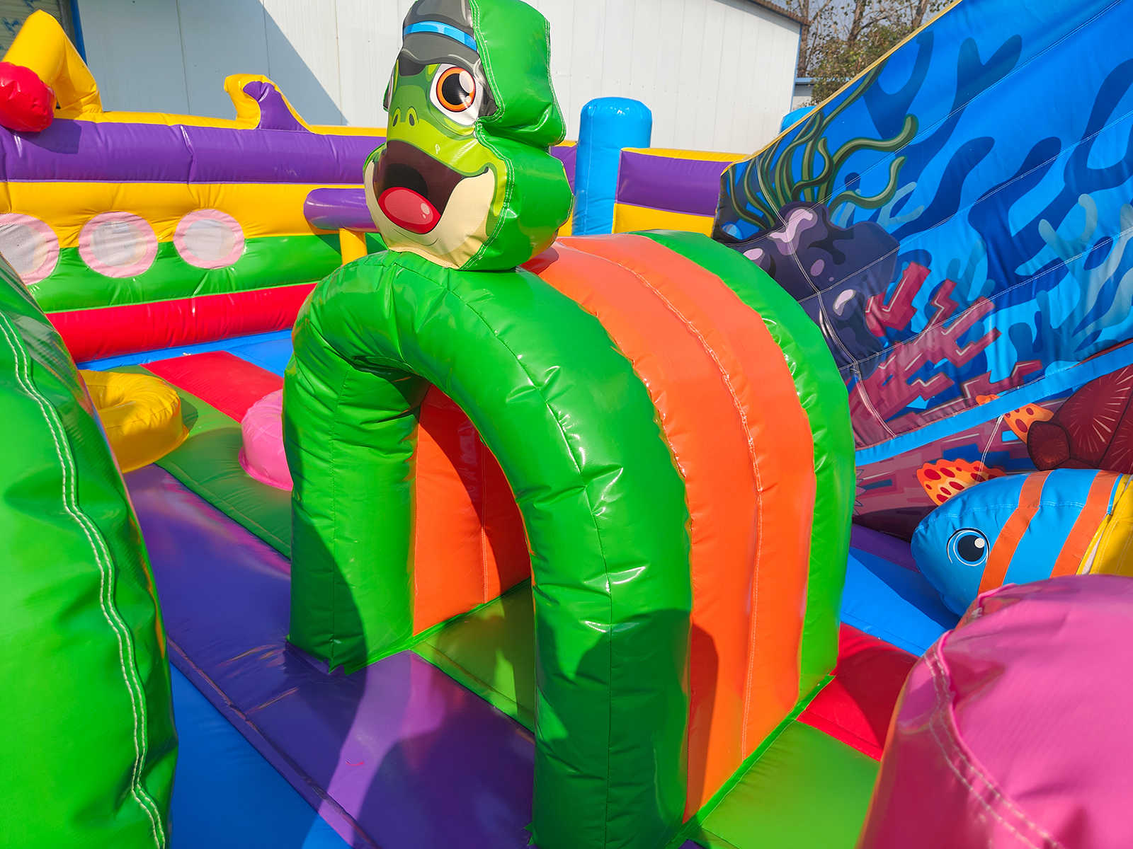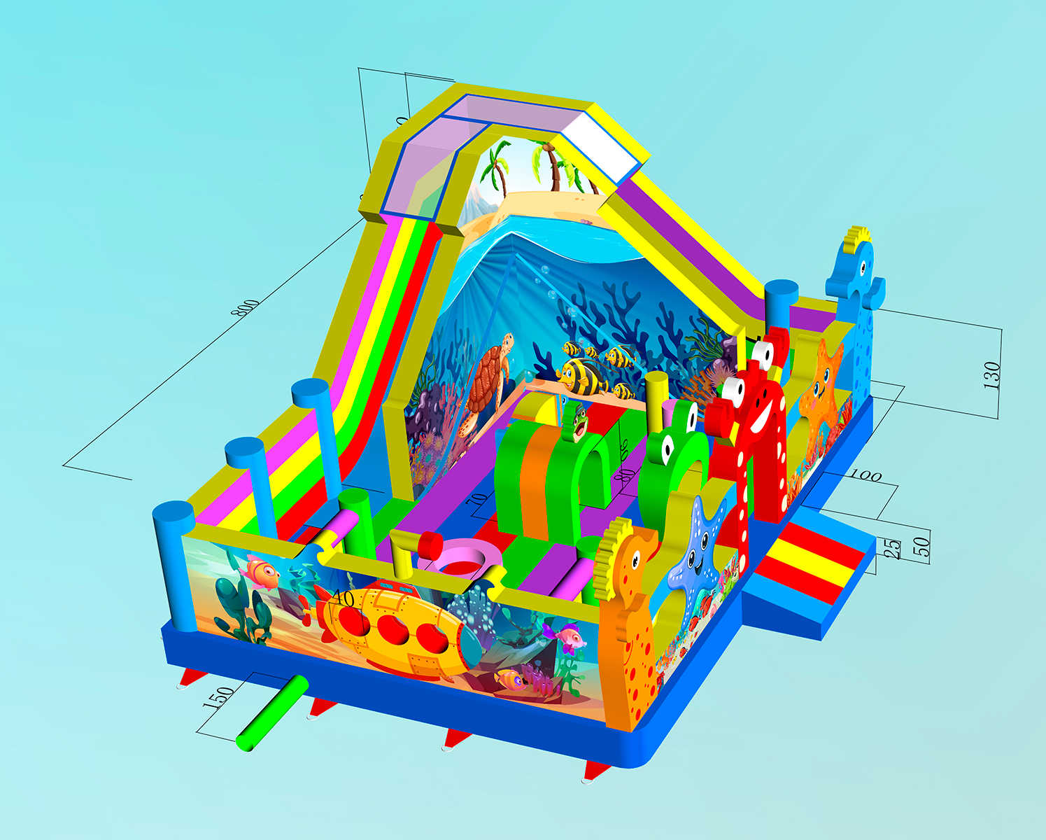 Размеры 8x6x4 метра дают достаточно пространства для комфортной игры одновременно 14 детям. Батут оснащён широкой горкой с высотой горки от земли 2,5 метра — дети могут скатываться лёжа, получая массу удовольствия! Внутри предусмотрено пространство для бега и прыжков, а оригинальные надувные элементы — морские животные, растения, яркие детали — усиливают эффект присутствия в настоящем океанском мире 🌊🐬