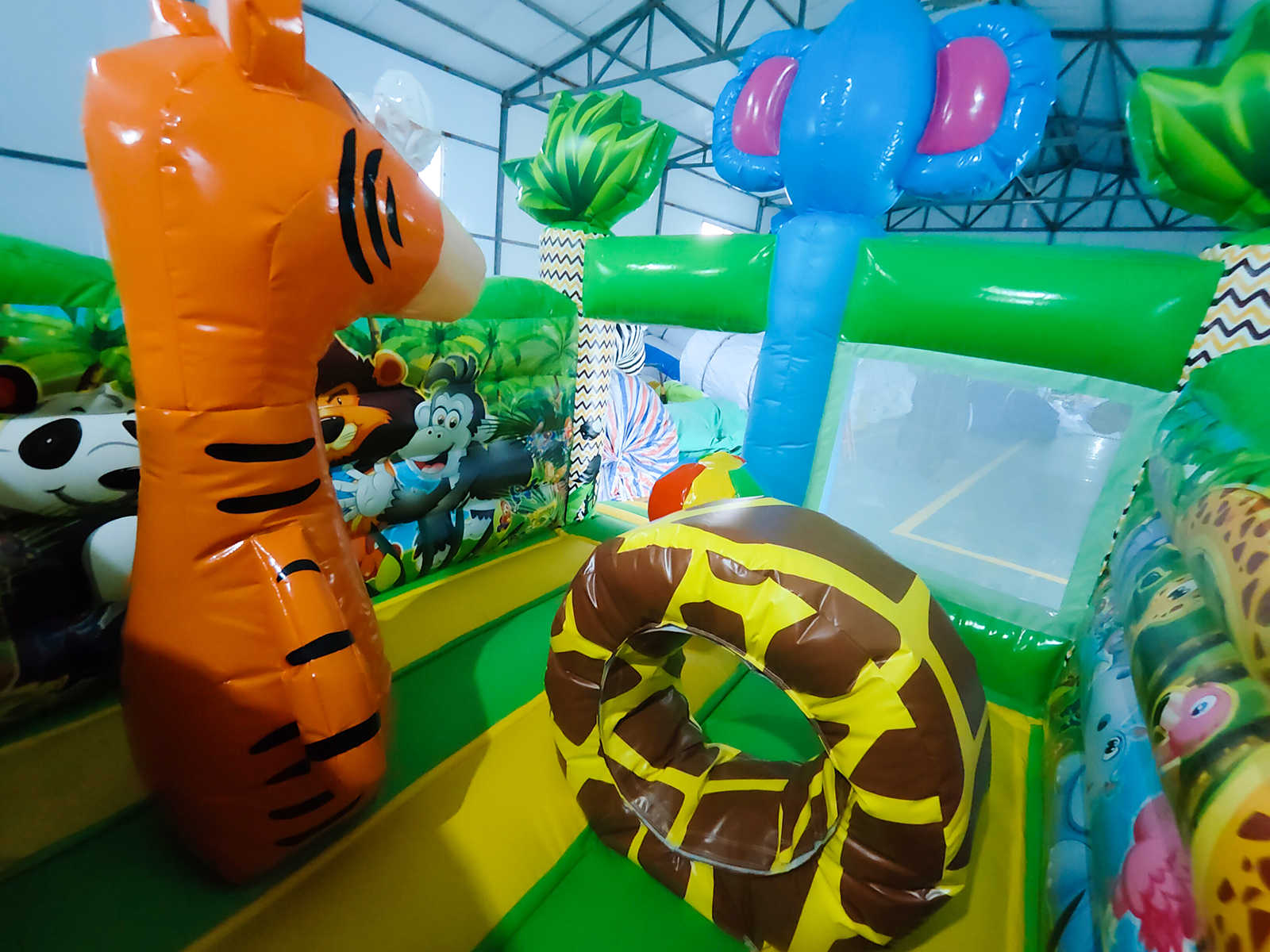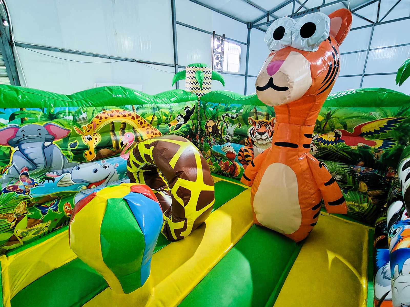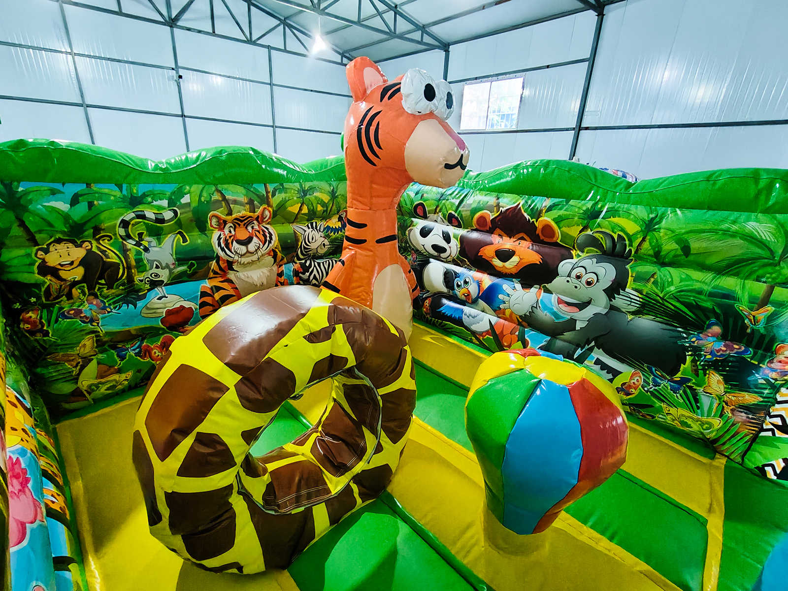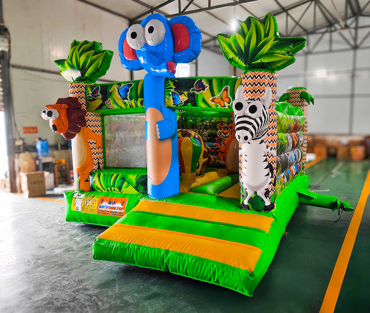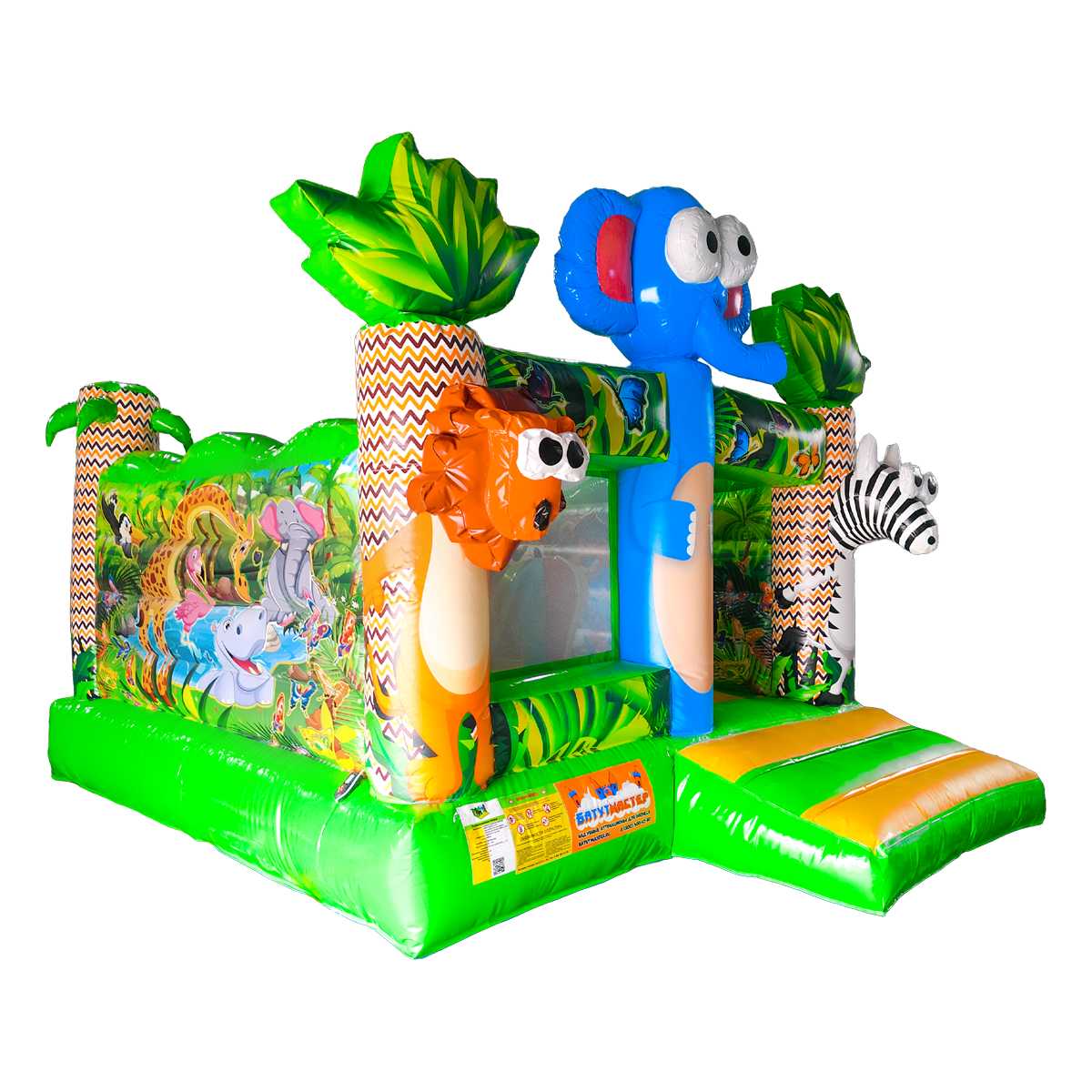 Коммерческий надувной батут «Чудо-сафари 3» — это яркий аттракцион с запоминающимся дизайном в стиле африканских джунглей. Красочные изображения и объемные 3D-фигуры животных, таких как слон, лев и зебра, превращают батут в настоящее приключение для маленьких исследователей. Пальмы, зелень и насыщенные цвета делают его визуально притягательным для детей, а для родителей — заметным издалека.