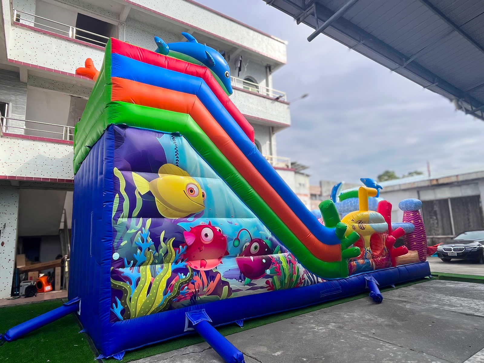 Дети могут прыгать, бегать, карабкаться, изучать «подводные тропы» и кататься с горки, каждый раз создавая свою собственную историю. Морская тематика делает этот батут особенно привлекательным: будто игра происходит в солнечном подводном саду среди сияющих кораллов.