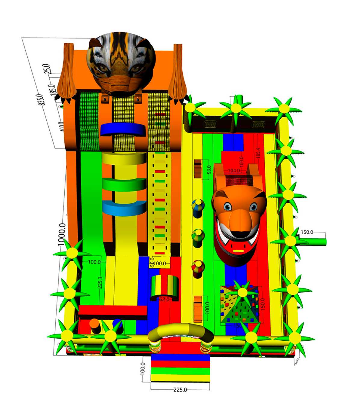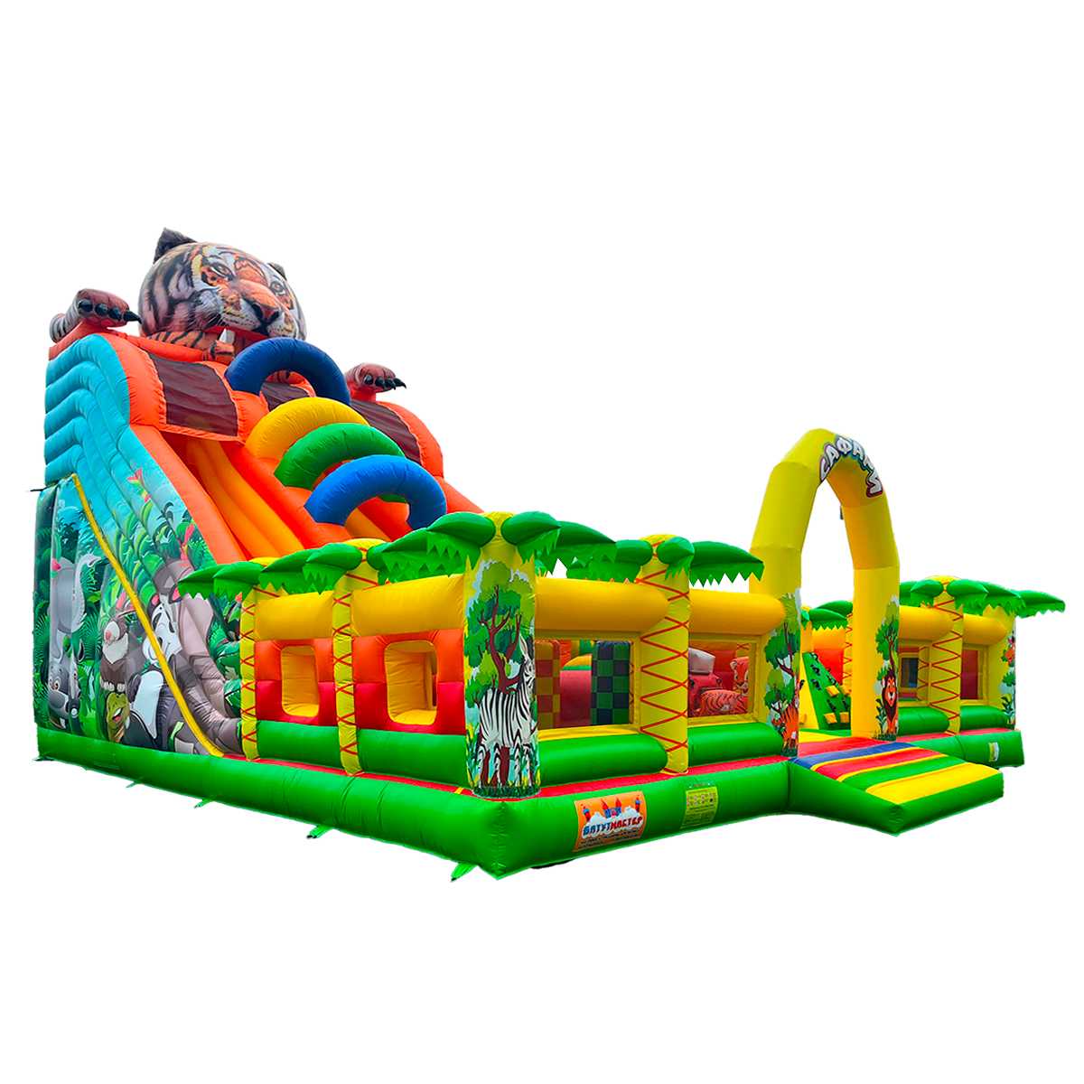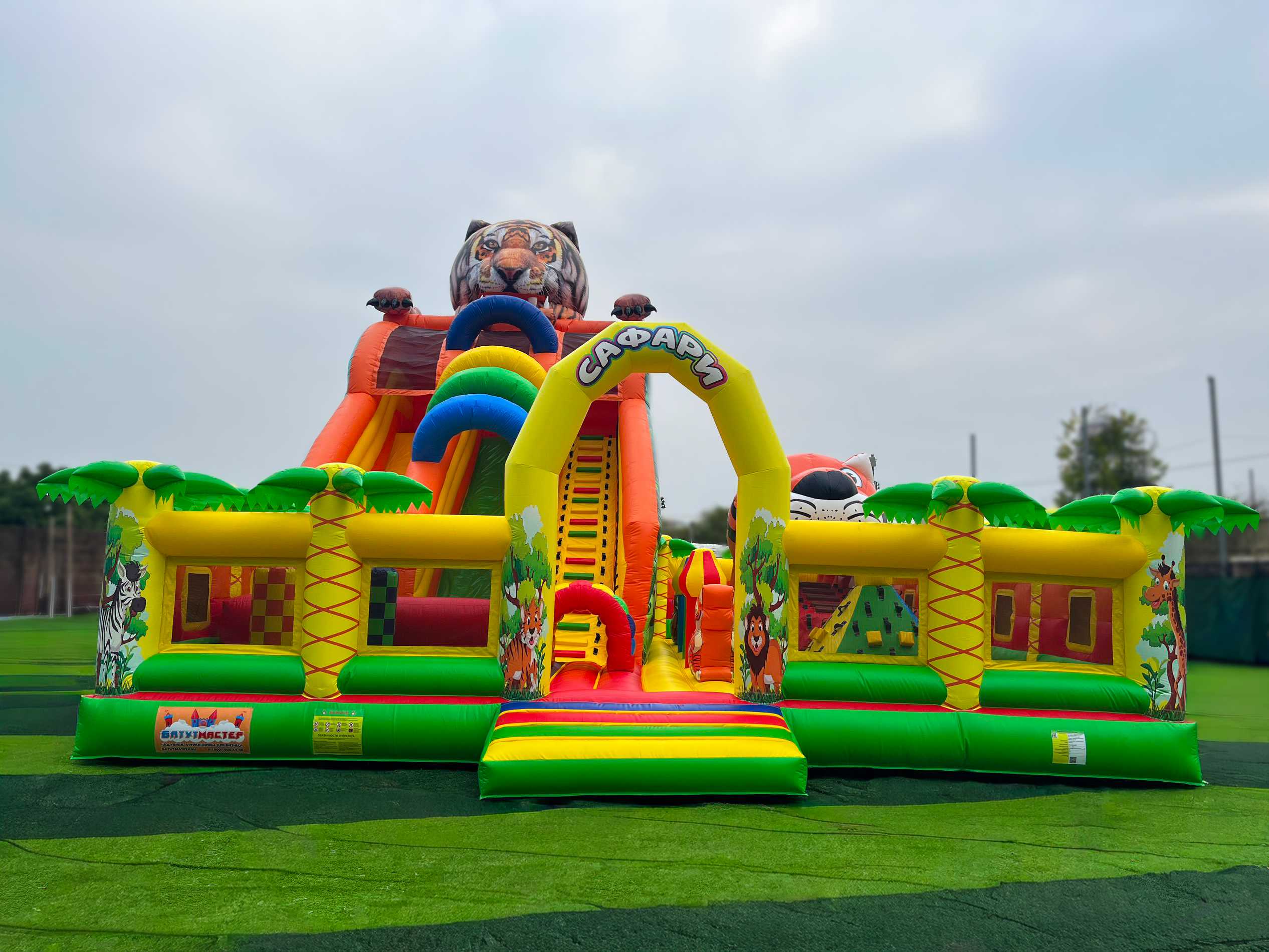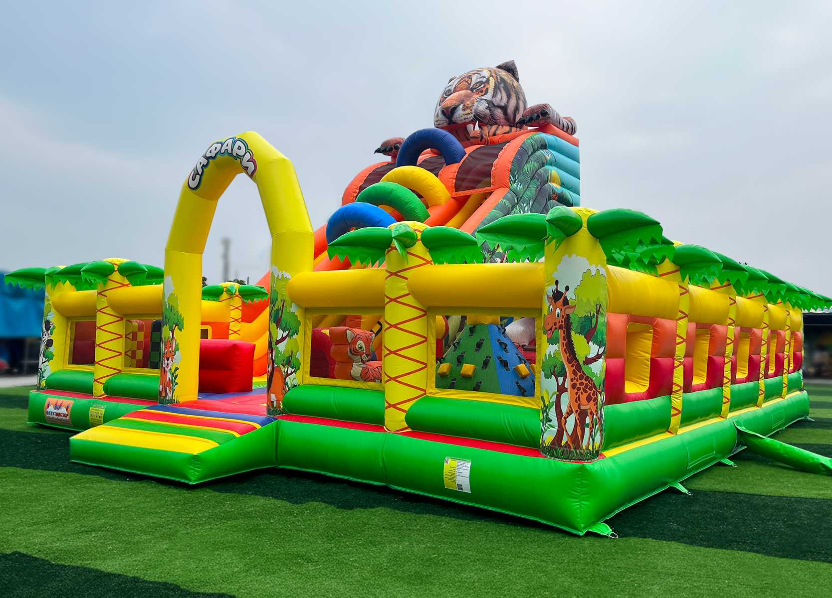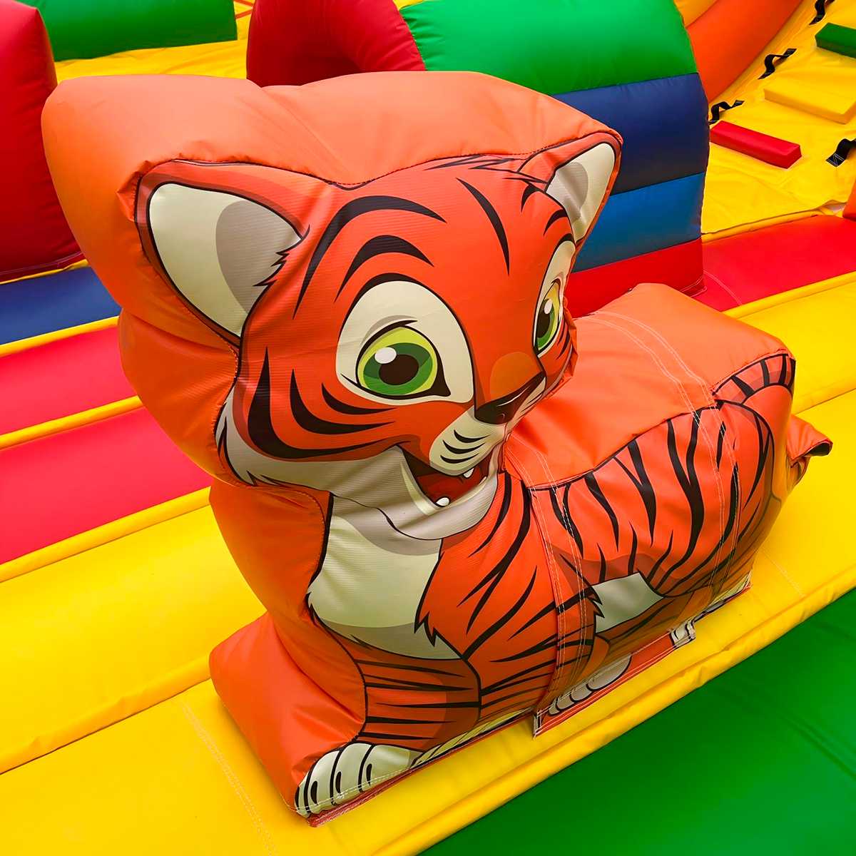 Коммерческий надувной батут «Сафари-Тигр» 10x9x8 м — это целая вселенная забавных зверей, мягких препятствий и впечатляющих горок. С первых секунд дети попадают в яркий лес, где их встречает огромная голова тигра, выглядывающая с вершины горки, а по периметру раскинулись радостные пальмы и жители саванны. Тематика «сафари» работает безотказно — дети мгновенно включаются в игру, а визуальная насыщенность притягивает внимание даже издалека.