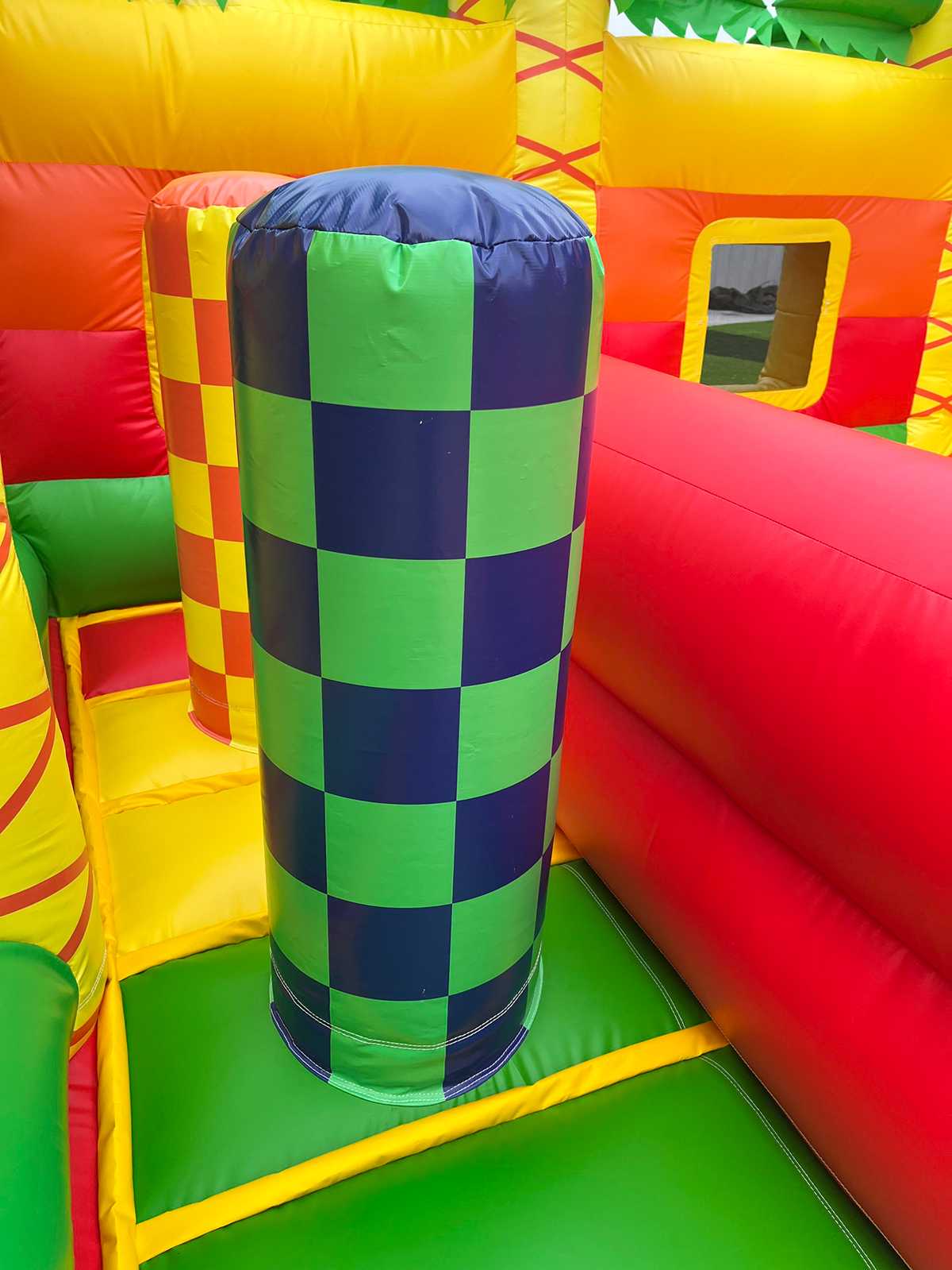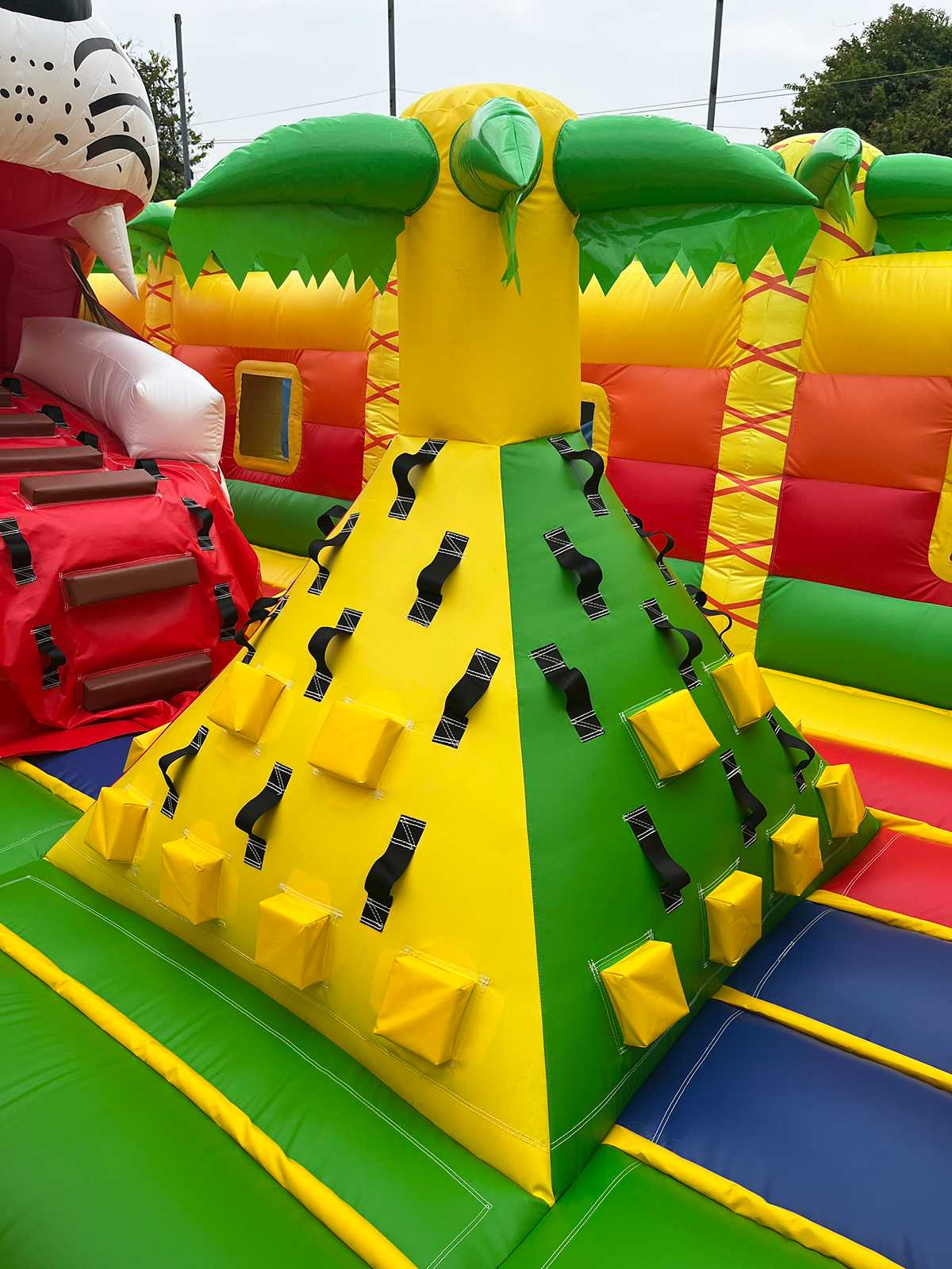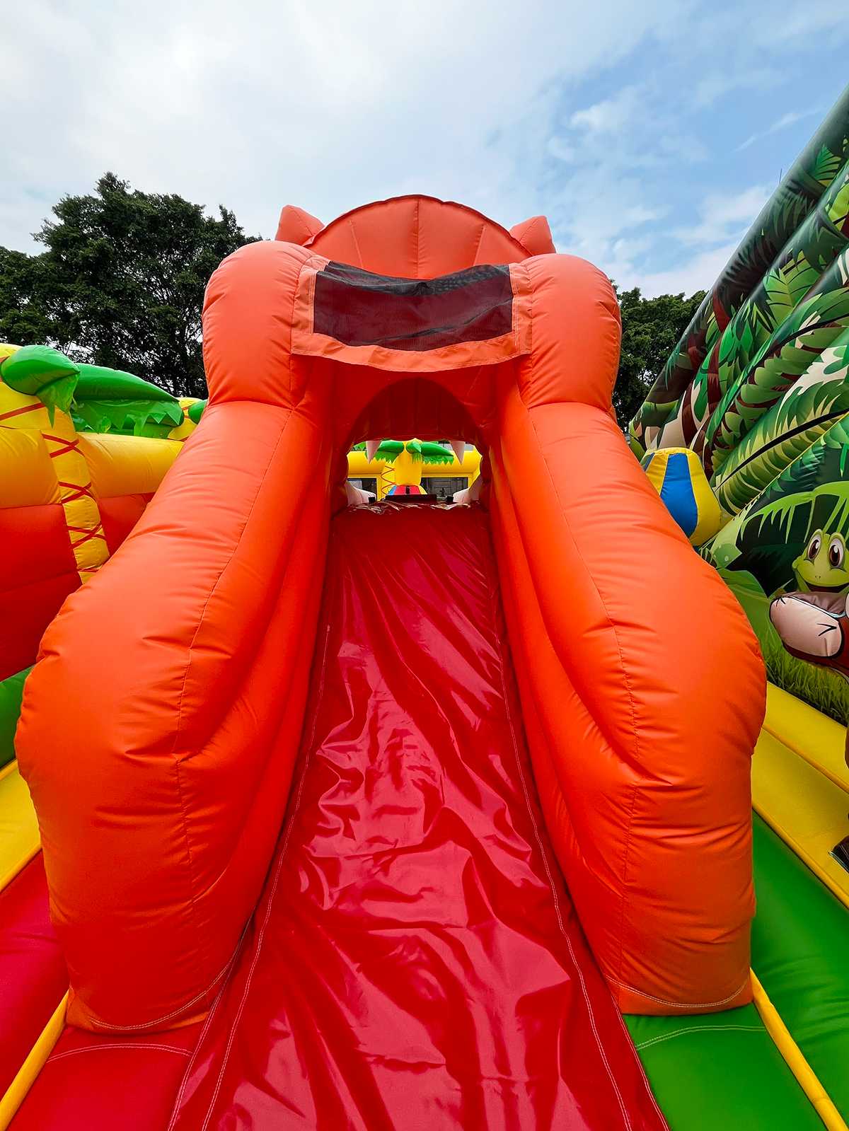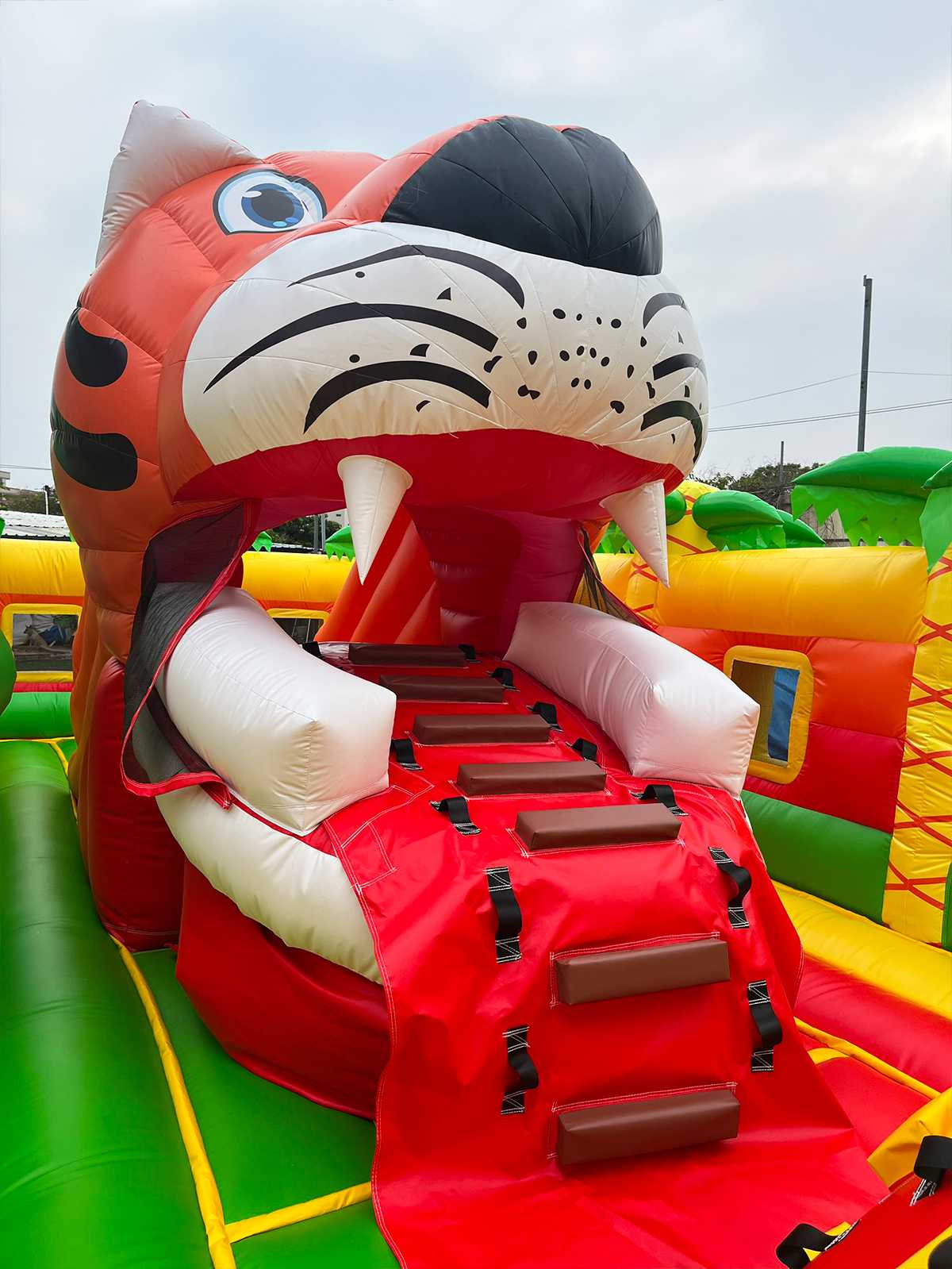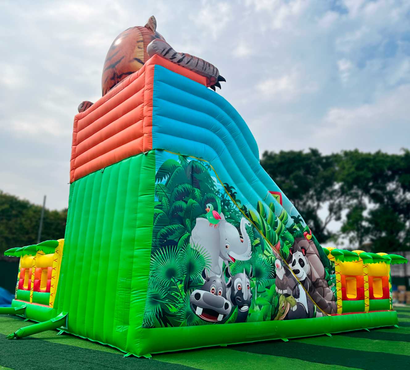 Коммерческий надувной батут «Сафари-Тигр» 10x9x8 м — это целая вселенная забавных зверей, мягких препятствий и впечатляющих горок. С первых секунд дети попадают в яркий лес, где их встречает огромная голова тигра, выглядывающая с вершины горки, а по периметру раскинулись радостные пальмы и жители саванны. Тематика «сафари» работает безотказно — дети мгновенно включаются в игру, а визуальная насыщенность притягивает внимание даже издалека.