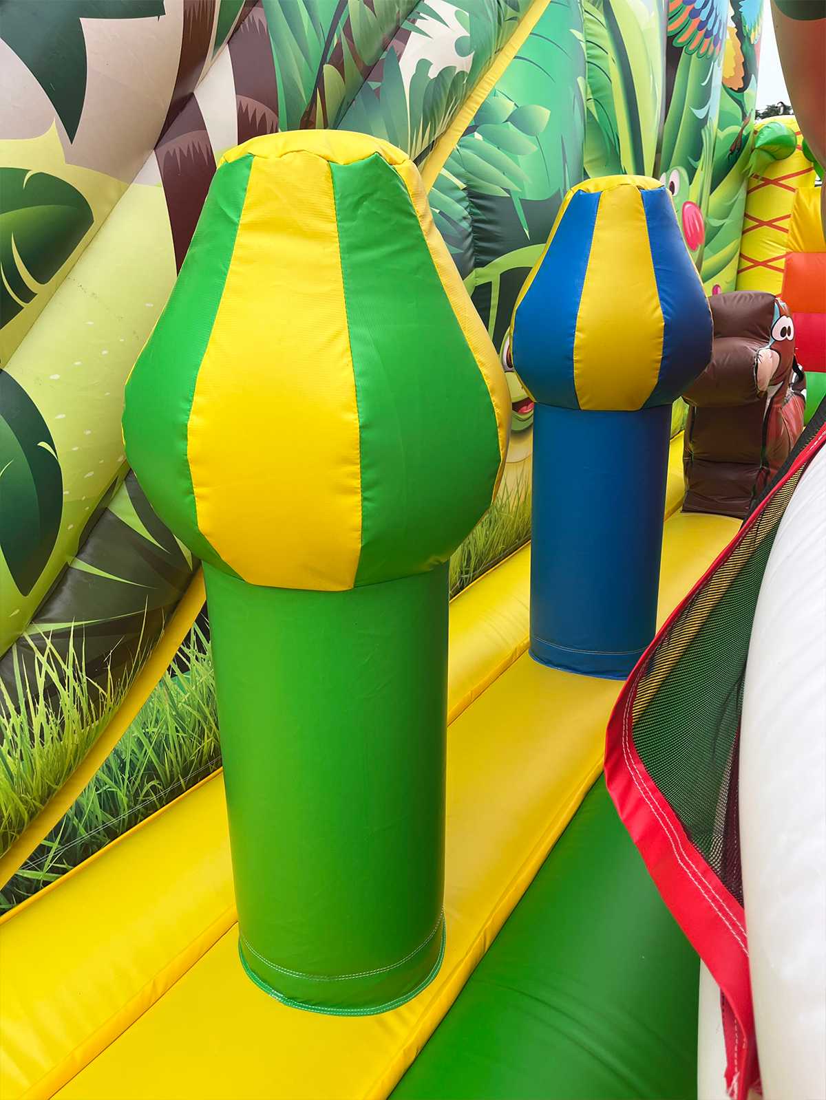 Каждый маршрут внутри аттракциона становится маленьким приключением: ребёнок может подняться по лестнице, пройти под аркой, проскочить между мягкими столбиками и завершить путешествие эффектным спуском с горки. Тематика джунглей делает игру эмоционально насыщенной — будто дети попали в солнечный заповедник, полный удивительных существ.