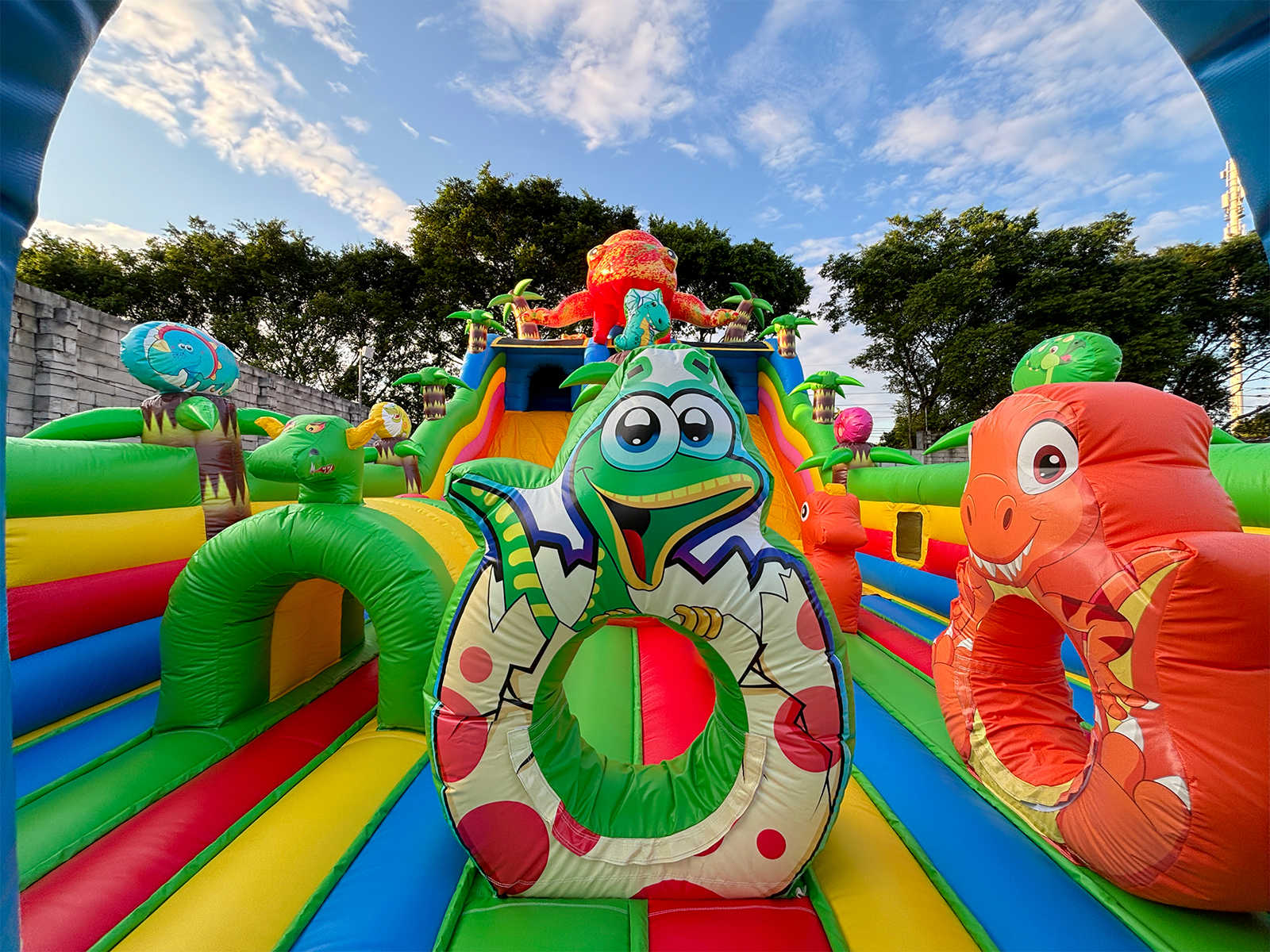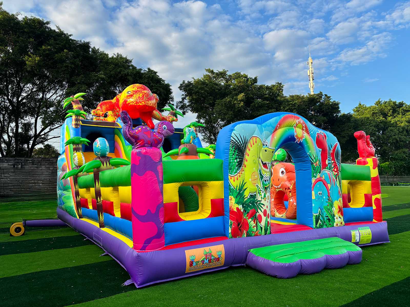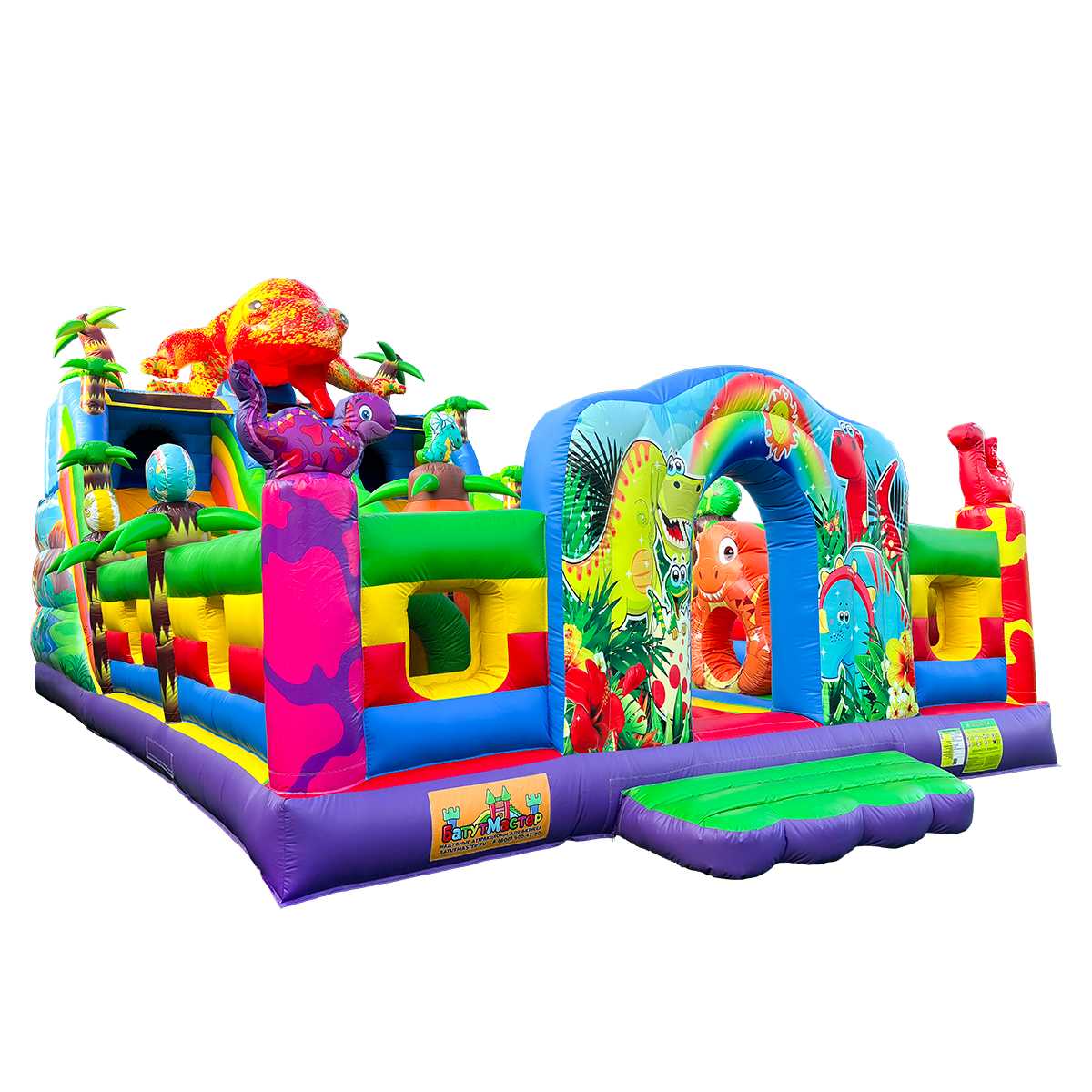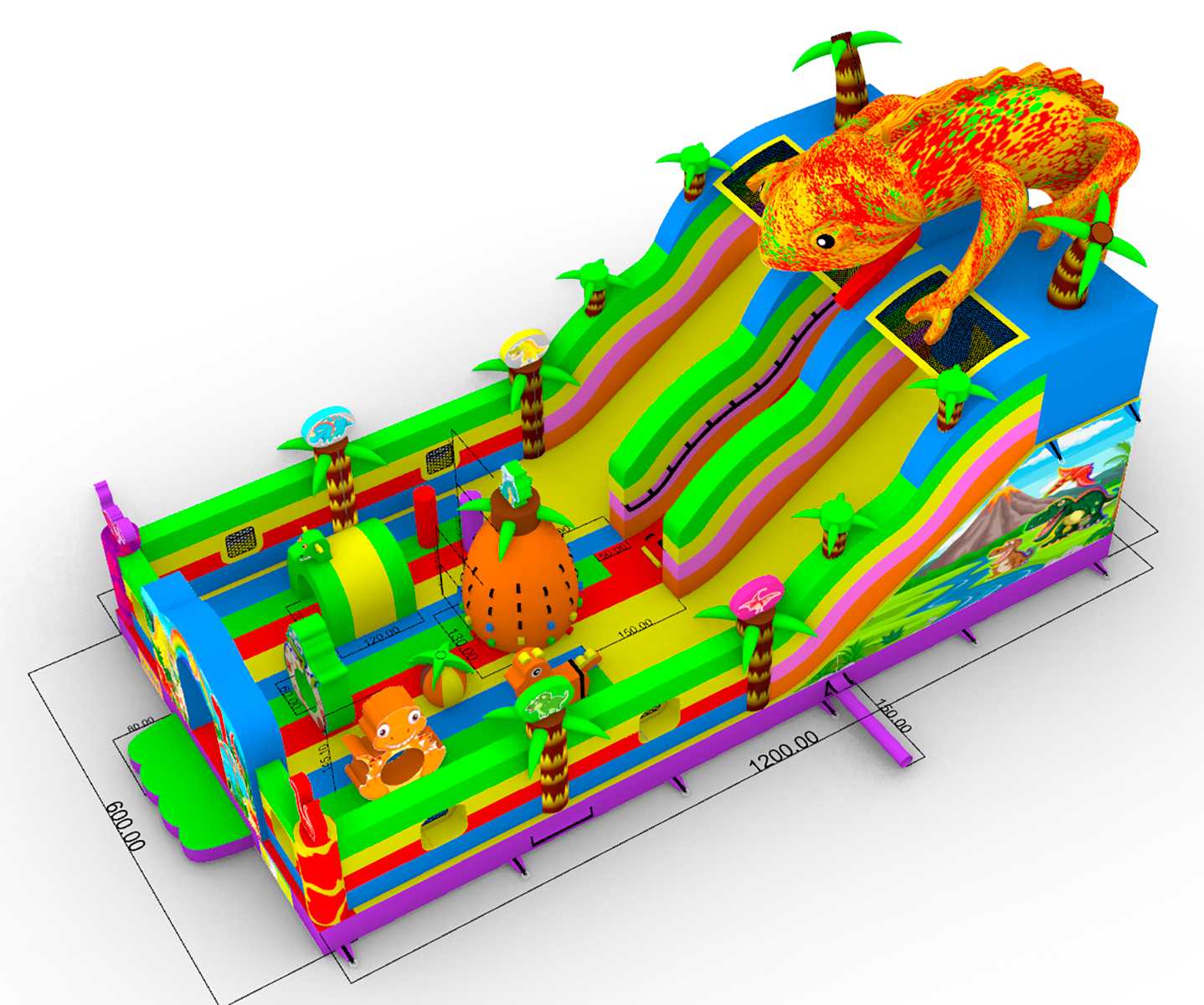 Погрузитесь в яркий и захватывающий мир динозавров с надувным батутом "Хамелеон и динозавры Ультра 3" размером 12x6x6 м! Этот коммерческий батут создан для бизнеса, который стремится выделиться и привлечь максимум внимания на массовых мероприятиях. На вершине игровой зоны, прямо над горкой, гордо возвышается огромный красочный хамелеон — символ яркости, перемен и веселья! Он словно охраняет вход в мир приключений и сразу притягивает внимание детей и родителей.