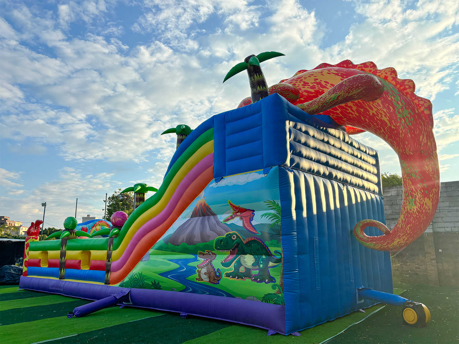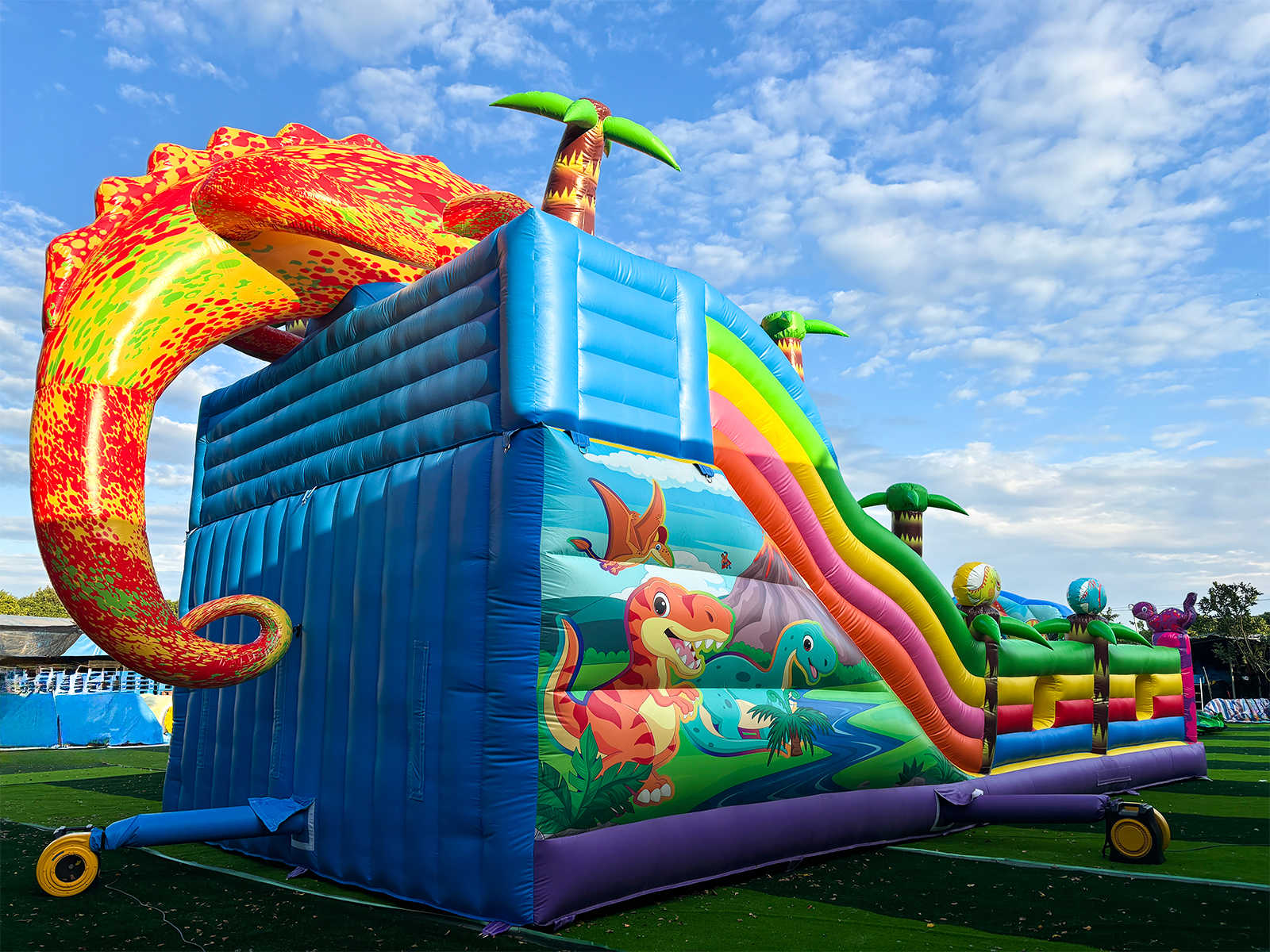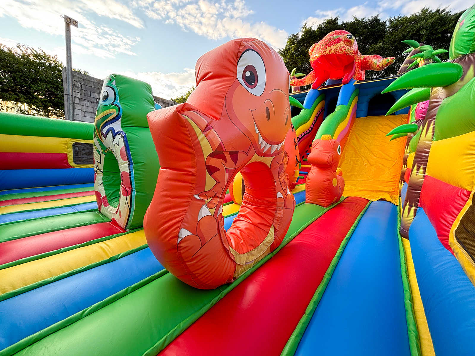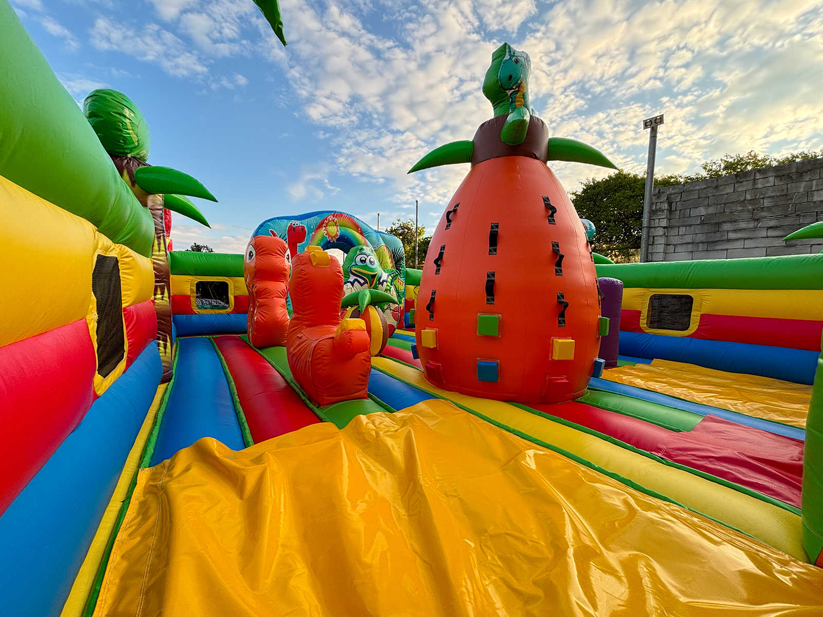 Погрузитесь в яркий и захватывающий мир динозавров с надувным батутом "Хамелеон и динозавры Ультра 3" размером 12x6x6 м! Этот коммерческий батут создан для бизнеса, который стремится выделиться и привлечь максимум внимания на массовых мероприятиях. На вершине игровой зоны, прямо над горкой, гордо возвышается огромный красочный хамелеон — символ яркости, перемен и веселья! Он словно охраняет вход в мир приключений и сразу притягивает внимание детей и родителей.