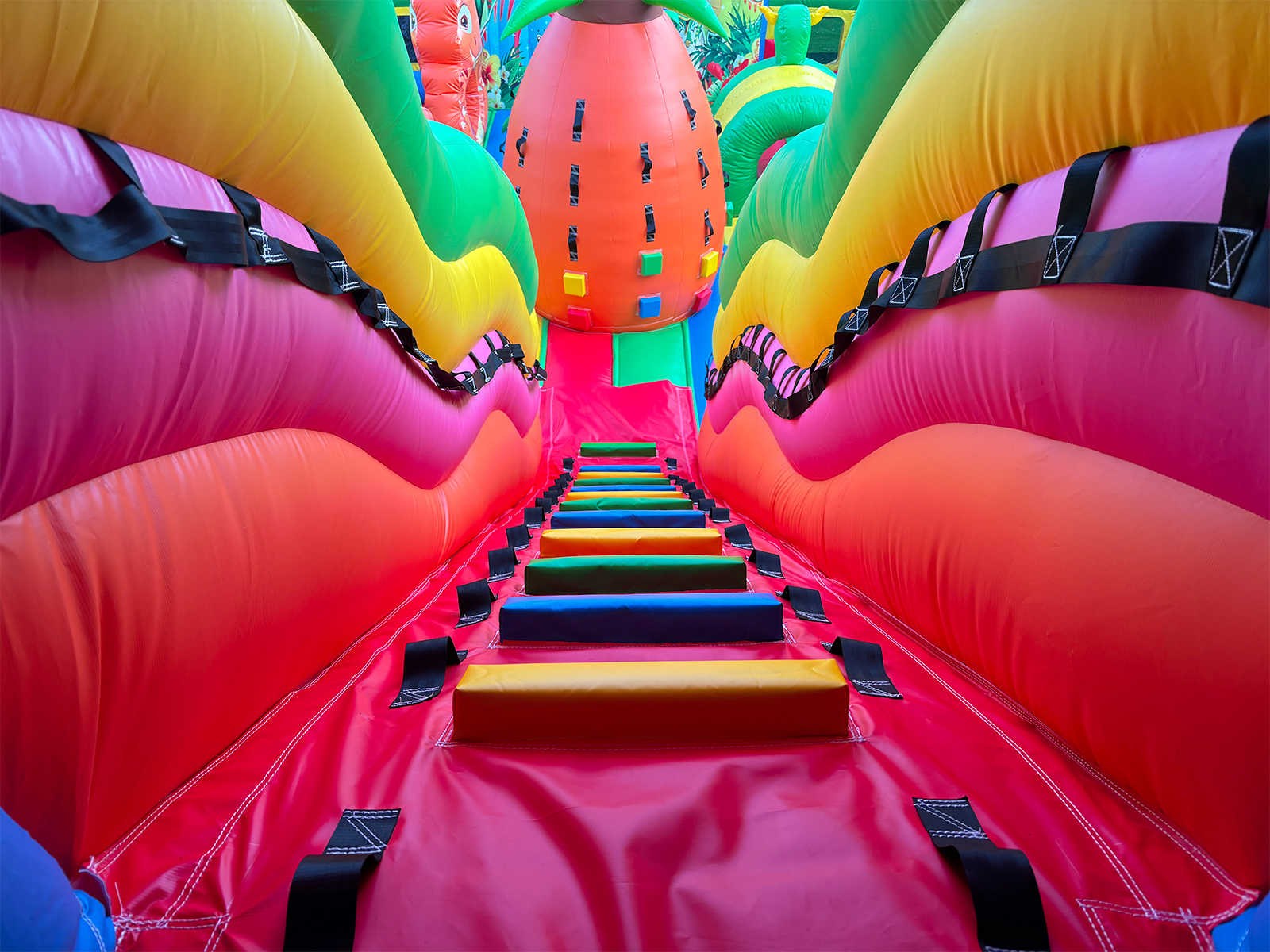 Размеры 12x6x6 м и вместимость до 21 ребёнка одновременно обеспечивают высокую пропускную способность. На праздниках, фестивалях и в торговых центрах вы сможете собирать толпы довольных малышей и их родителей. Материал усиленного ПВХ (690 г/м²) с толщиной 0,55 мм гарантирует прочность и износостойкость аттракциона даже при интенсивной эксплуатации. Батут легко выдерживает перепады температур от -15 до +65 °C и отлично подходит для работы на открытом воздухе и в помещениях.