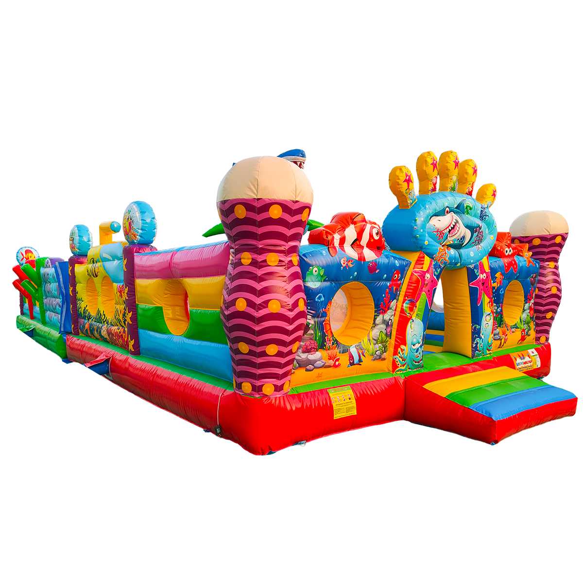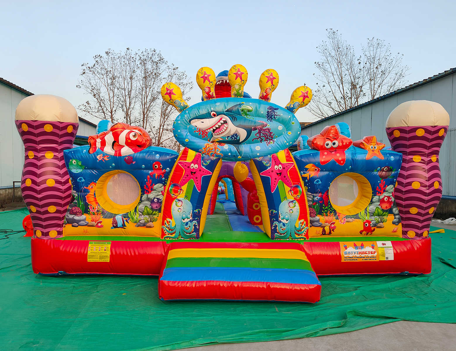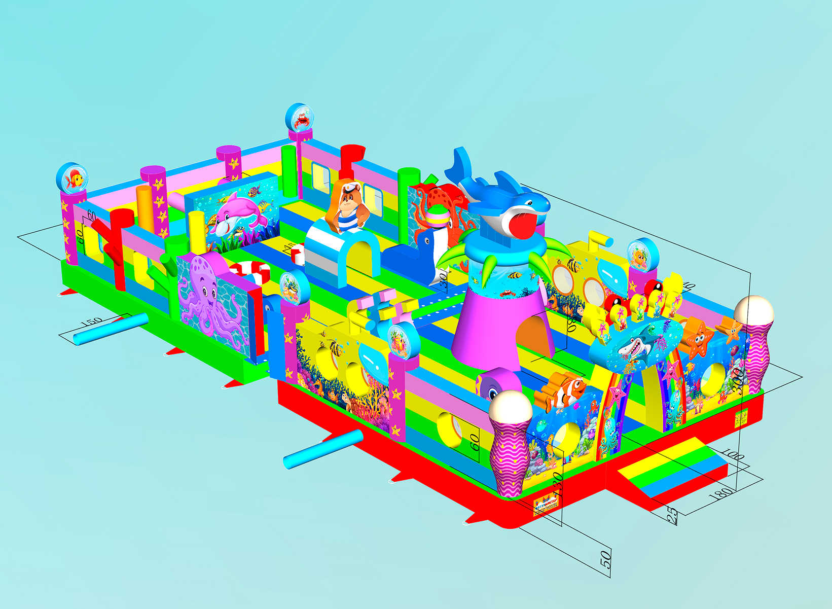 Коммерческий надувной батут «В гостях у моря» 12x6x3,5 м — это уникальный аттракцион, сочетающий морскую тематику с элементами футуристичных персонажей. Тут привычные обитатели глубин предстают в необычном стиле: осьминоги, рыбы и хищные акулы со стальным блеском будто охраняют вход в удивительный подводный город. Такое сочетание природных образов и фантазийных технологий моментально привлекает внимание детей, формируя особую атмосферу таинственного приключения.