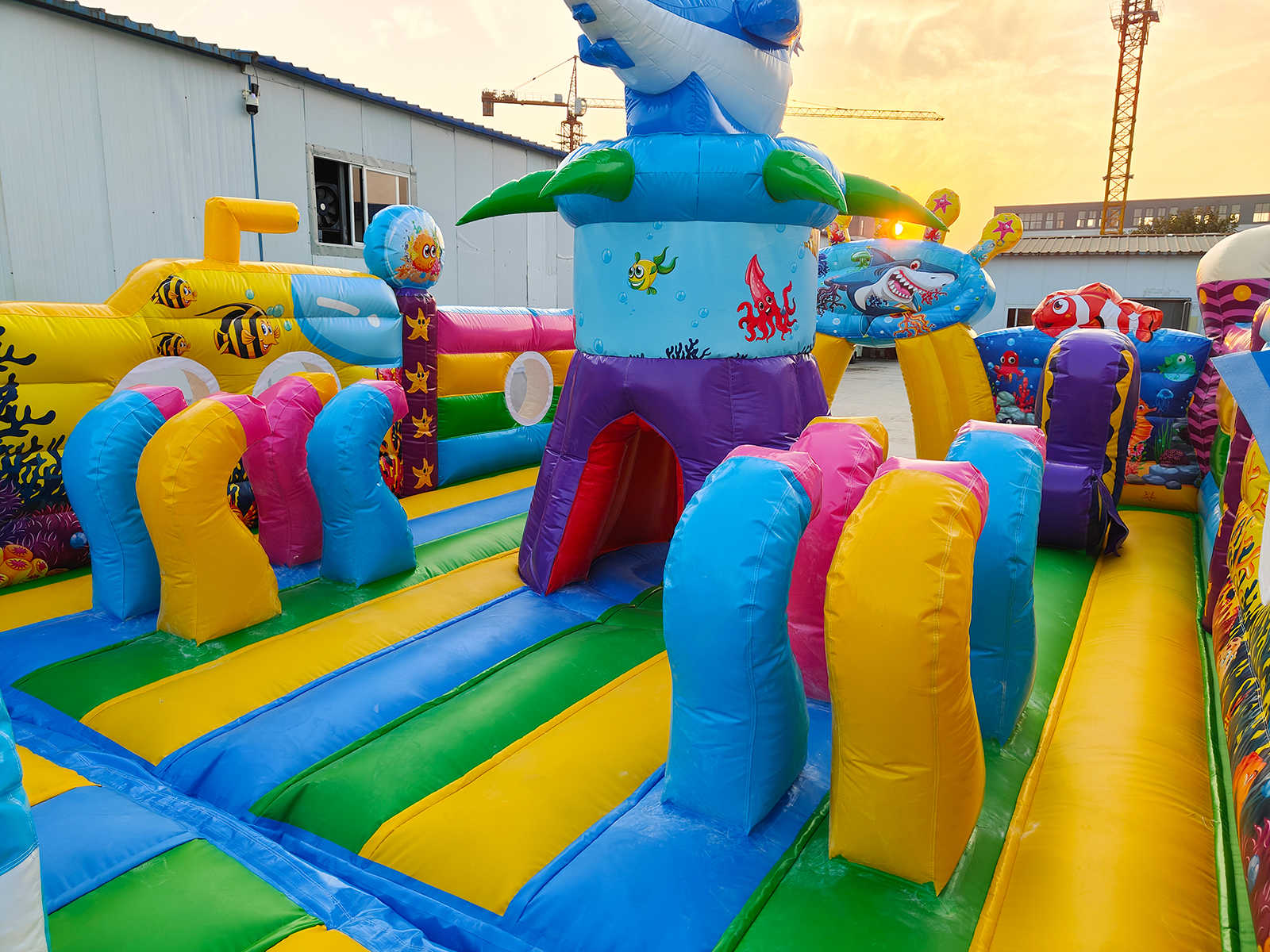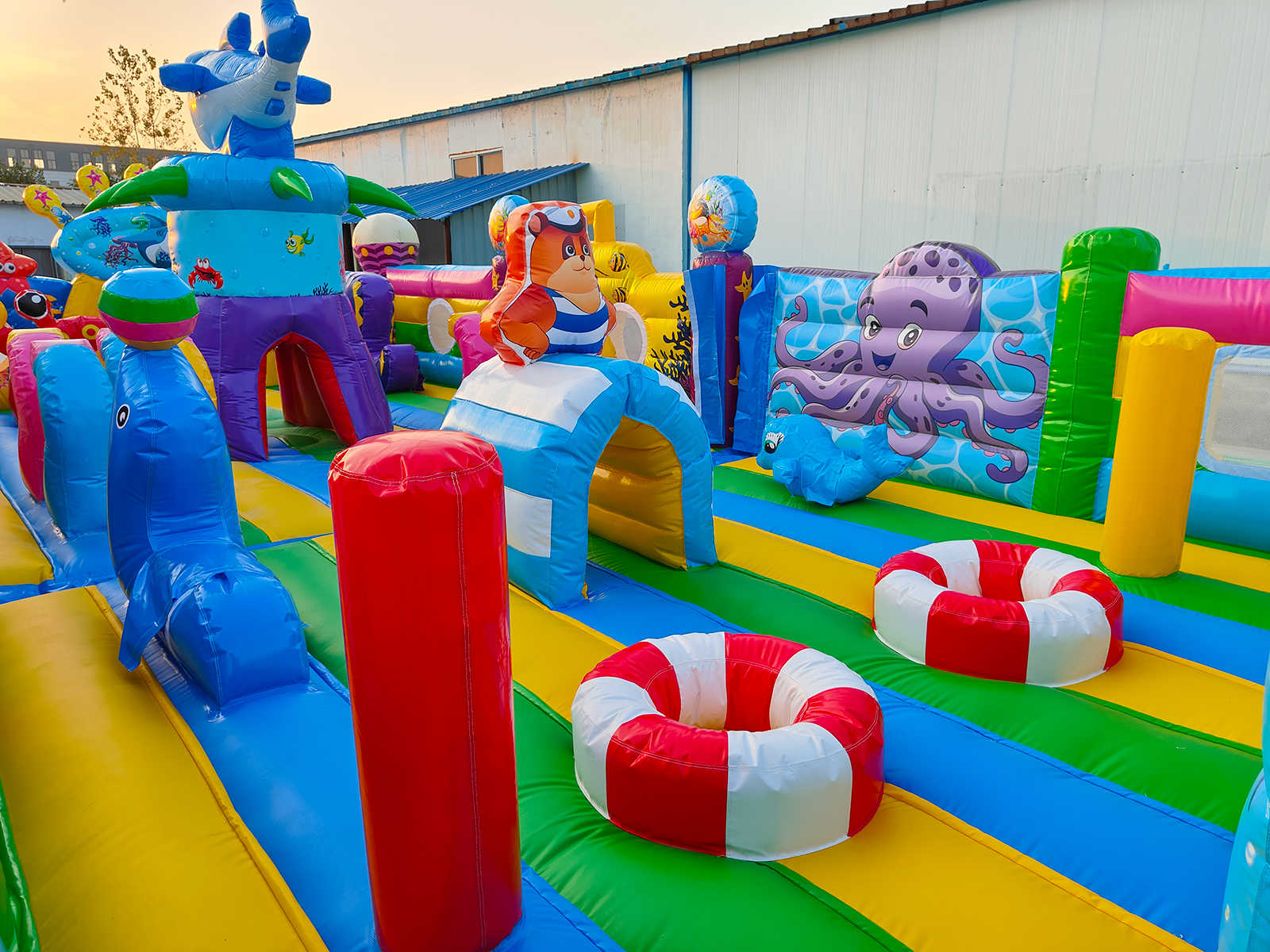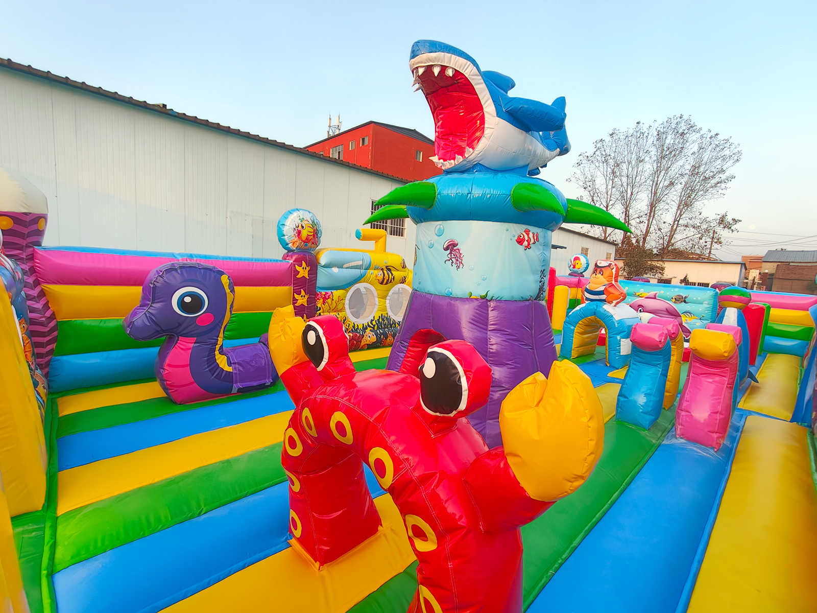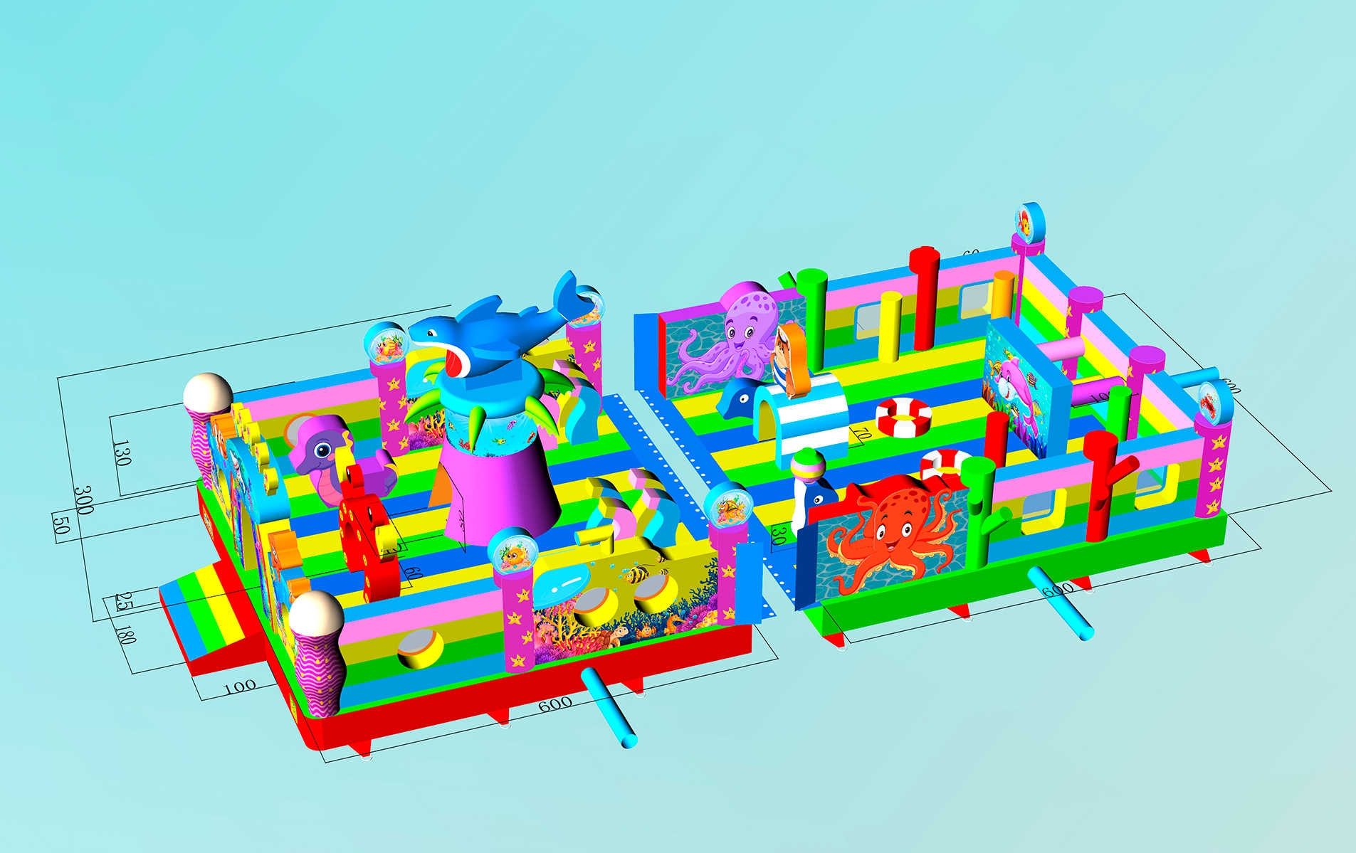 Коммерческий надувной батут «В гостях у моря» 12x6x3,5 м — это уникальный аттракцион, сочетающий морскую тематику с элементами футуристичных персонажей. Тут привычные обитатели глубин предстают в необычном стиле: осьминоги, рыбы и хищные акулы со стальным блеском будто охраняют вход в удивительный подводный город. Такое сочетание природных образов и фантазийных технологий моментально привлекает внимание детей, формируя особую атмосферу таинственного приключения.