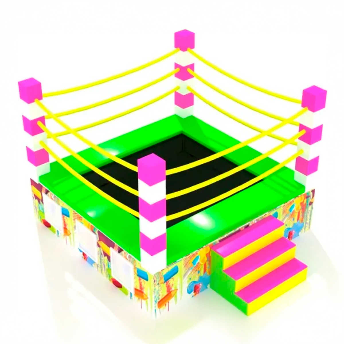 «Чемпион» — это не просто батут, а целая игровая концепция. Его оформление под боксёрский ринг с яркими канатами, угловыми стойками и «боевым» дизайном сразу же вызывает восторг у детей и внимание у родителей.