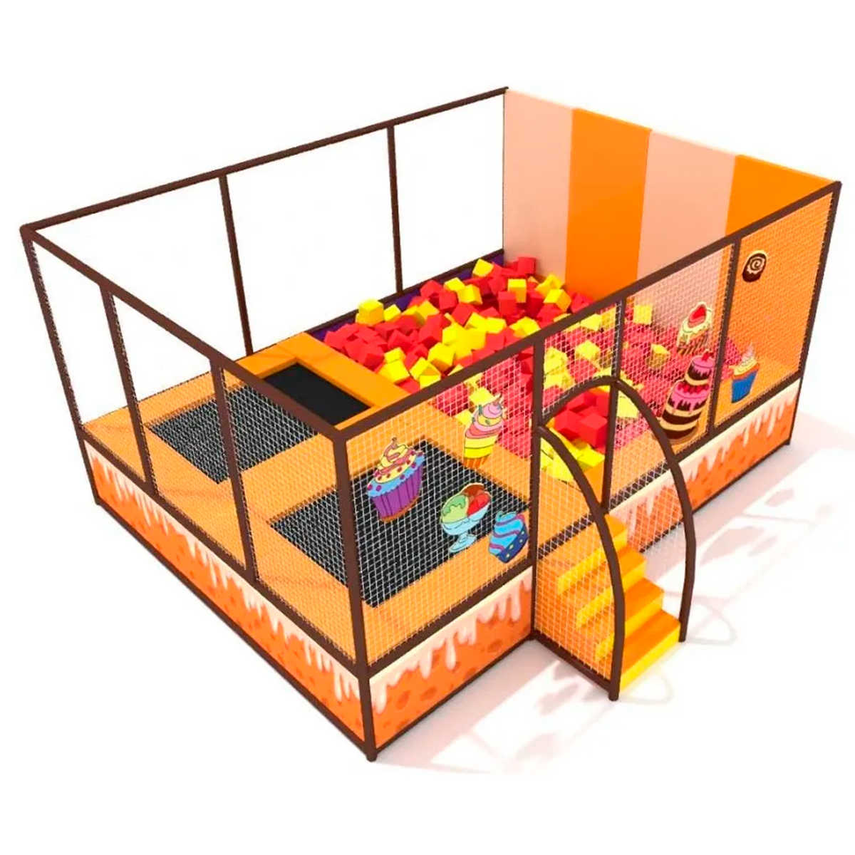 «Карамельное настроение» — это яркий батутный комплекс, выполненный в тёплых карамельно-оранжевых тонах, с аппетитными изображениями кексов, мороженого и сладостей. Дети обожают его с первого взгляда — здесь каждый элемент словно из волшебной кондитерской!